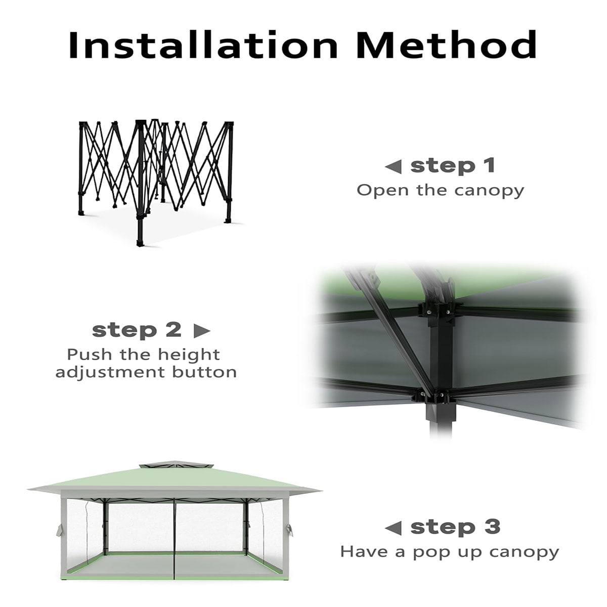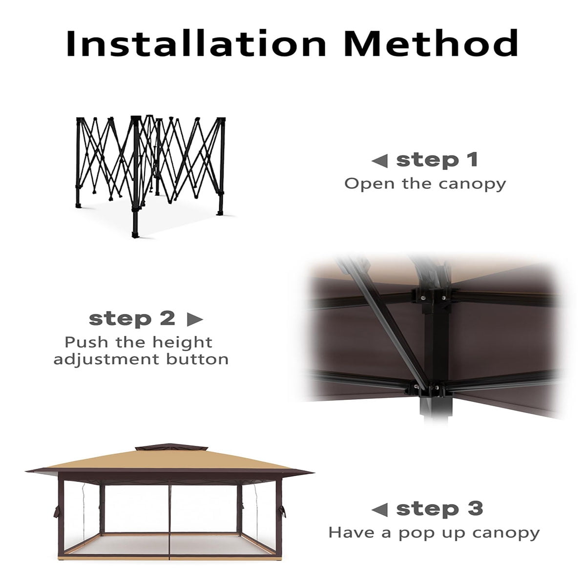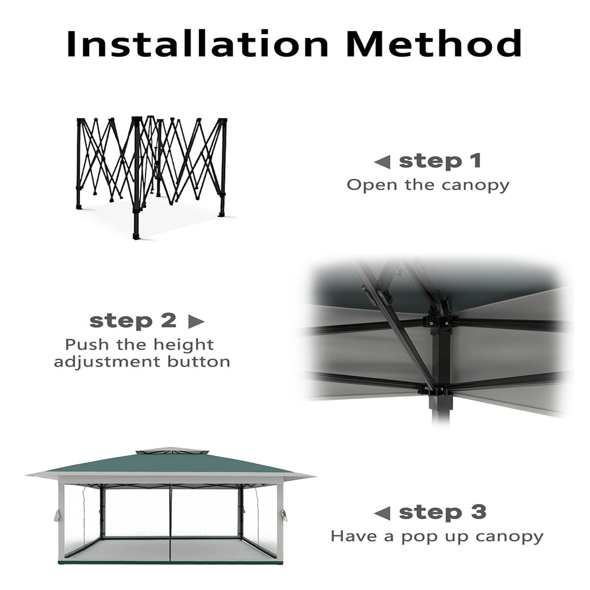 • Easy to Install:Our gazebo is designed for easy installation, Simply unfold the frame, attach the canopy cover,secure the corners, and extend the legs.With just 1-2 people,you can quickly build your outdoor tent, making it a convenient option for any outdoor event