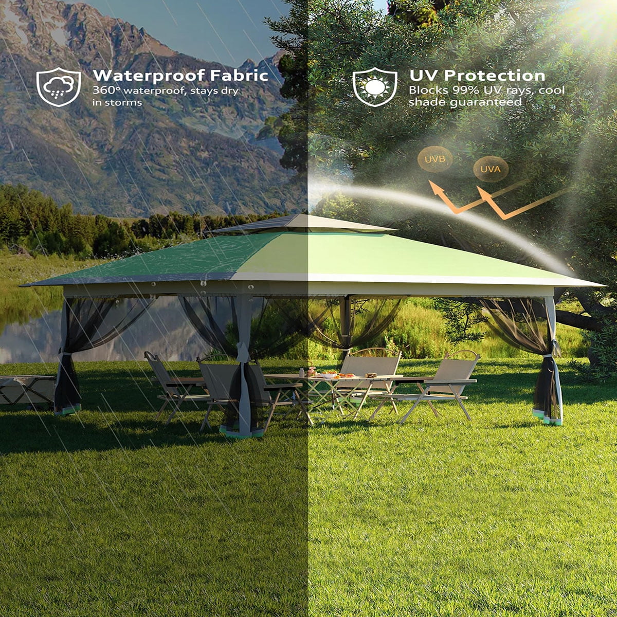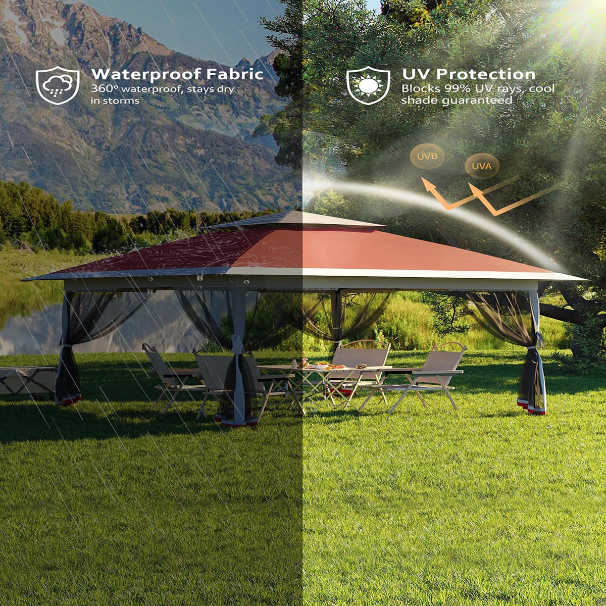 • Material: Enjoy silver plated PU lining with UPF 50+ UV protection in our Outdoor patio gazebo,keeping you safe from the sun’s harmful rays.The waterproof and sun-proof material, along with high-quality mosquito nets, provide excellent protection while maintaining visibility and airflow