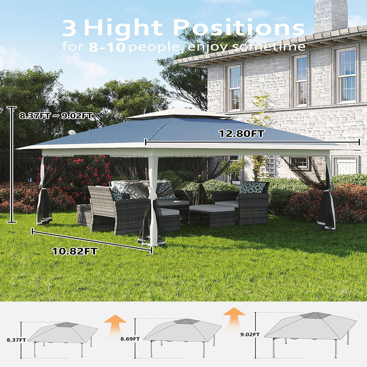 Ataucjin 13×13 Gazebo, Outdoor Canopy Tent with Mosquito Net, Height Adjustable Canopy Gazebo, Large Shade Tent for Camping, Lawn, Backyard, Garden, Patio