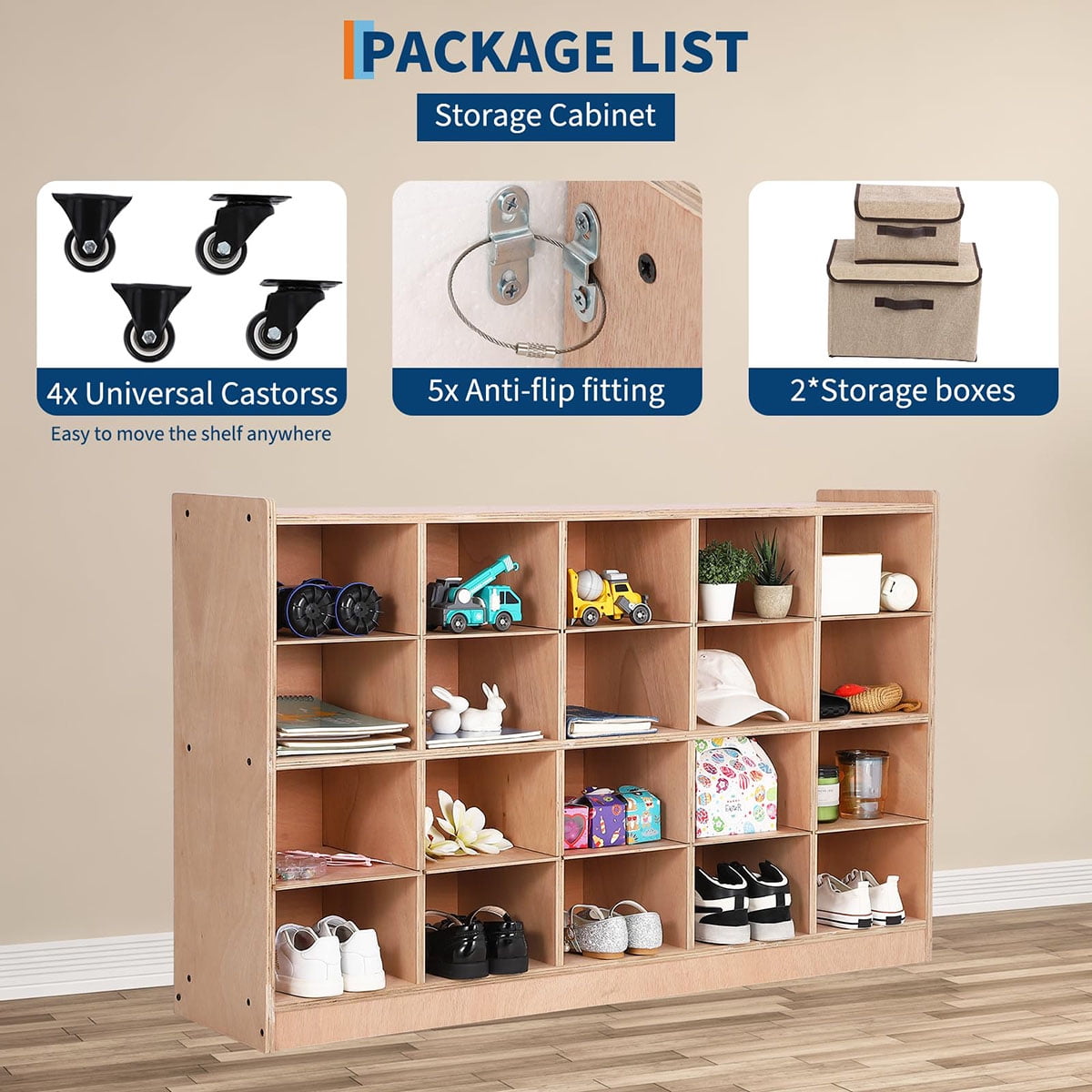Ataucjin 5-Section Classroom Coat Locker, 20 Cubbies for Classrooms, Daycare Cubby with 4 Casters, 5 Hooks and 2 Storage Boxes, for Home, School, Kindergarten