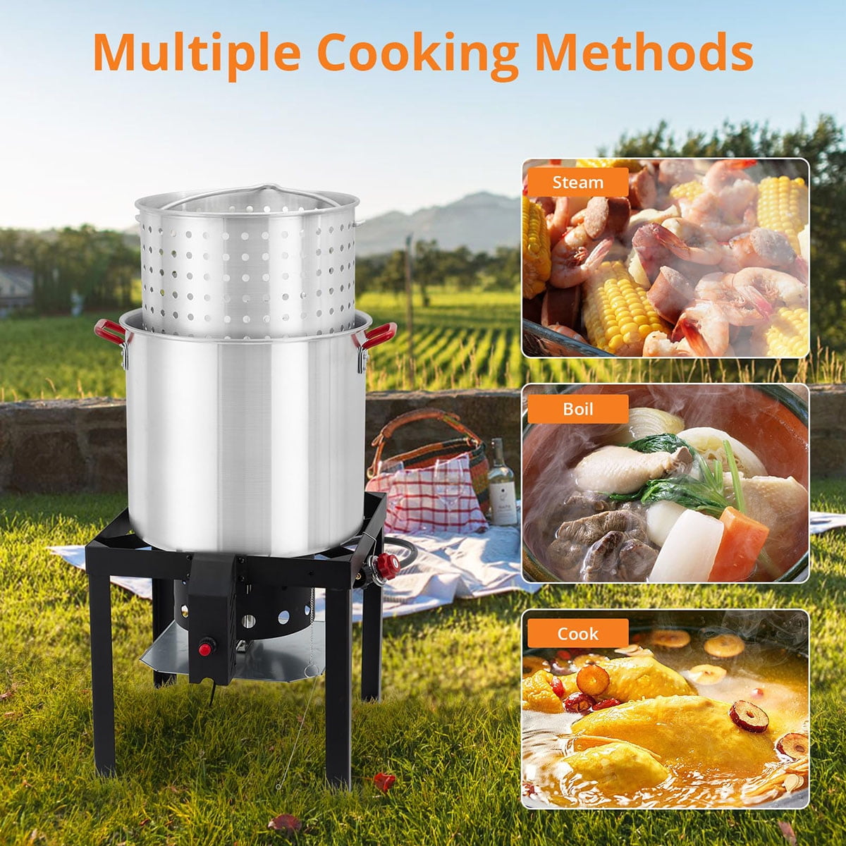 - 60 QT Large Capacity: The 60-quart seafood boil pot and steamer basket are primarily designed to fry large portions of seafood and cook shrimp. This outdoor seafood boiler crawfish pot set is also perfect for frying fish, chips, steaming tamales, chicken nuggets, and more. It’s ideal for outdoor camping, and it’s also great for Christmas and Thanksgiving! Its ample size makes it ideal for backyard parties, camping trips, and other outdoor activities.