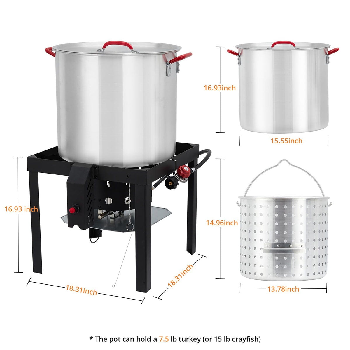 - All-in-One-Seafood Boil Pot: This outdoor turkey deep fryer kit offers versatility as it can be used not only for frying various foods but also for boiling seafood. Its simple structure requires minimal assembly. Just assemble the parts for the cast iron burner and set it up. This complete set includes 1* 60Qt Aluminum Pot with a lid, 1* Gas Stove Burner Stand with a Hose and Regulator, 1* Support Rack, 1* Baskets
