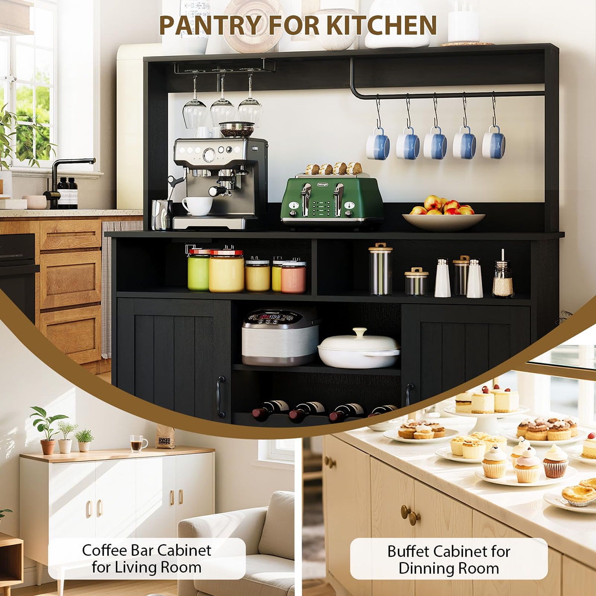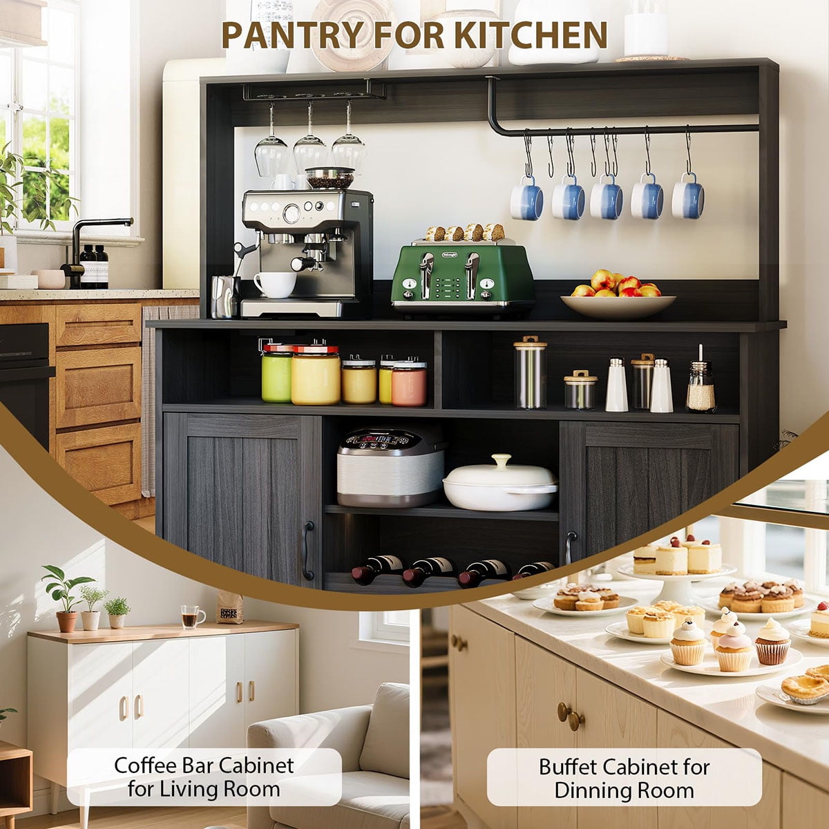 - Multi-Functional Use: Use it as a kitchen hutch cabinet with doors, a dining room sideboard buffet, a coffee station, or liquor cabinet. Its versatile style fits seamlessly in the living room, dining area, or as a corner coffee bar for entertaining guests