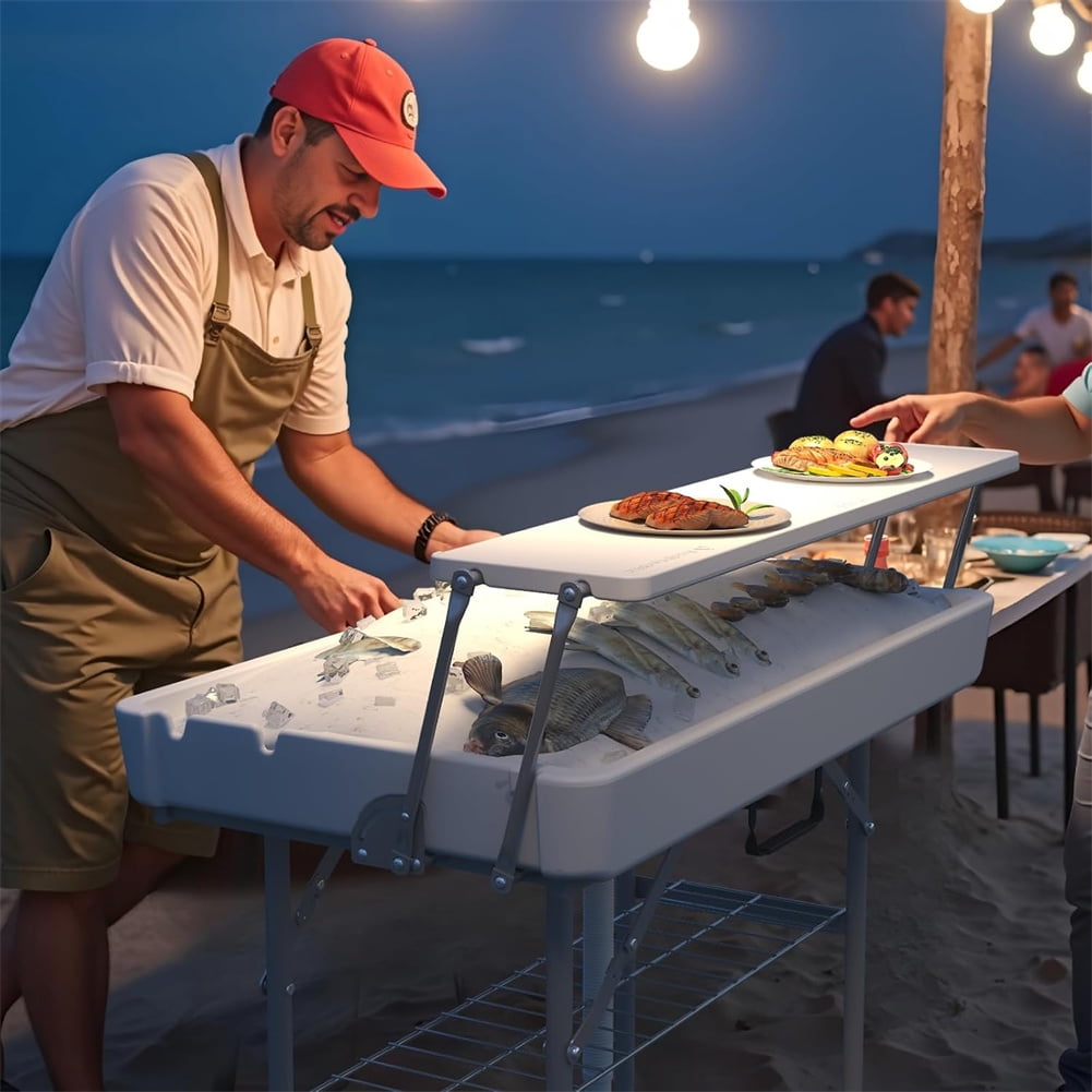 • 【Two-Tier Ice Cooler Table】–This double-tier ice table provides ample storage space to store wine glasses, fruits, snacks, etc. The top bracket can be used to place party food or cups that do not need to be refrigerated, and the table groove can be used as an ice storage for food coolers.