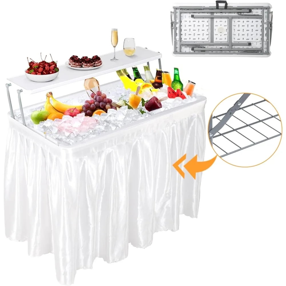 Ataucjin Outdoor Ice Cooler Folding Table with Drain, Two-Tier Ice Tables with Removable Skirt and Extra Storage Shelf, Indoor Outdoor Use for Events, Parties, Wedding, Camping, BBQ, White