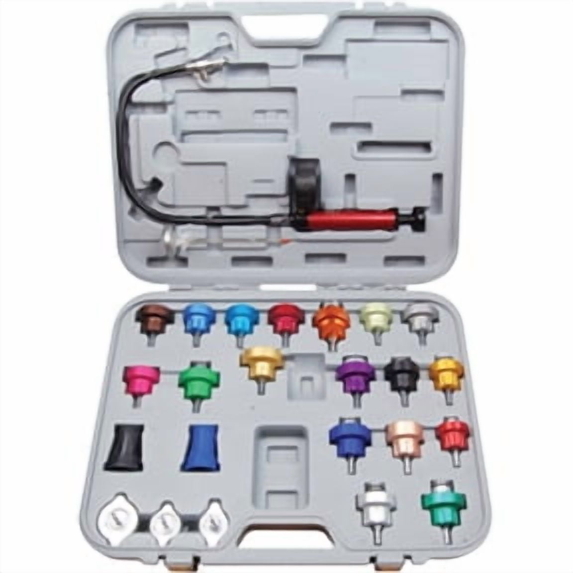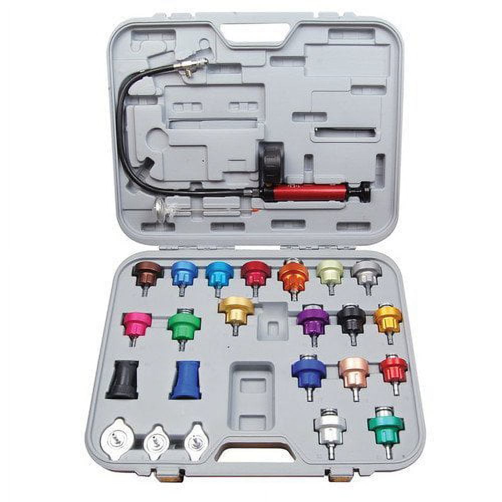25 Pc. Master Cooling System Pressure Test Kit Quickly reveals external cooling system leaks . Detects internal engine leaks caused by blown head gaskets and/or cracked block or heads . Easily test entire cooling system including radiator, heater core, and radiator cup . Kit includes: . Hand pressure pump with color coded 0-35 psi gauge and push-button pressure relief valve . Temperature gauge . (3) Chromed steel radiator adapters . (18) Anodized aluminum radiator adapters . (2) Radiator cup test adapters . Storage and carrying case 3302 Yes – DI(2-ETHYLHEXYL)PHTHALATE (DEHP)