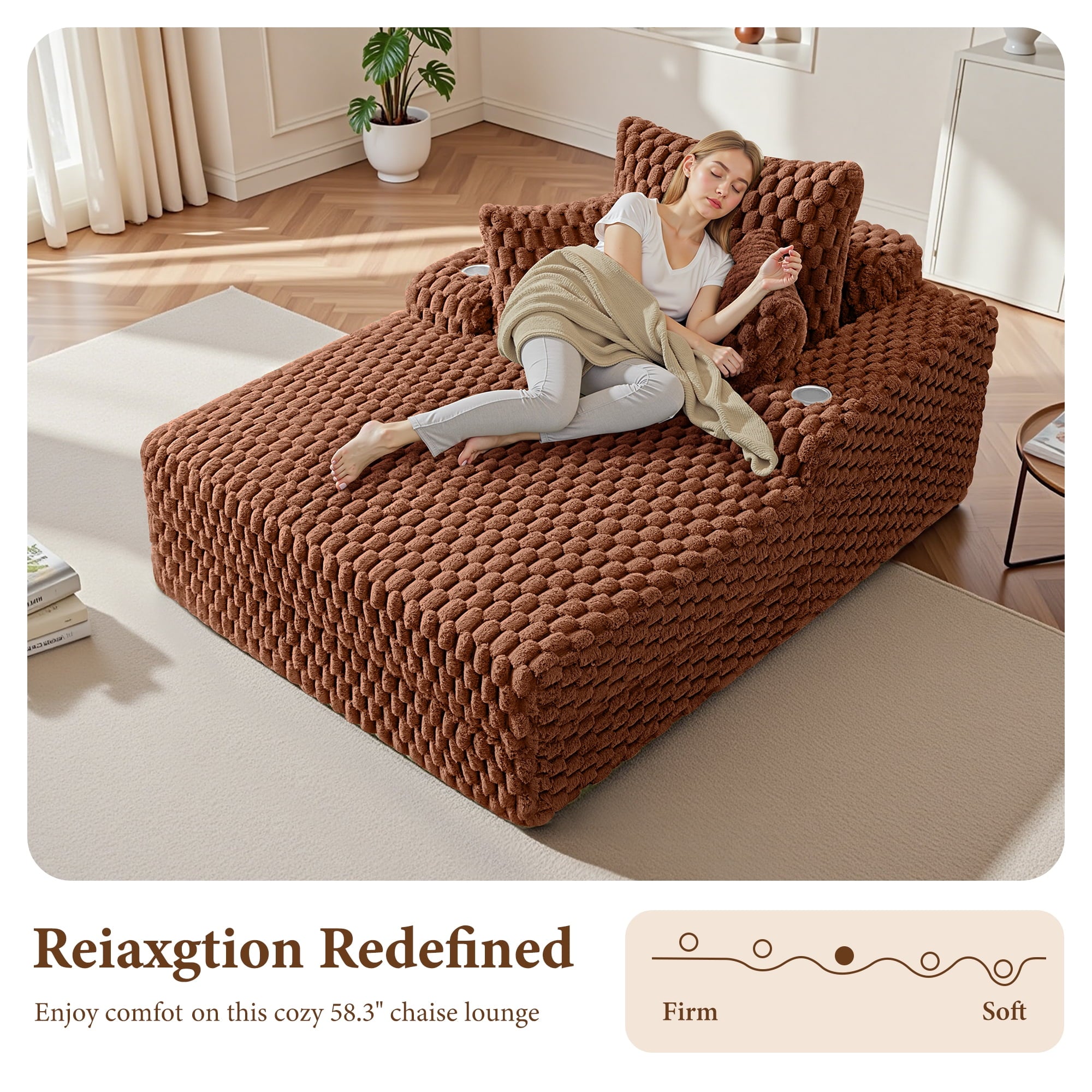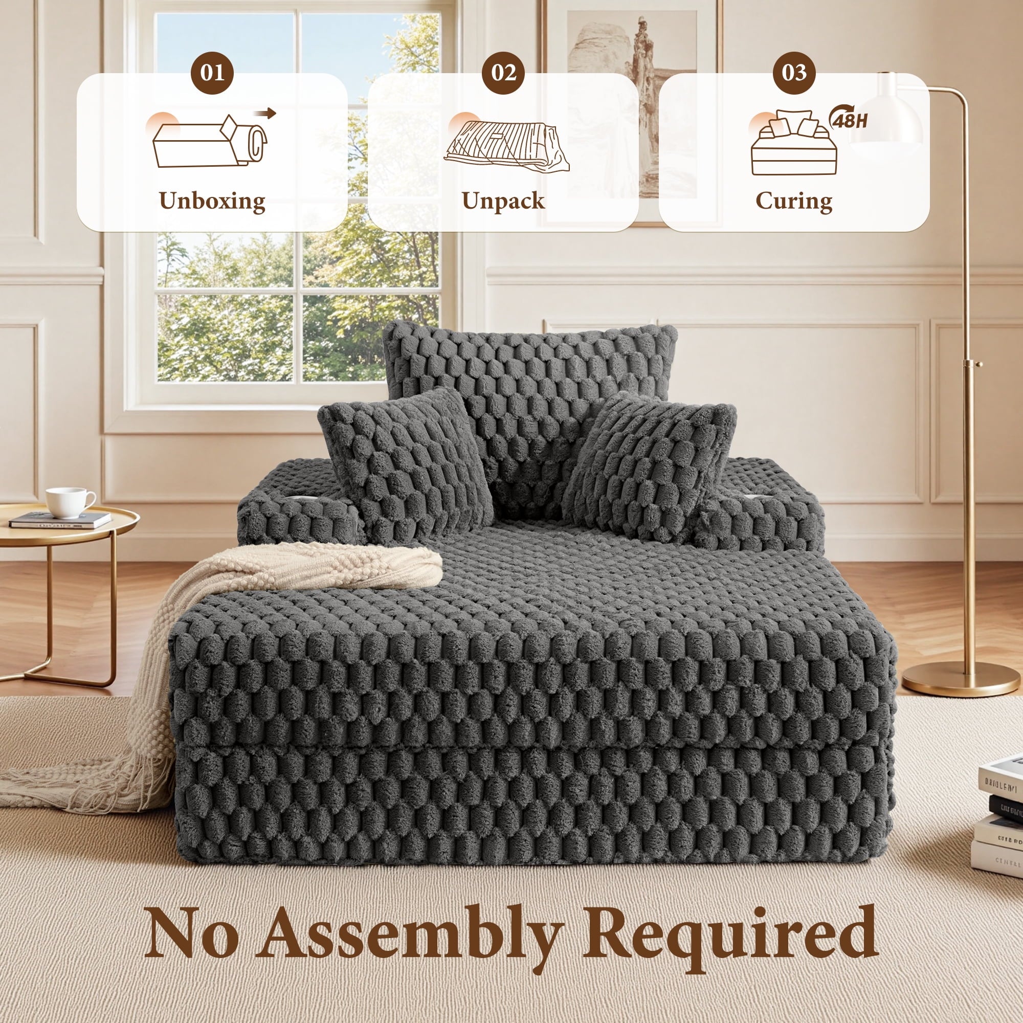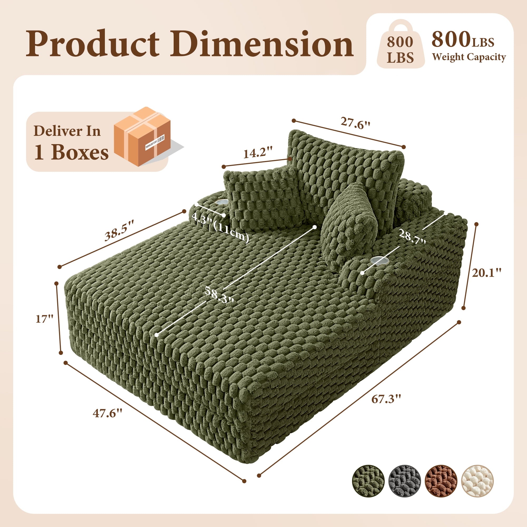 This oversized chaise lounge chair is designed for ultimate relaxation and modern convenience. With its generous 53-inch width and deep 47-inch seating area, it provides exceptional space for reading, napping, or enjoying movie nights with loved ones. Upholstered in premium breathable corduroy fabric and filled with high-density foam and pocket springs, it maintains perfect shape while delivering plush support. The ergonomic design ensures full-body comfort, ideal for extended periods of relaxation or meditation. Practical built-in features include removable cup holders and integrated charging ports to keep your devices powered. With its sleek modern aesthetic and simple, quick assembly process, this chaise lounge effortlessly combines style, comfort and functionality for any living space.