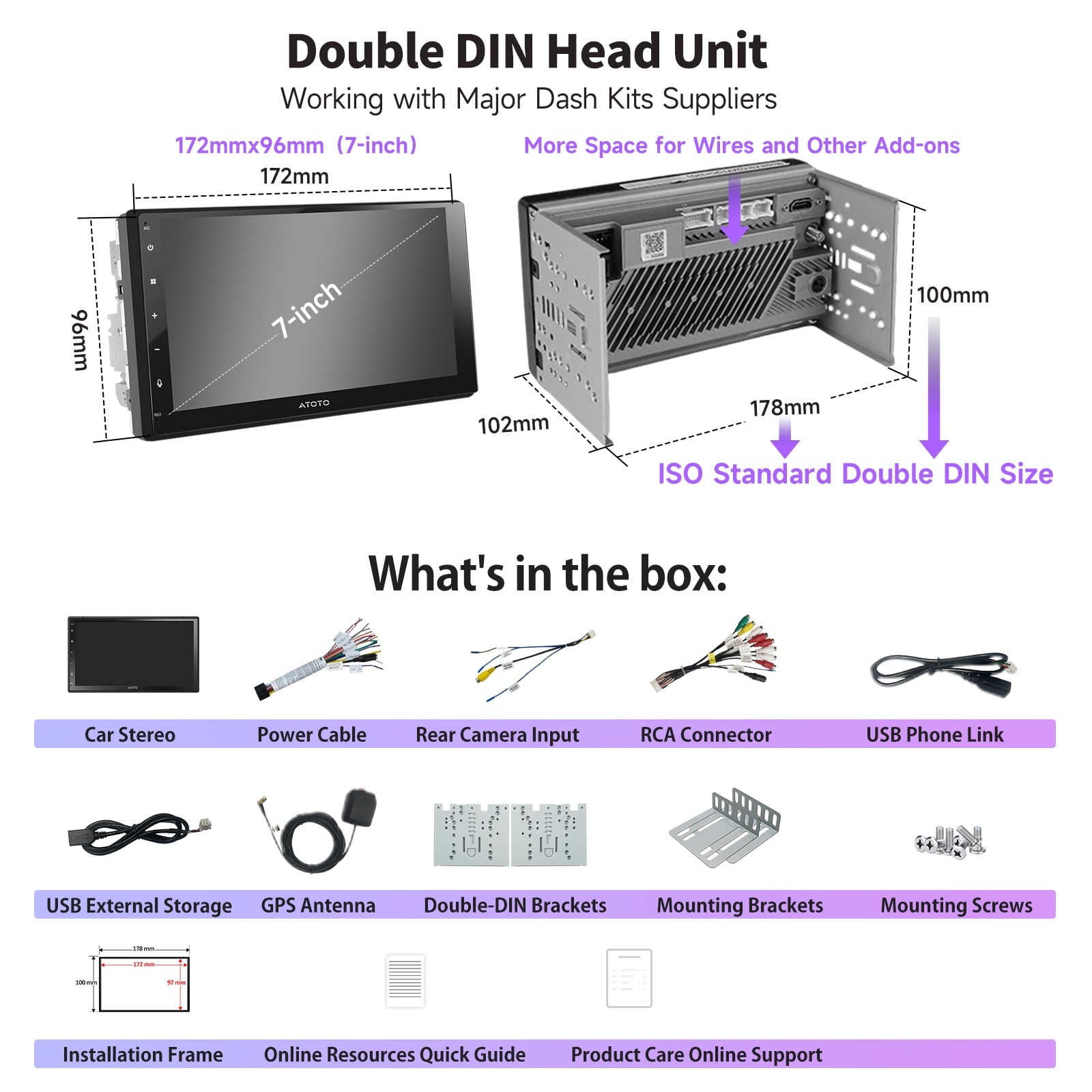 - 【Upgraded DSP】 7inch Double Din Car Stereo features a built-in amplifier (Peak 4x45W, RMS 4x24W) and a 24-Band EQ with 9 presets. Adjust sound according to your preferences with Digital Signal Processor (DSP), providing a tailored listening experience