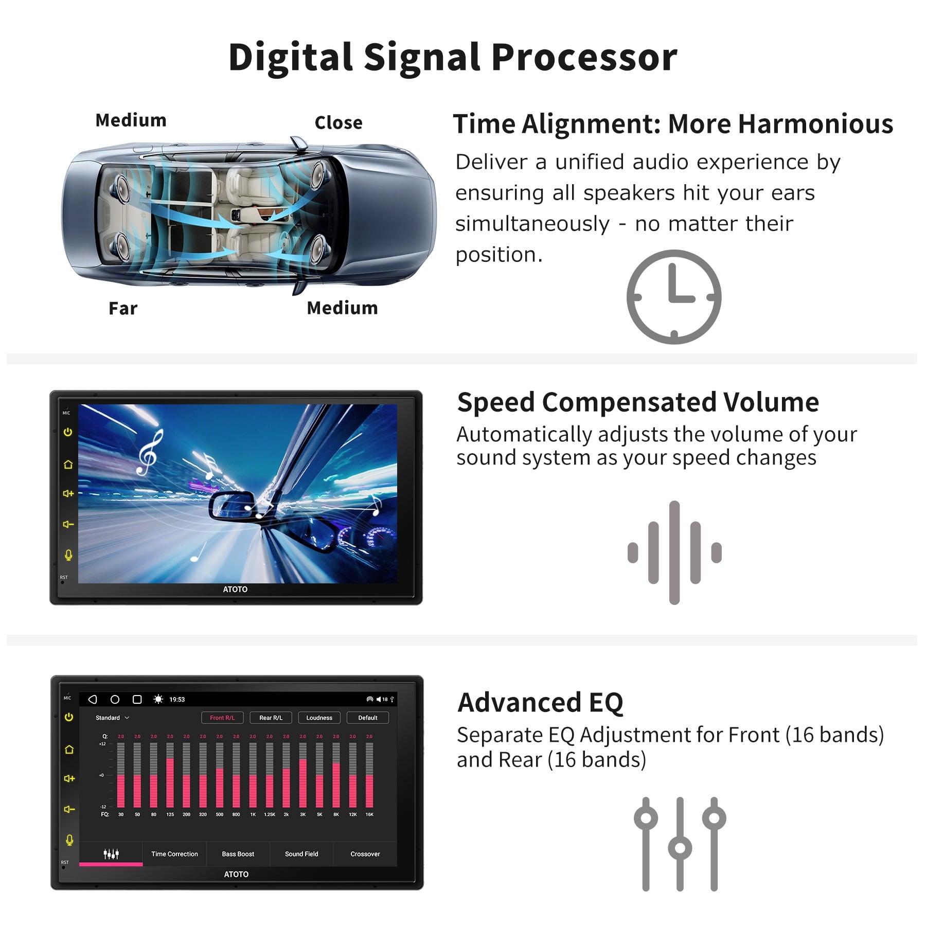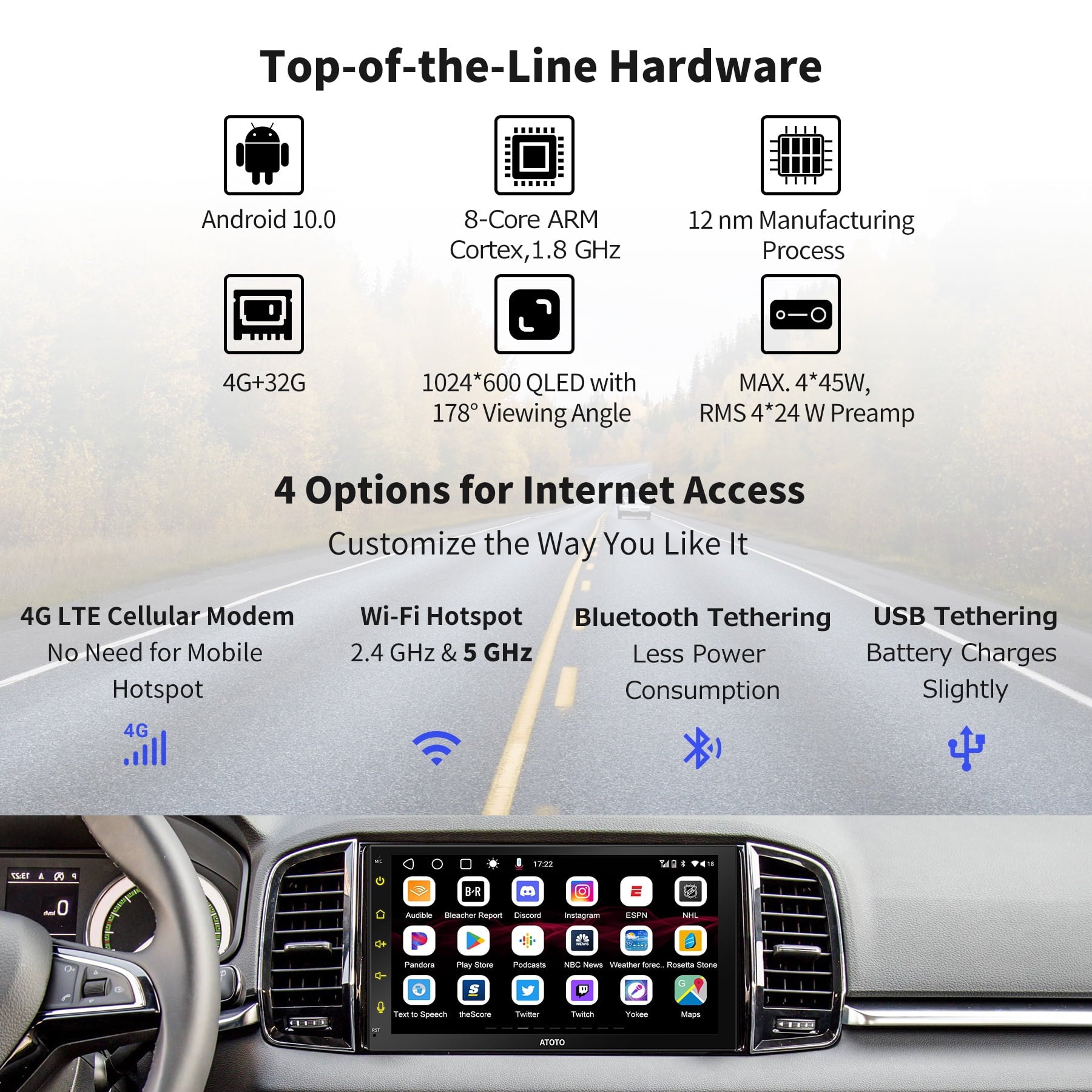 - The 178° full-viewing angle QLED display enhances contrast for an exceptional viewing experience, even in daylight. Pre-installed TrackHU, ATOTO’s exclusive GPS tracking app for real-time tracking with a 15-second refresh rate, OsmAnd’s 4-satellite positioning, track playback with detailed reports, and instant geofence alerts.