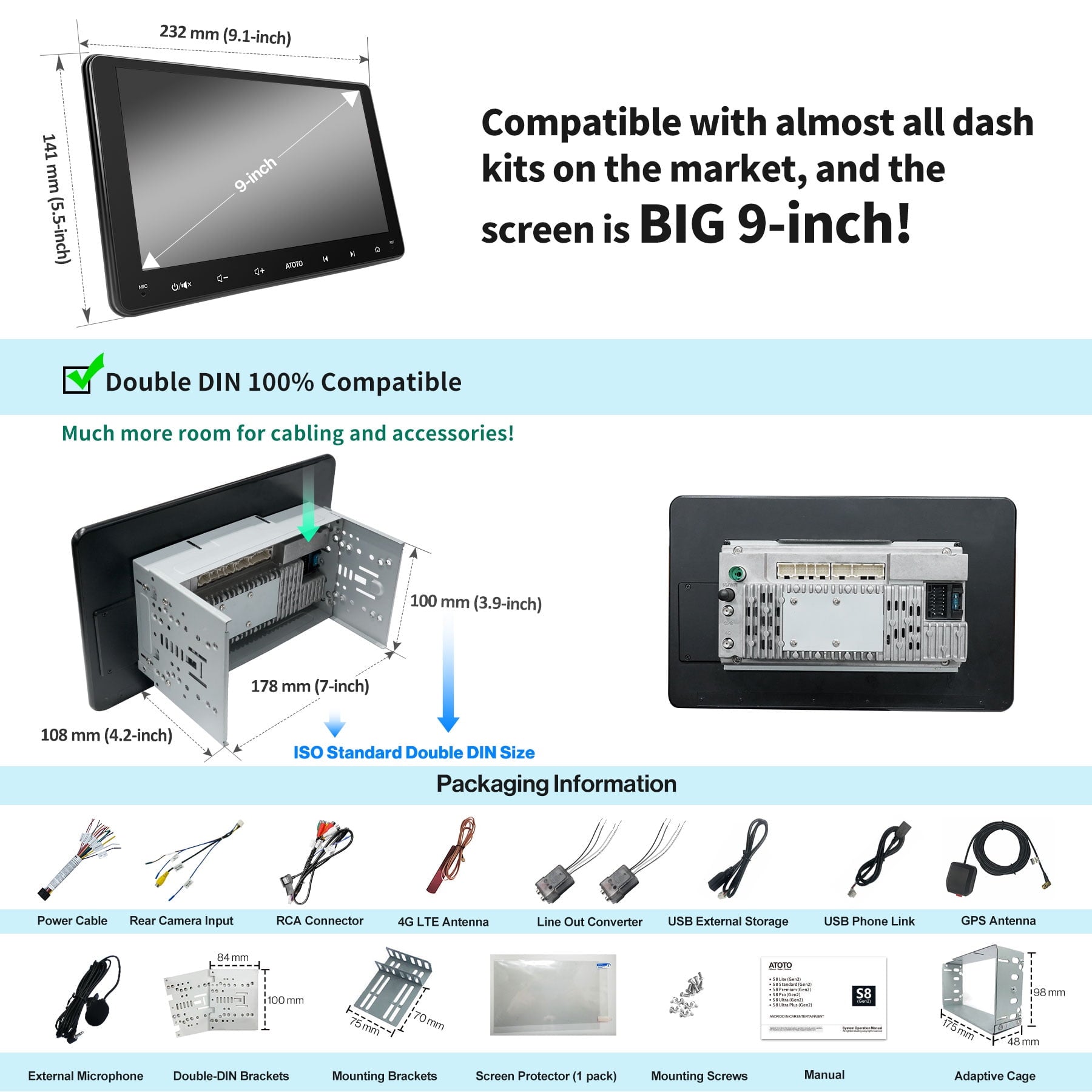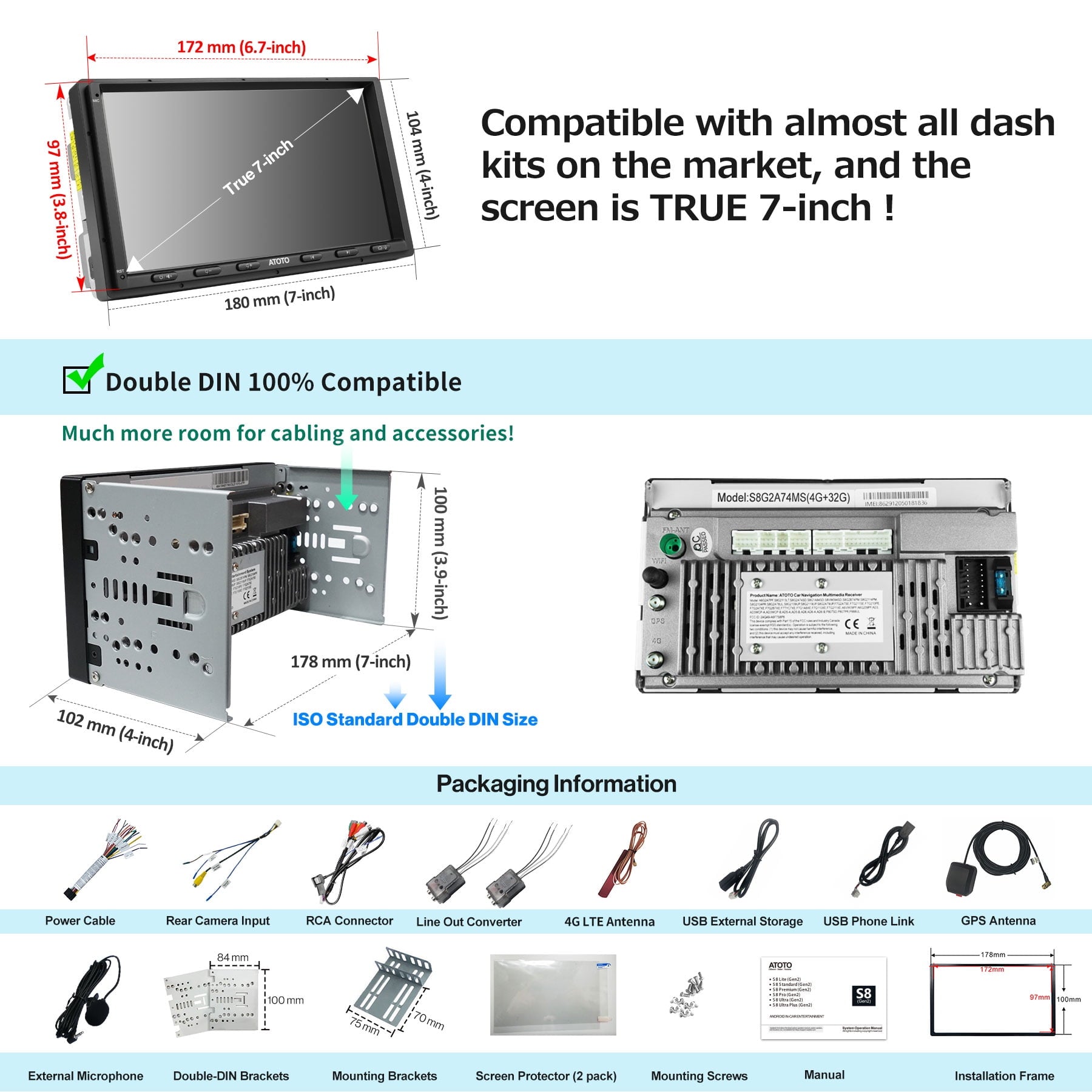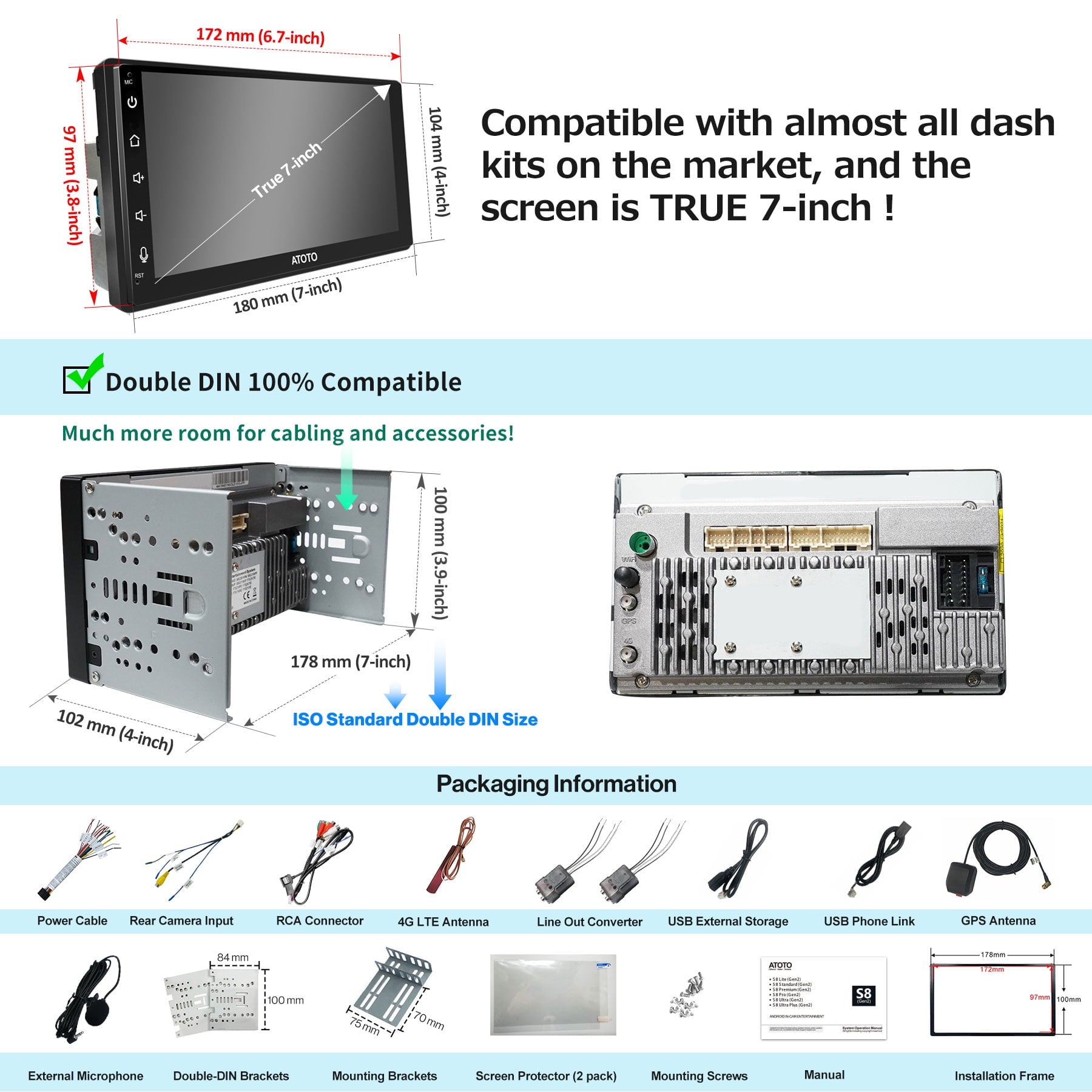 Most dashboard mounting frame suppliers from North America may provide a double din mounting frame with 174mm*98mm opening (Metra dash kit, PAC dash kit,etc). ATOTO is the first one to bring an Android 7inch car stereo with a minimum 172mm*97mm front