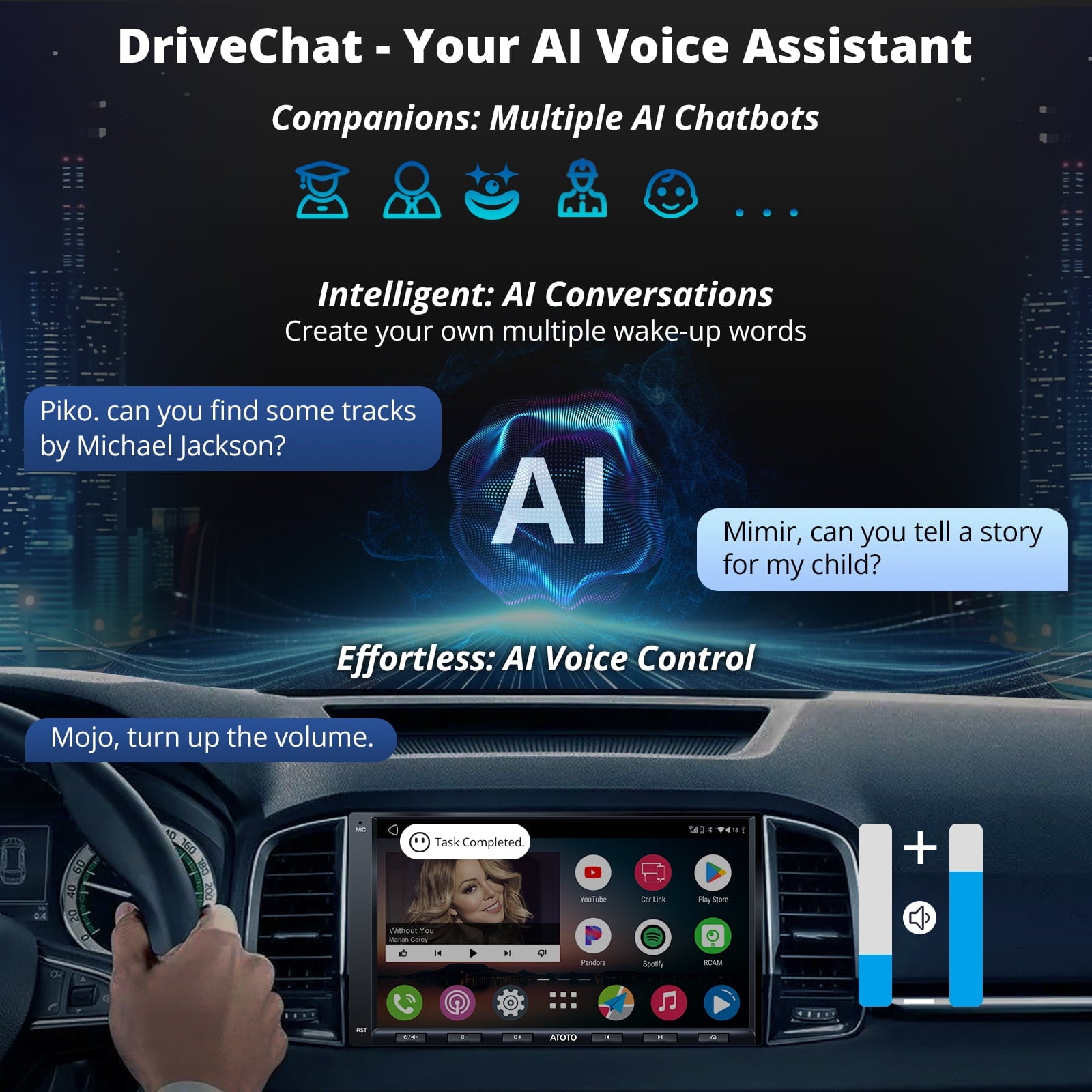 - DriveChat – Your AI Driving Assistant – Powered by ChatGPT, DriveChat enhances your driving with advanced voice control. Manage calls, music, and more hands-free, keeping your focus on the road. Switch between specialized DriveBots for tailored assistance and expert advice. Customize wake-up words for a personalized experience