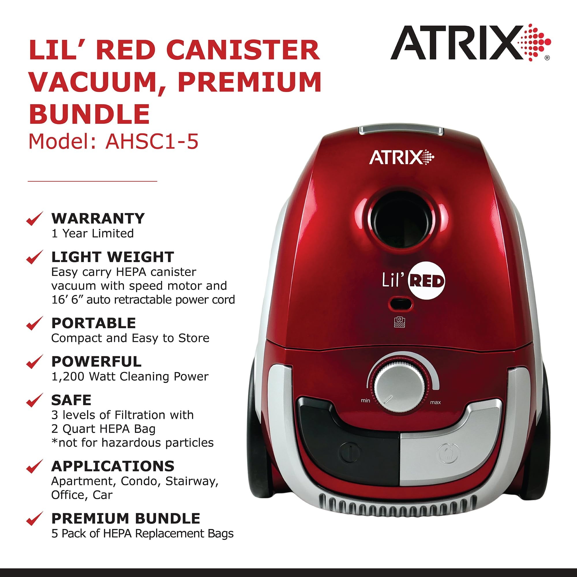 The Atrix Lil’ Red Canister Vacuum Premium Bundle AHSC1-5 is an excellent HEPAvacuum option for your house, office, or vehicle. This easy carry HEPA vacuumhas three levels of filtration, variable speed motor, and 16.5’ retractablepower cord. The three levels of filtration consist of a two quart HEPA bag,exhaust filter, and foam premotor filter. The HEPA bag helps capture particlessuch as pollen, pet dander, and dust mites. The variable speed motor allowsyou to go from cleaning your floor to cleaning your drapes with an easy changein suction. The Lil’ RED Canister vacuum is compact, easy to carry, and easyto store with its dimensions of 13.5” x 10” x 8” and weight of only 6.5pounds. Although the vacuum is compact, it is still very powerful with its1,200-watt cleaning power that produces 71 CFM. The Lil’ Red Premium Bundlealso comes with a telescopic extension wand with seventeen height settingswhich allows you to access those hard to reach areas. A full bag indicator onthe front of the vacuum informs you when the HEPA bag is full and needs to bechanged. This vacuum is great for other applications but not limited to;apartments, condos, stairways, and vehicles. This product should not be usedfor hazardous particulate.