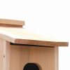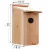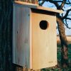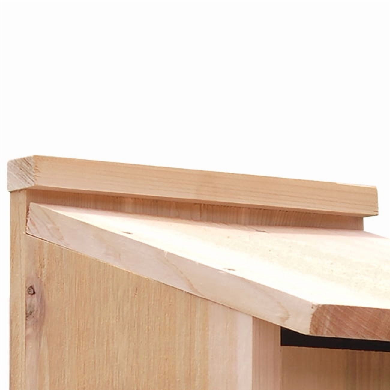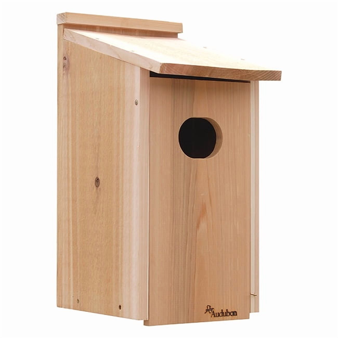 Enjoy waterfowl roosting near your pond using the Audubon Wood Duck House. The straight lines and significant size of this shelter are perfect for wood ducks, which rely on preexisting cavities for nesting, as they are unable to excavate their own. A 3.75″ x 3″ oval entry hole rests near the top of the home, protected by the overhang of the slanted roof. A gap between the roof overhang and the front panel ventilates the house, keeping nestlings from overheating. Water can also exit the nest by the narrow gap on the base for a dry roost. The front panel opens for nest checks, while a latch at its base keeps the door securely closed. Additional wooden bars on the interior of the home create a ladder, helping nestlings exit, and two included bags of wood shavings keep eggs from rolling around. The cedar roost resists rot, and its natural color enhances your pond. Mount this home to a post or tree, ensuring it is near the water, for optimal placement for wood ducks. Invite colorful ducks to roost near your pond with this Wood Duck House. Made in the USA.
