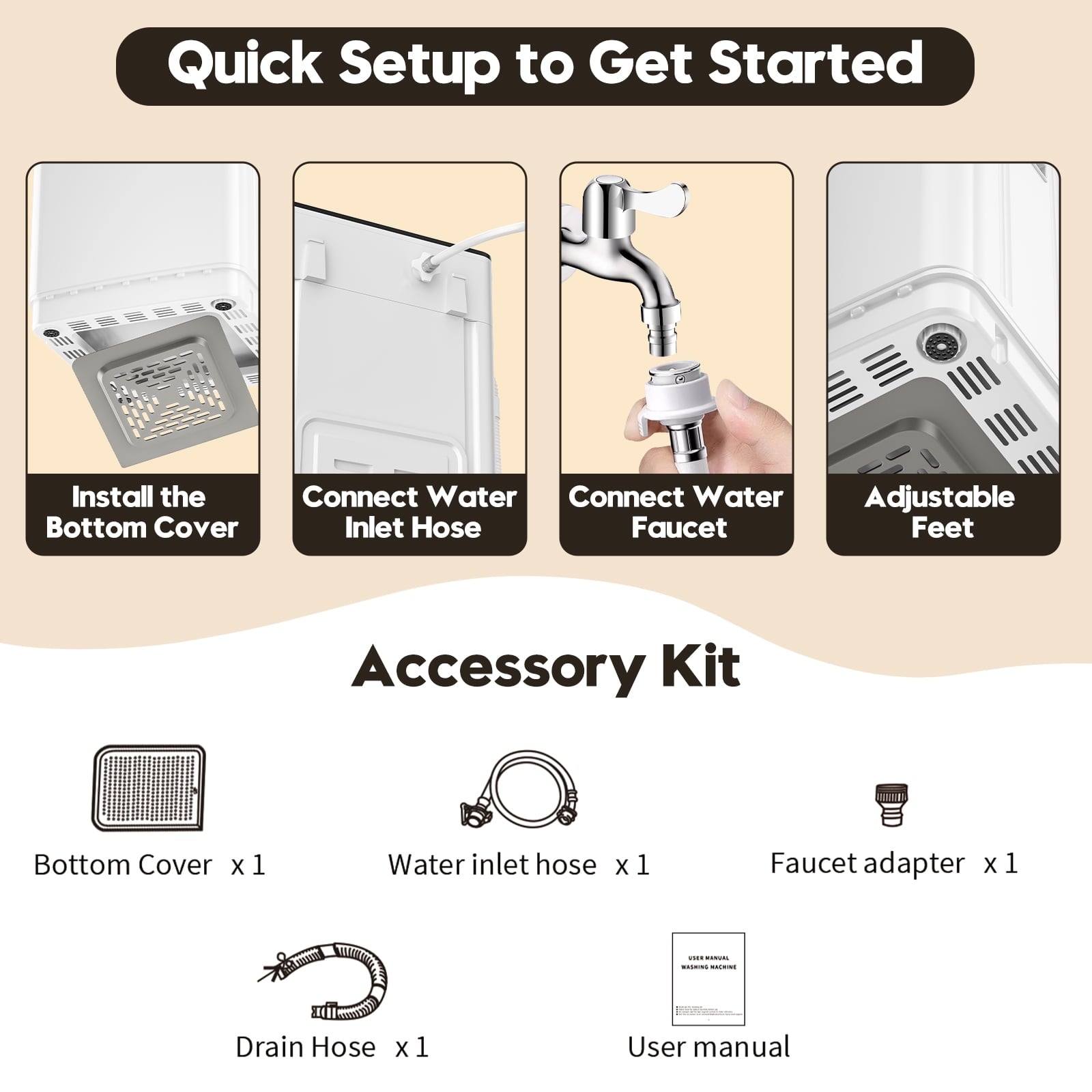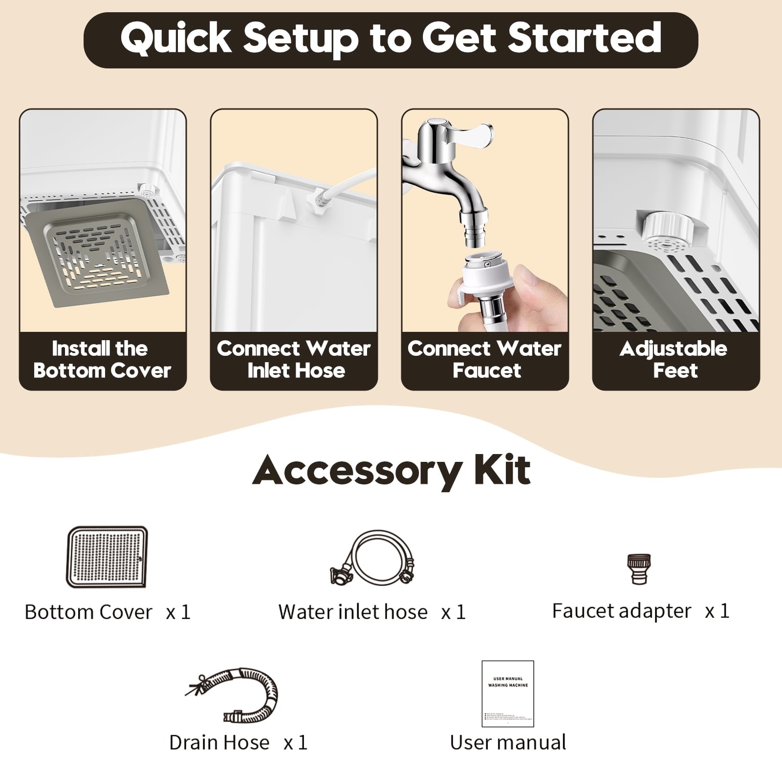 💡Included Components: Cover, Power Cord, Drain Hose, Manual, Washing Machine