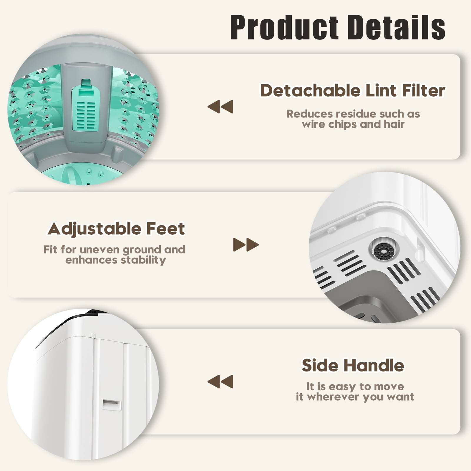 - 👚All-in-One Laundry Solution ——At just 20″ x 20″ x 33.7″, the washer machine combines washing and spinning, making it ideal for apartments, RVs, home, and dorms—no laundromat needed! Side handles and adjustable feet ensure easy mobility and stability on uneven floors.