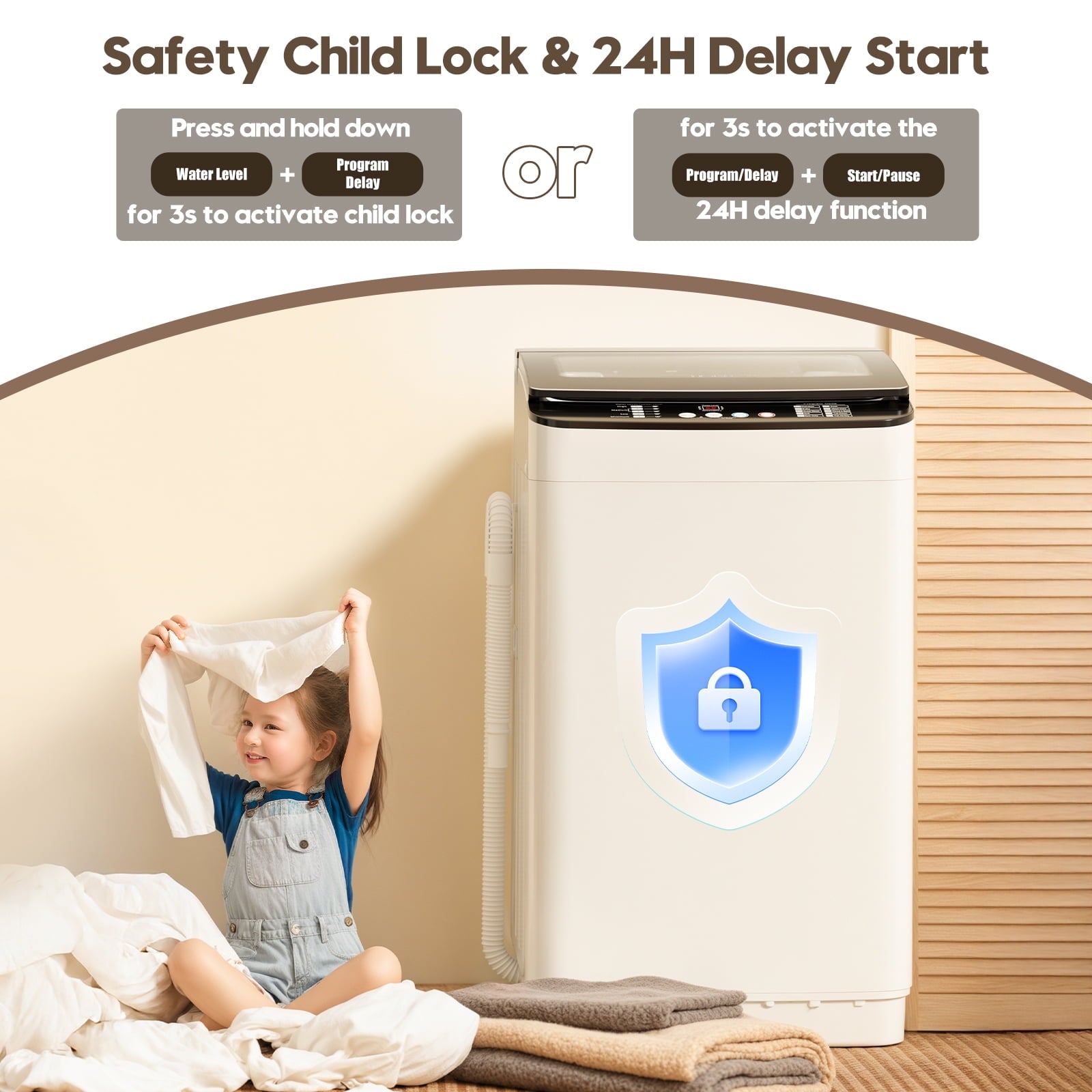 - 👚Child Lock Safety & Self-Cleaning Tub ——The built-in child lock prevents accidental settings changes, making this portable washing machine a worry-free choice for homes. The stainless steel drum automatically cleans residue, ensuring a fresh and clean washing machine for every use.