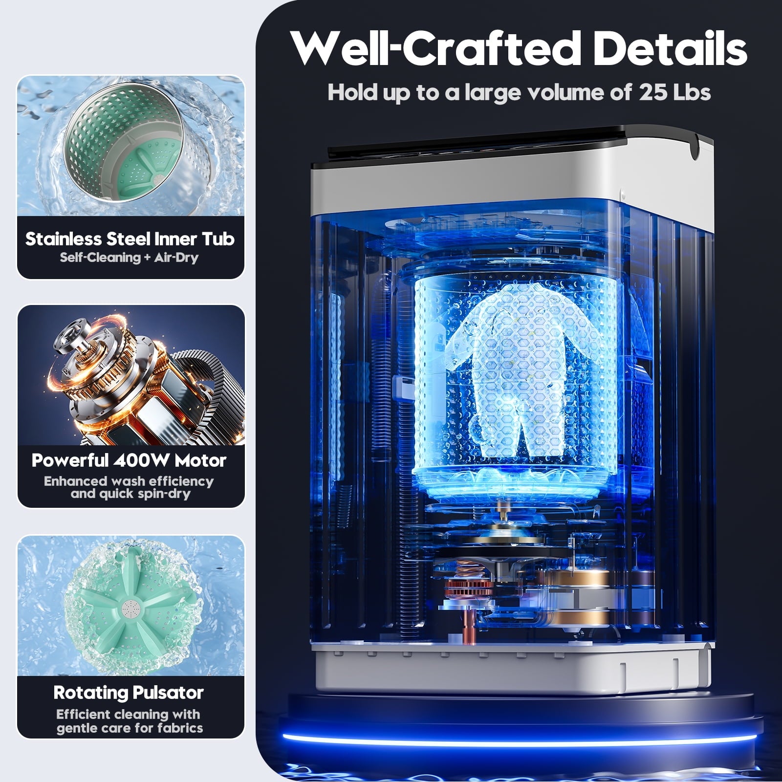 Our brand new fully automatic washer, 20″D x 20″W x 33.7″H, 2 in 1 washer and dryer with a stainless steel drum and a drain pump, equipped with a 380W powerful motor, allowing you to wash your clothes quickly and efficiently, saving your valuable