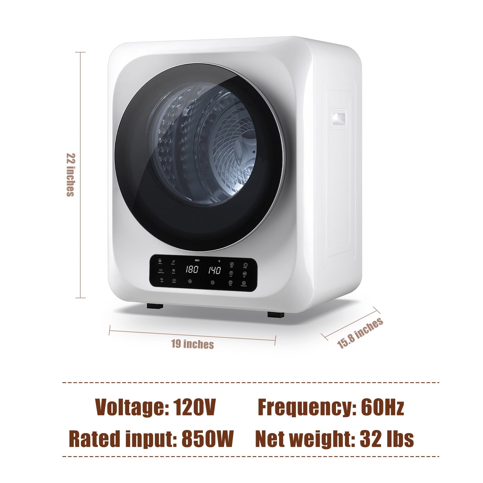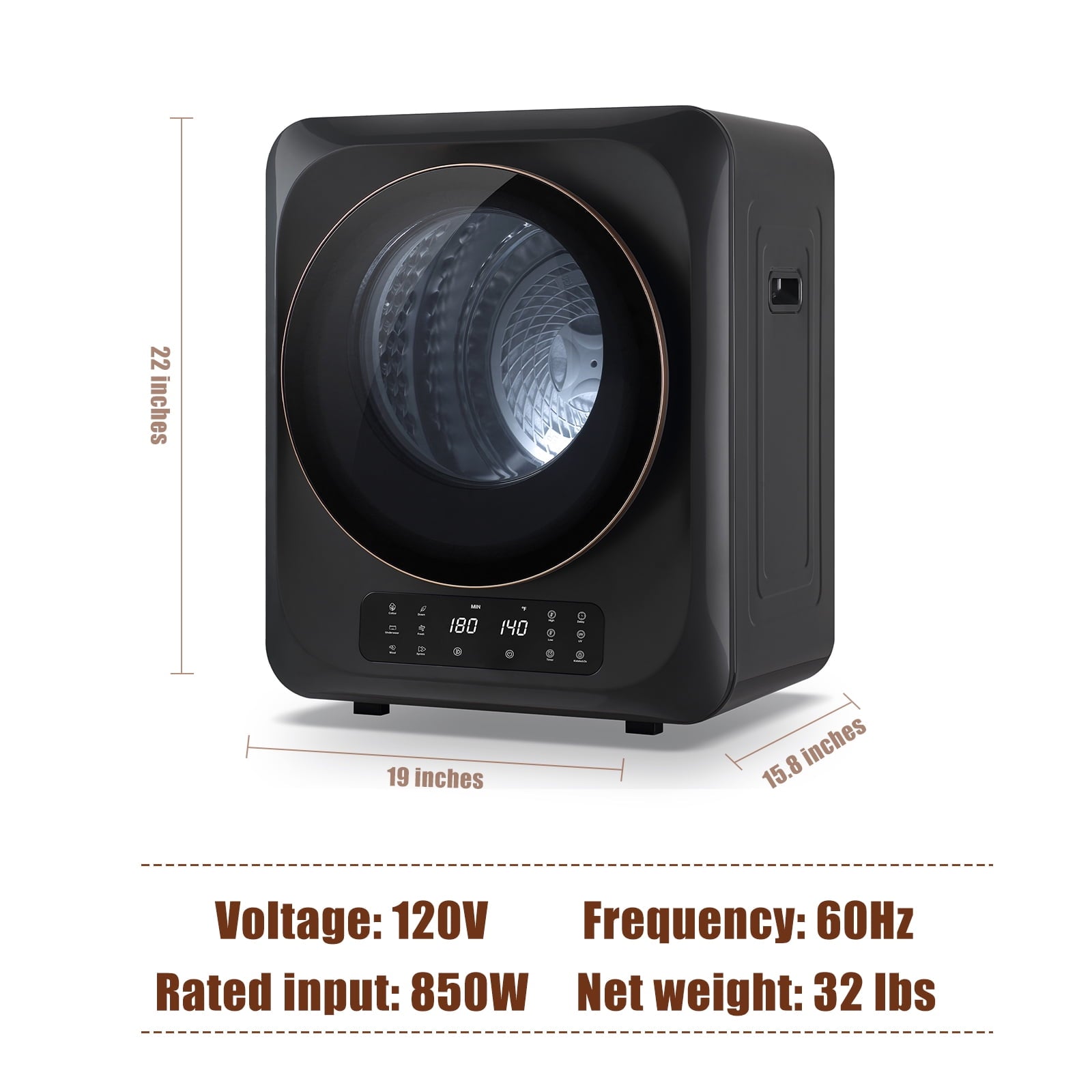 - [ 10 lbs Capacity Dryer ] Auertech portable dryer has 10 lbs drying capacity (wet clothes), with an 850W rated power, it can reach temperatures as high as 149℉, ensuring thorough and effective drying. [For quick drying, we recommend putting less than 5.5 lbs clothes at one time.]