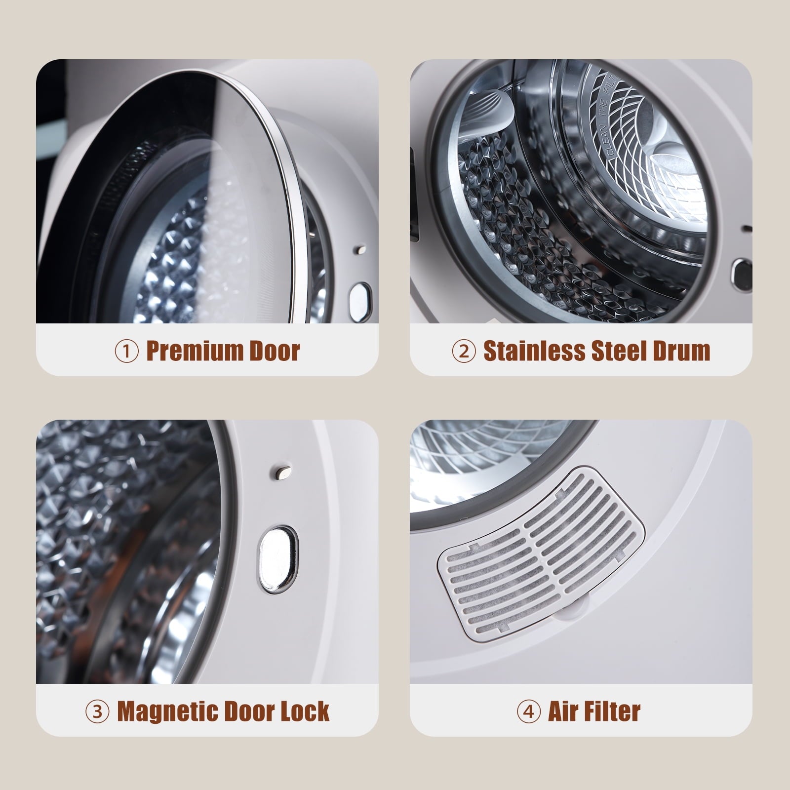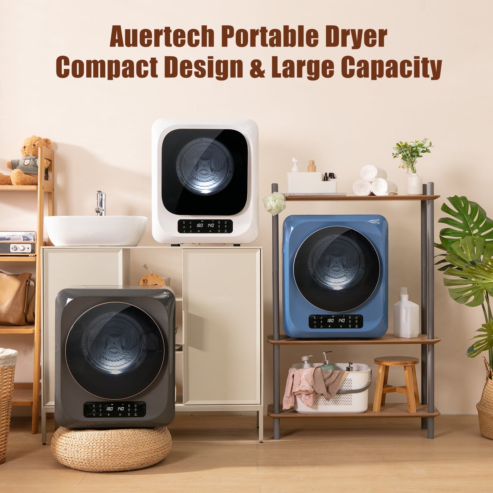 - [ High Quality Dryer Machine ] Our portable clothes dryer features multi-stage filtration system that captures lint, pet hair, and more. High-Quality construction built to last, it boasts a high-quality glass door, stainless steel tub, and a magnetic door lock for easy, secure operation. More than that, Auertech mini dryer operates with minimal noise, ensuring a tranquil atmosphere in your home.
