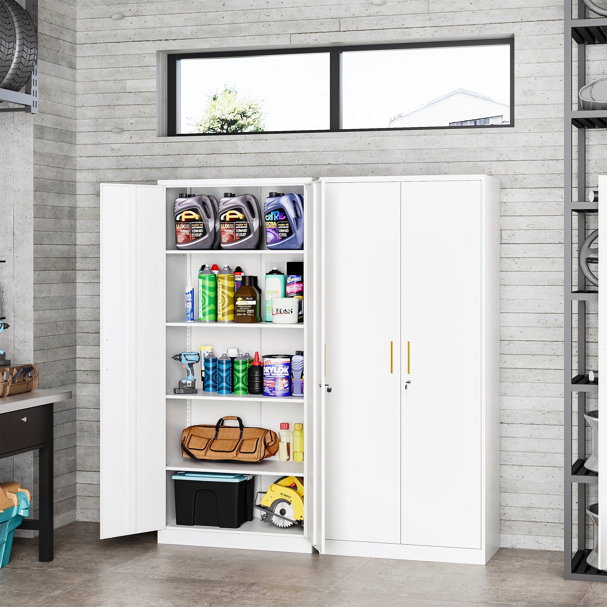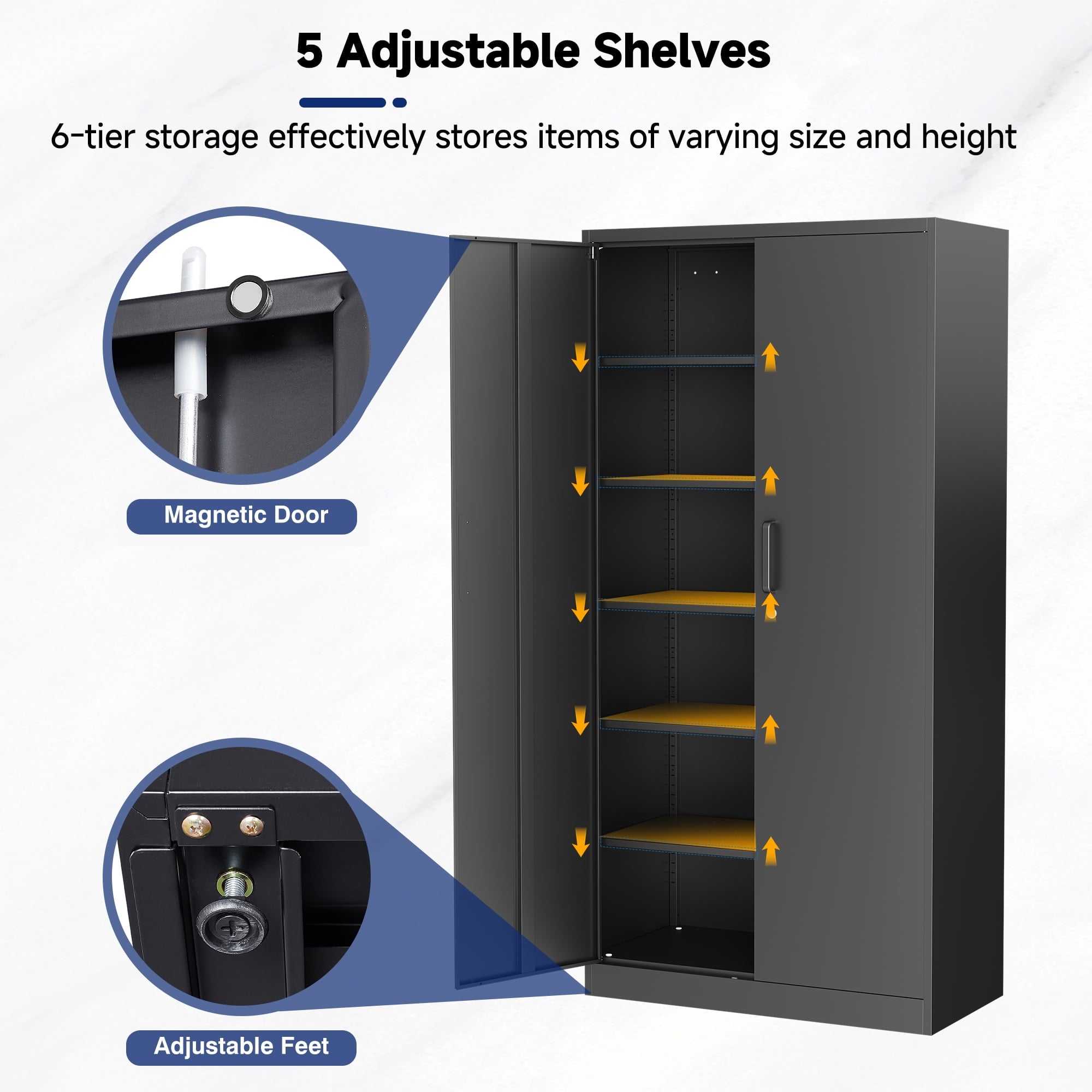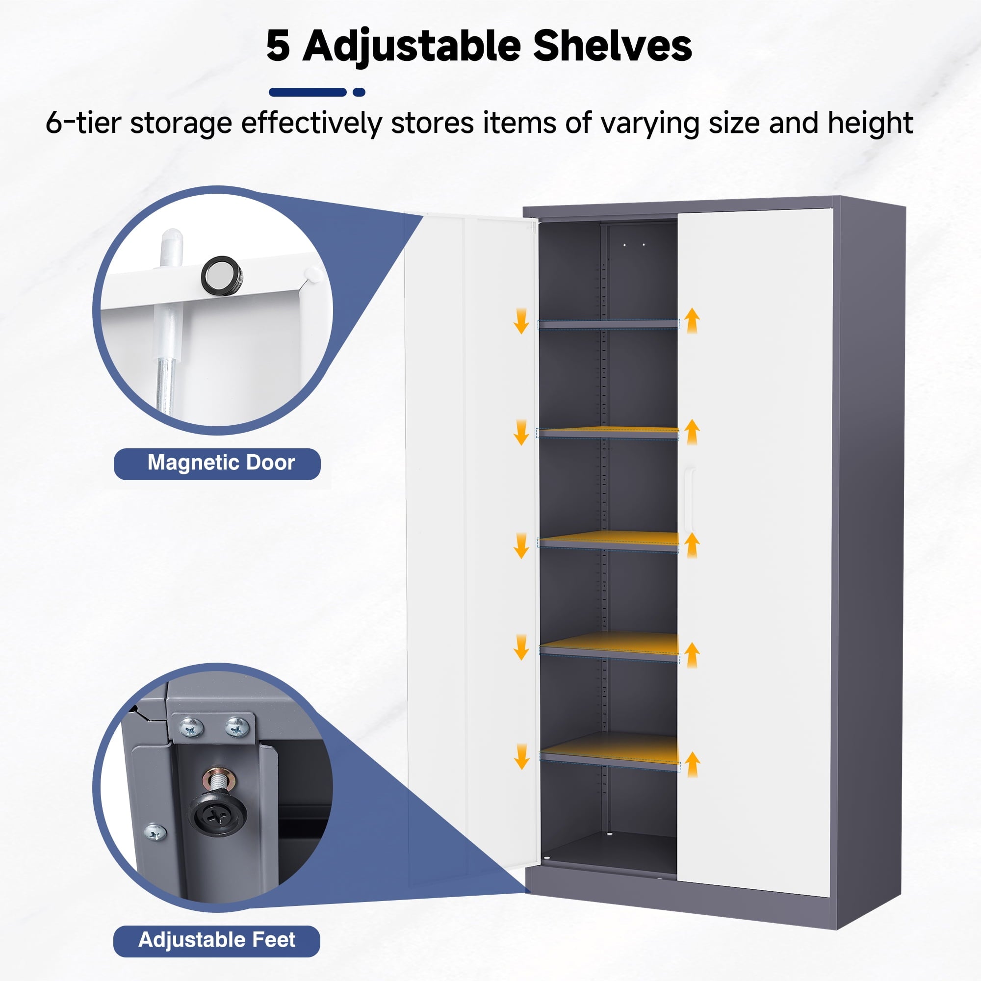 AUHUP 71 inches high metal cabinet is a multi-purpose and durable storage solution for home, office, warehouse, school and many other scenarios. The cabinet height is 71 inches (about 180 cm), providing spacious storage space, and the interior is designed with 5 tiers of adjustable shelves, you can flexibly adjust the height of each tier according to the actual needs, convenient for storing different sizes of items.