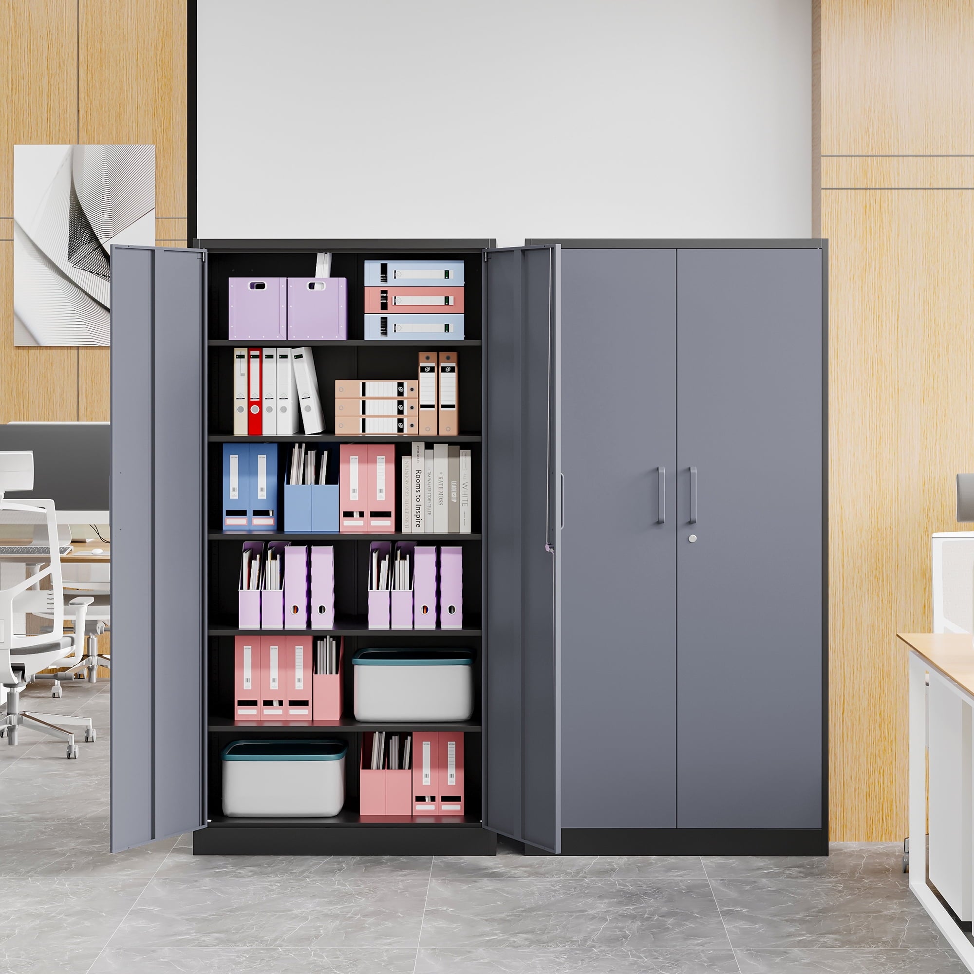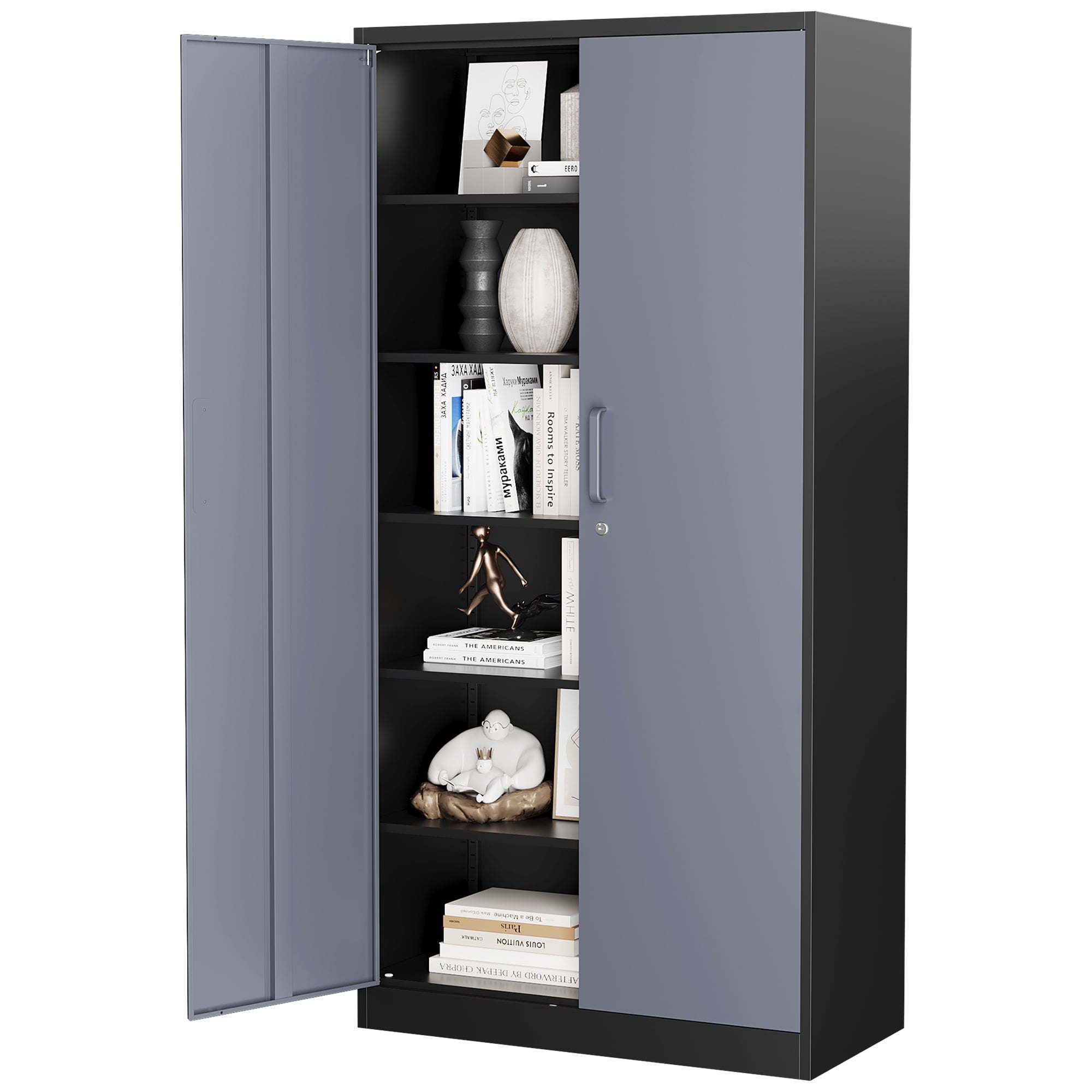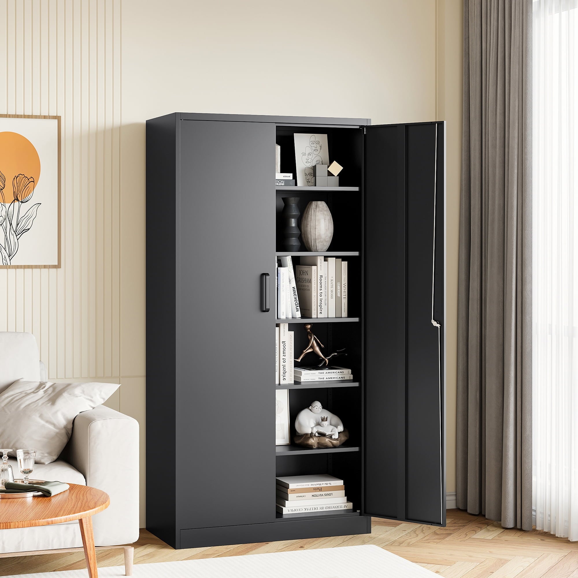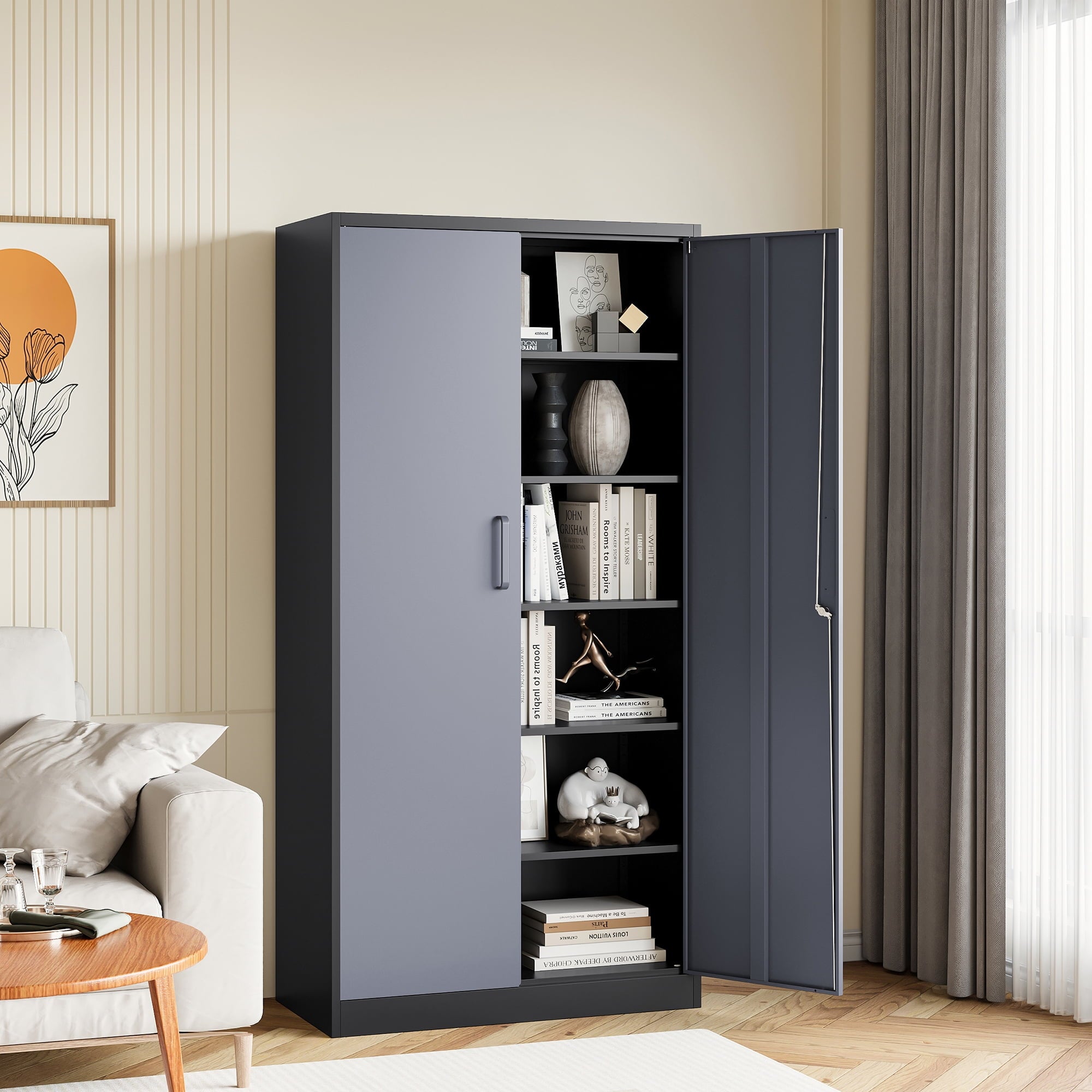 The overall appearance is simple and stylish, suitable for a wide range of decorative styles. Whether you use it for storing documents, tools, clothes or other miscellaneous items, this metal storage cabinet can meet your needs and is ideal for enhancing space utilization.