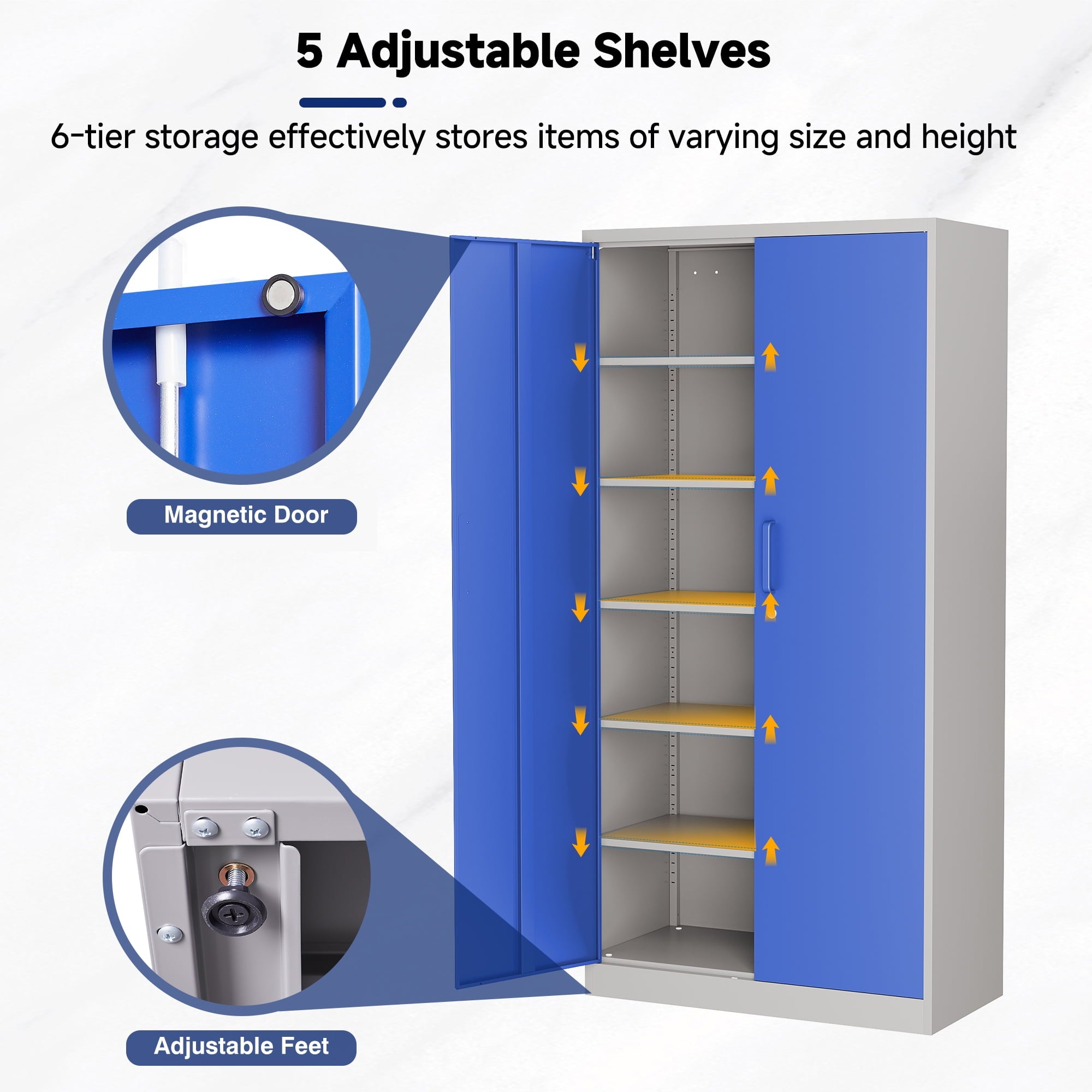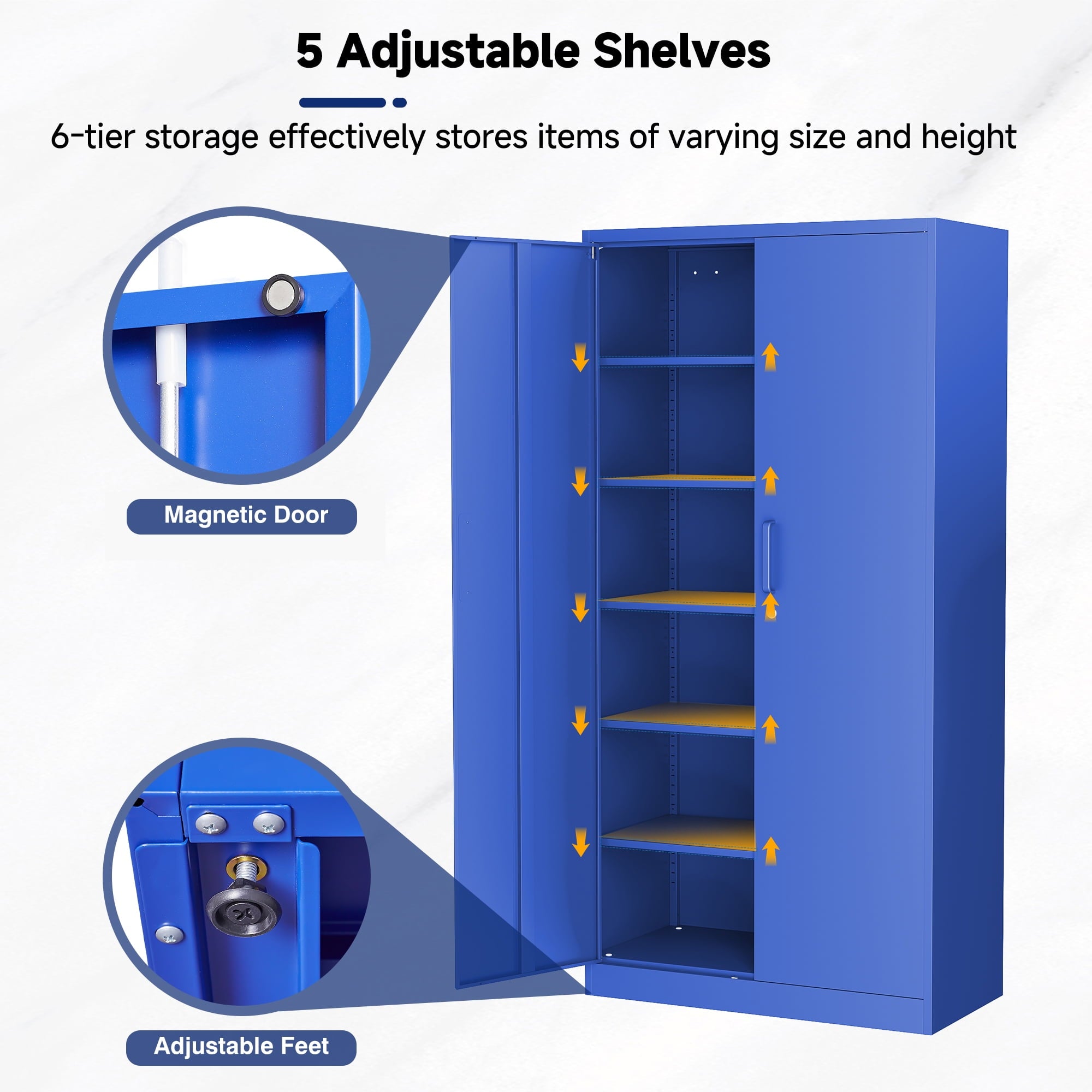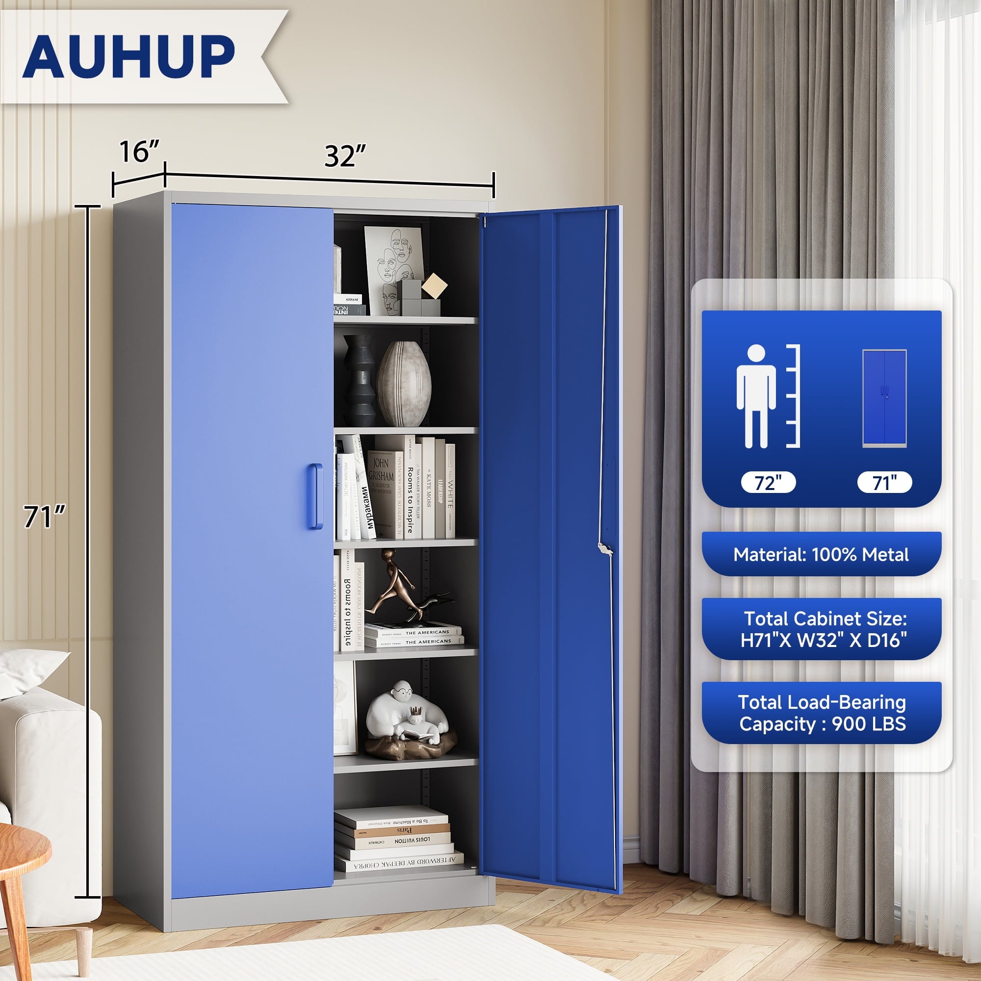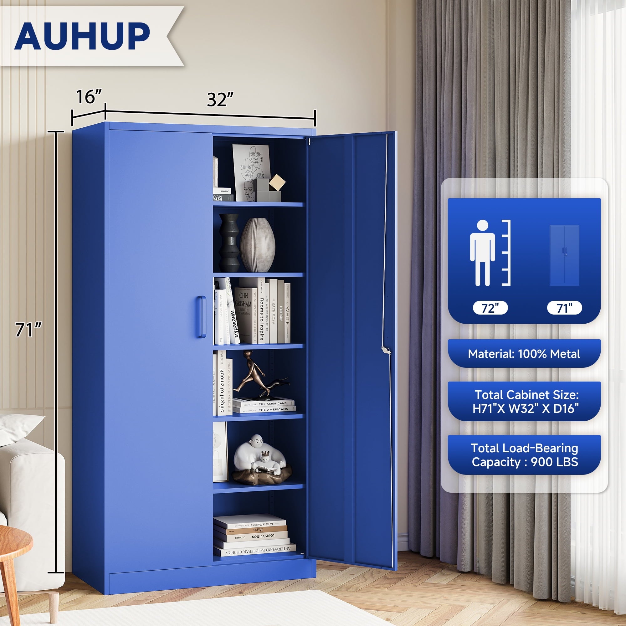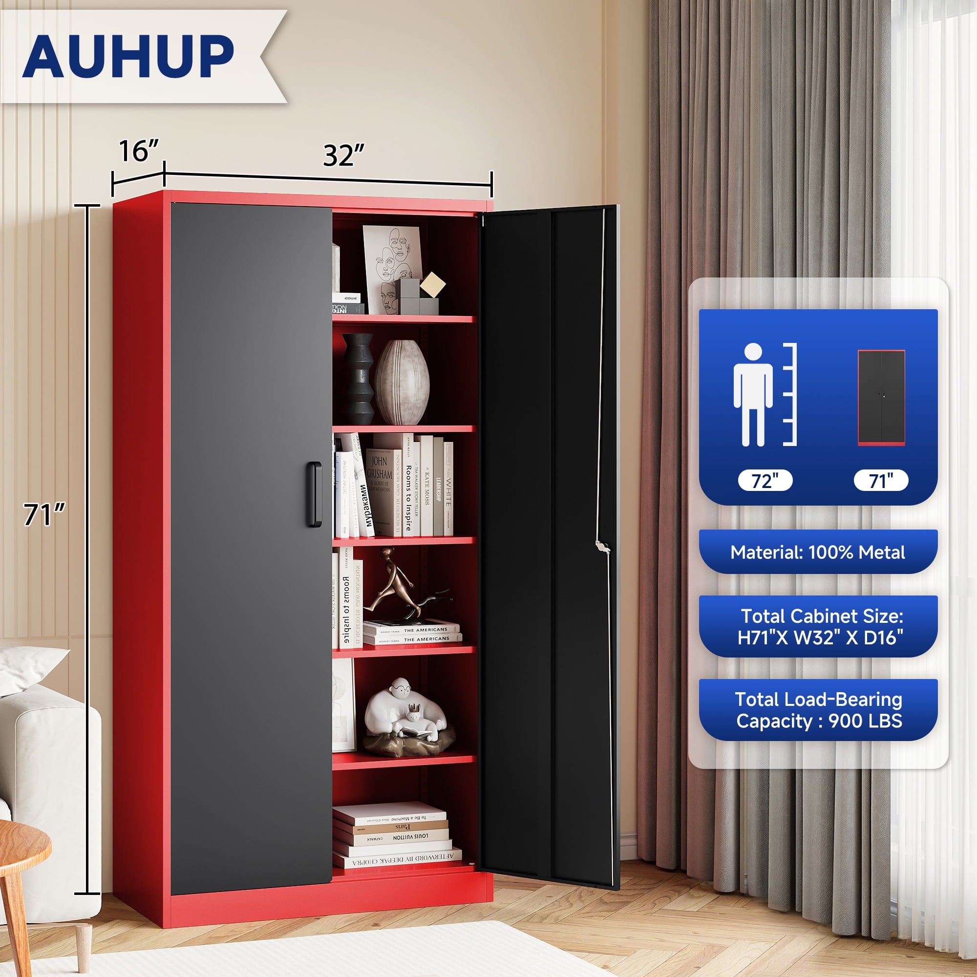 AUHUP 71 inches high metal cabinet is a multi-purpose and durable storage solution for home, office, warehouse, school and many other scenarios. The cabinet height is 71 inches (about 180 cm), providing spacious storage space, and the interior is designed with 5 tiers of adjustable shelves, you can flexibly adjust the height of each tier according to the actual needs, convenient for storing different sizes of items.