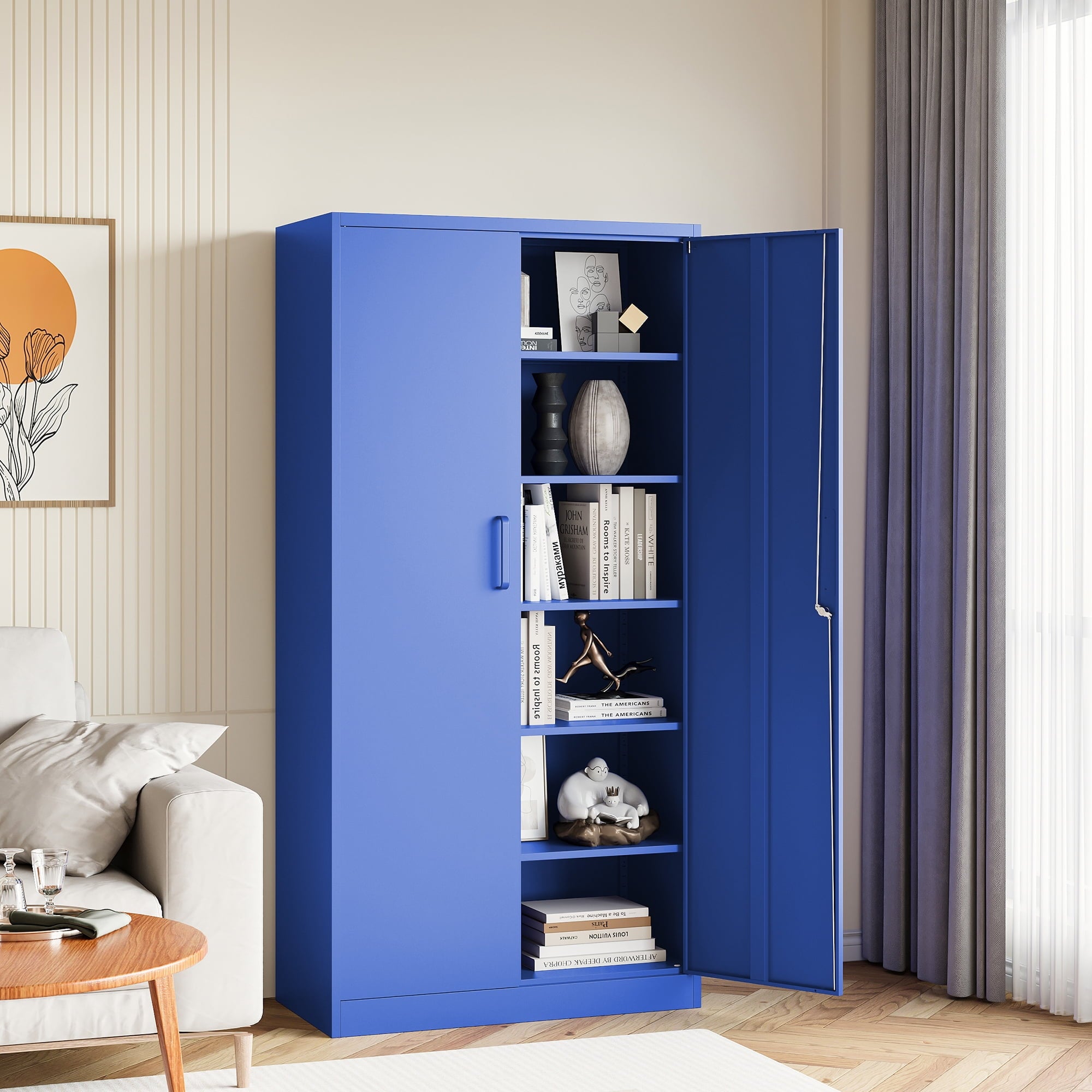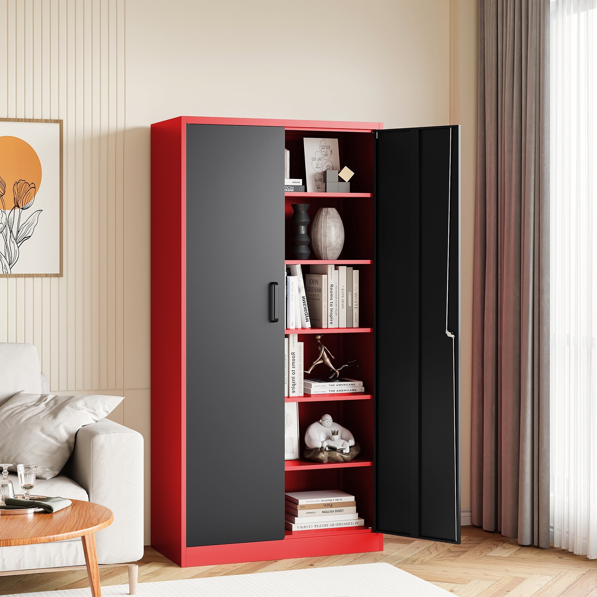 The overall appearance is simple and stylish, suitable for a wide range of decorative styles. Whether you use it for storing documents, tools, clothes or other miscellaneous items, this metal storage cabinet can meet your needs and is ideal for enhancing space utilization.
