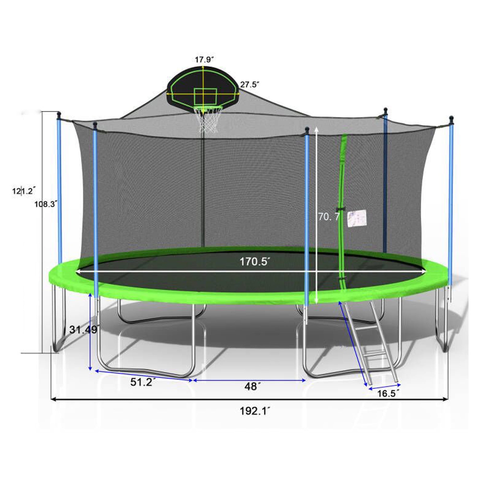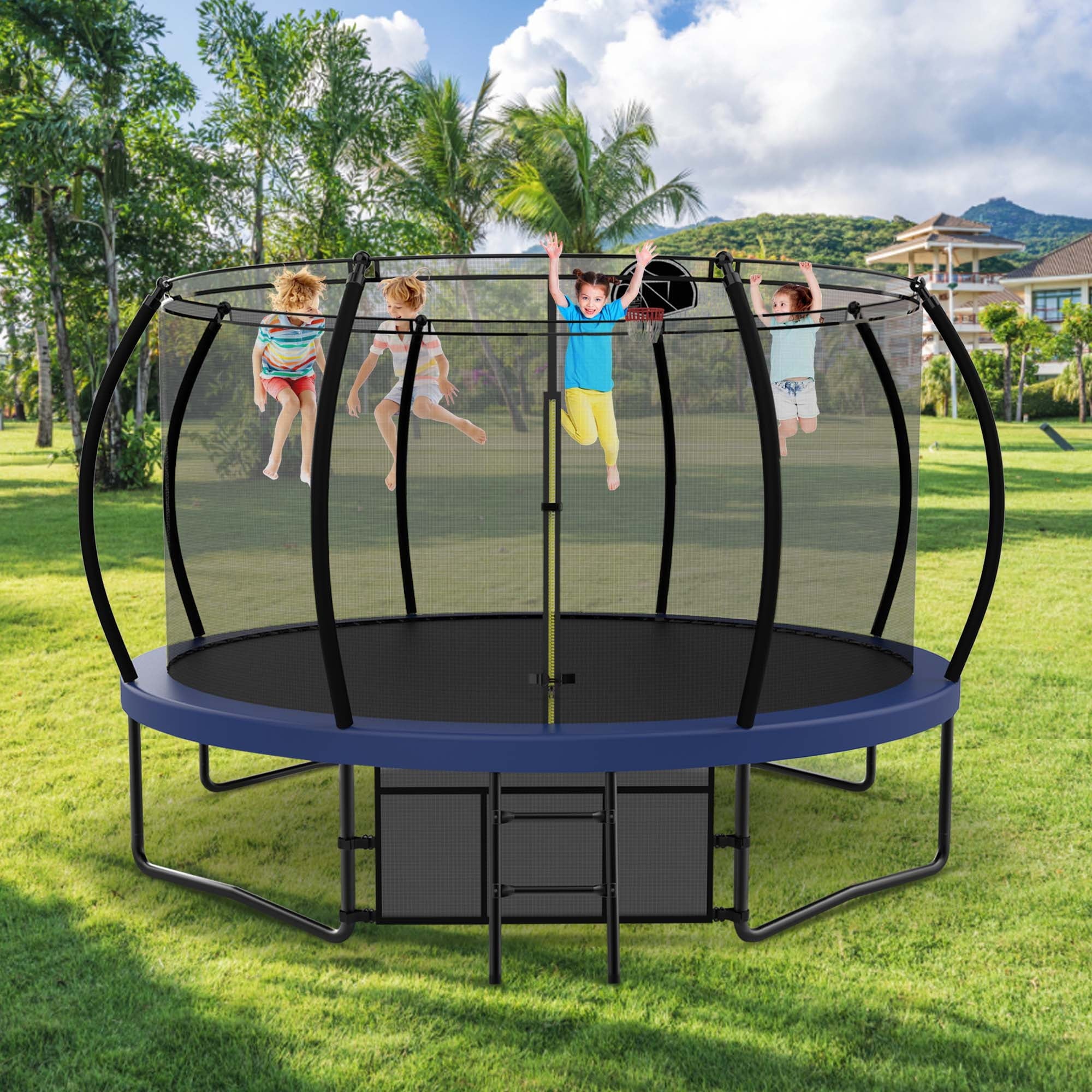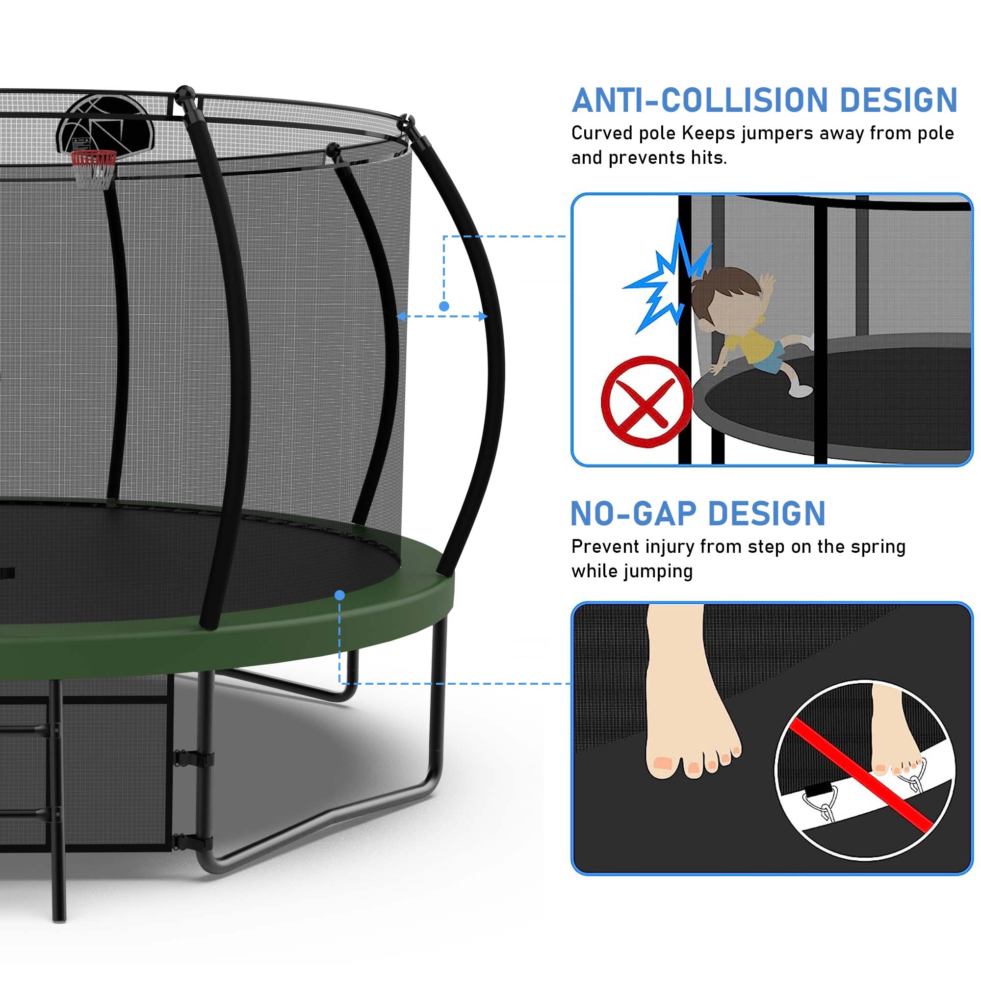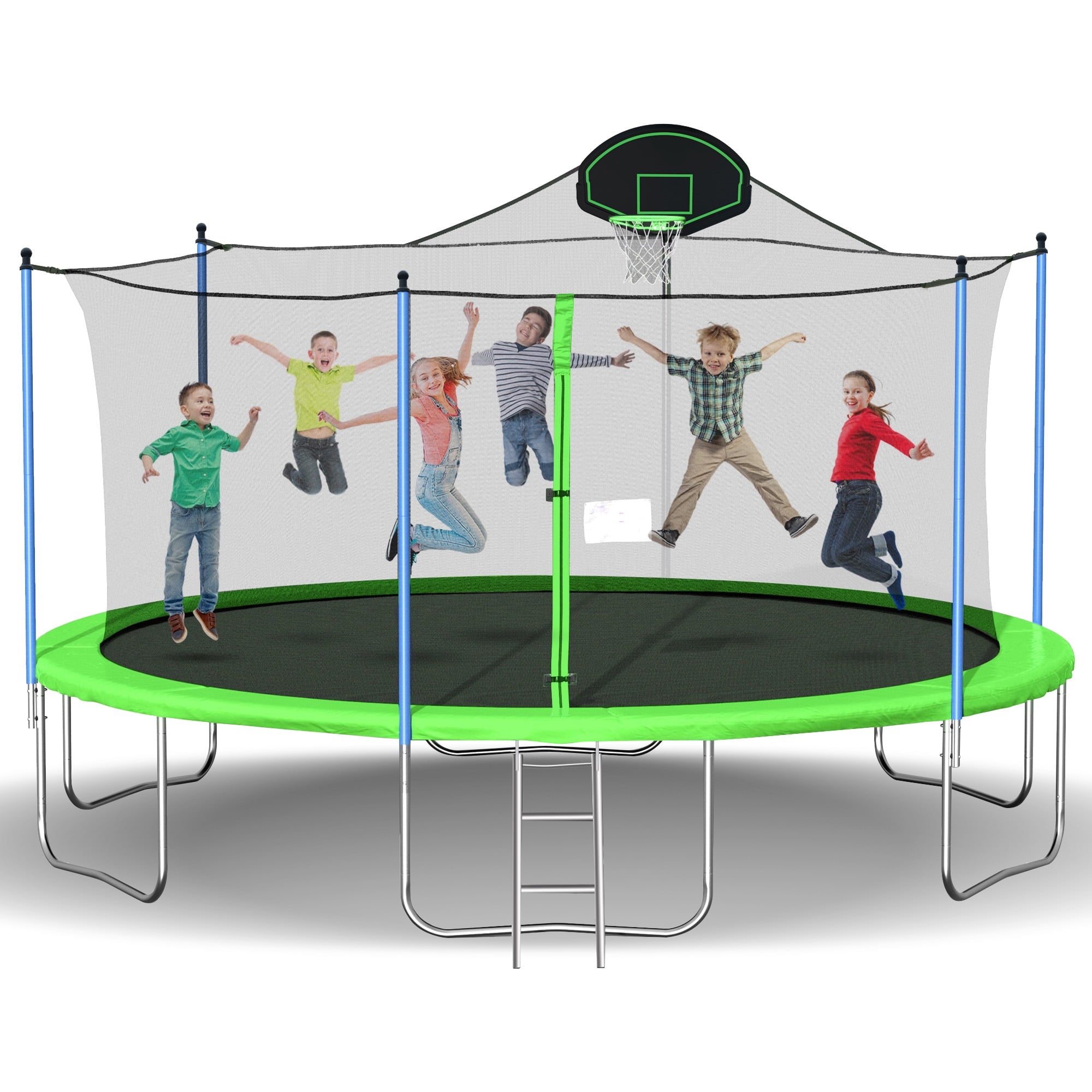 TRAMPOLINES WITH BASKETBALL HOOP – Jumping becomes even more entertaining with an included basketball hoop, keeping your kids busy and active all day long. With our trampoline, it’s not just about jumping—it’s also about scoring!