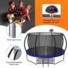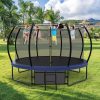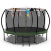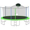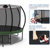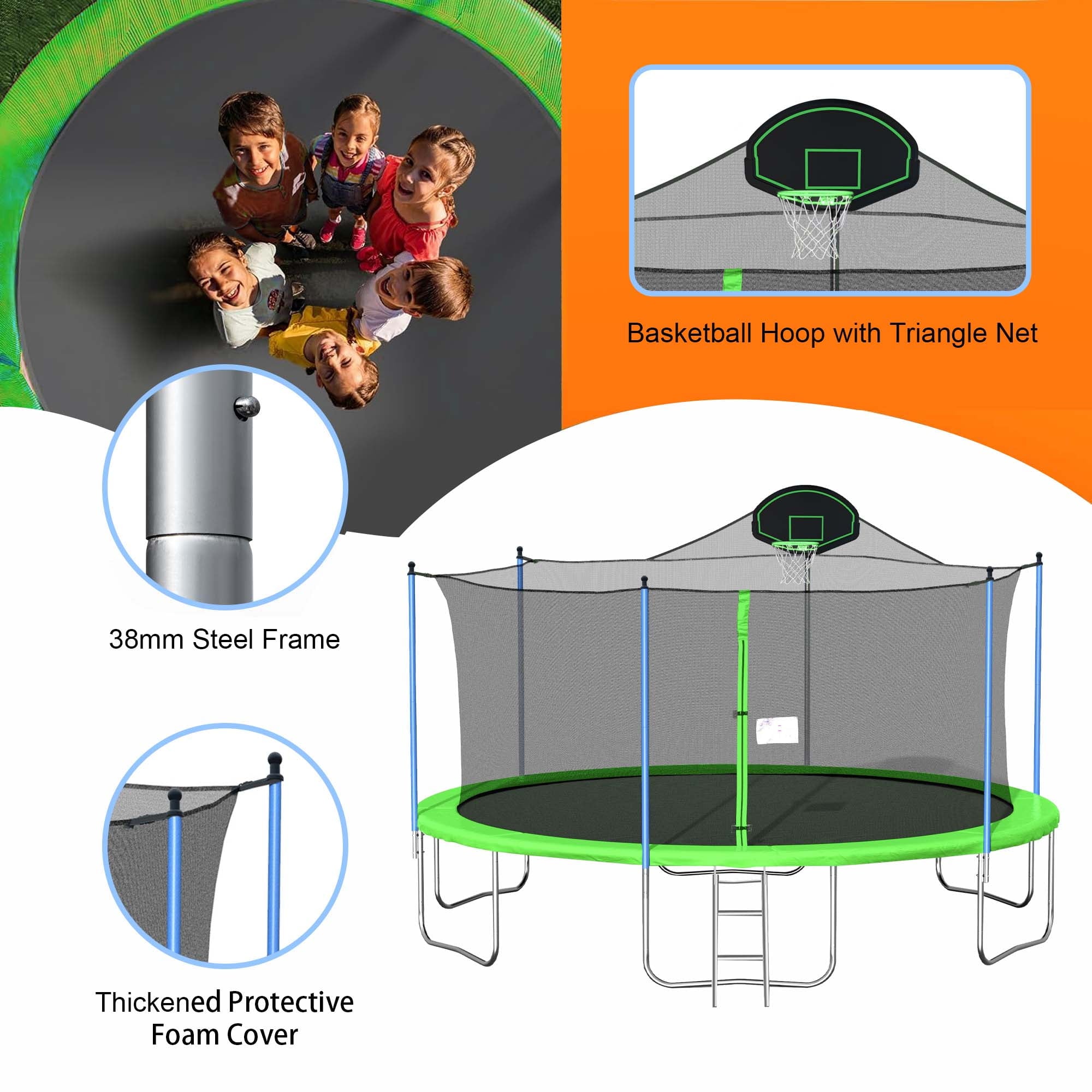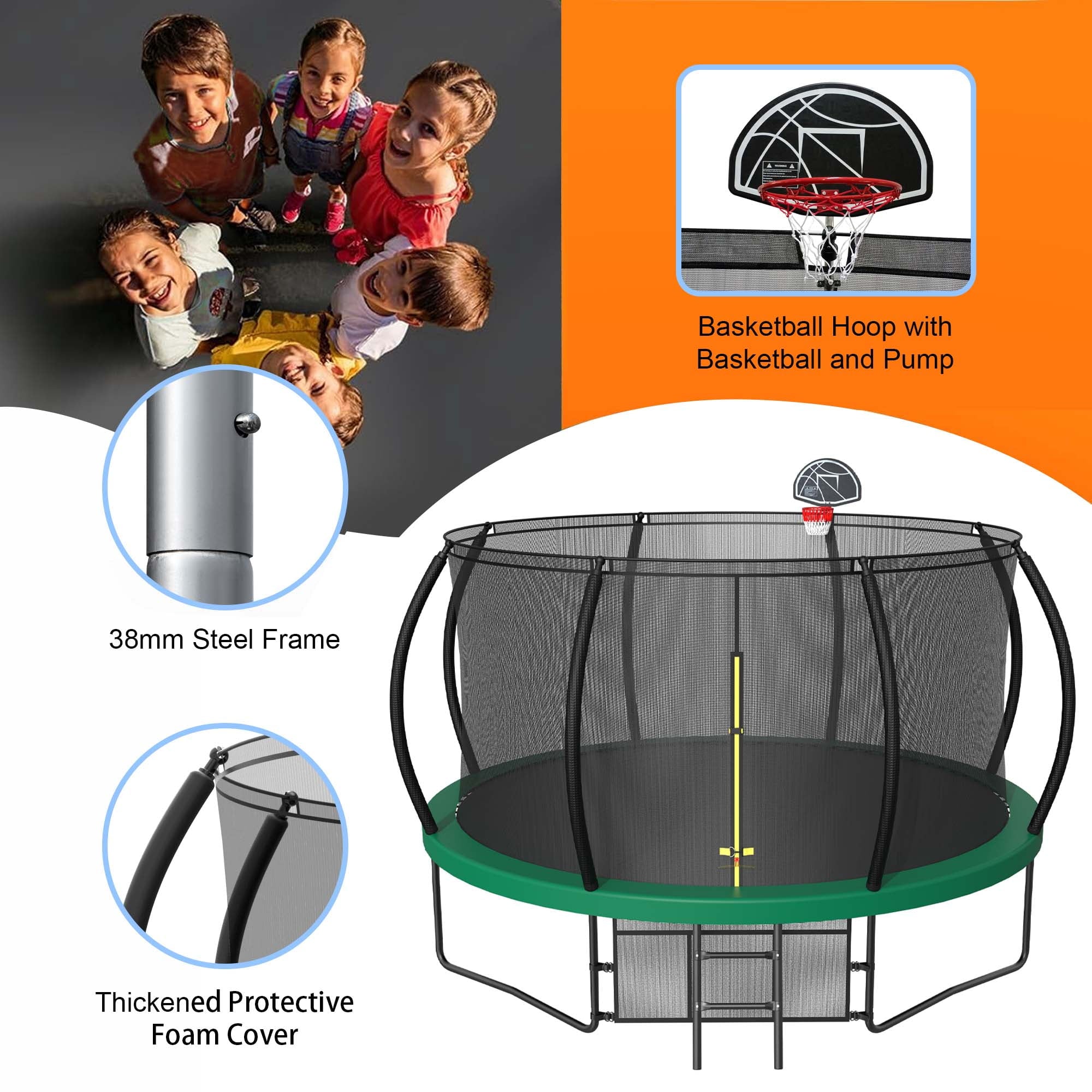The Aukfa AK-ST01-006 14FT trampoline with enclosures offers an exceptional level of safety with its Safely System. The 360-degree safety net, securely attached to the jumping mat, effectively reduces the risk of limbs falling through, making it an ideal choice for kids, adults. Additionally, it features a backboard, allowing you to play basketball on it. For an unparalleled bouncing experience, this outdoor trampoline boasts a high-strength mat woven together to withstand constant flexing. Its durable construction ensures a comfortable surface for jumping. There are 80 galvanized springs evenly stretched around the mat. This provides users with a smooth and highly responsive bounce, enhancing the overall bouncing experience. The heavy gauge galvanized steel frame and 4 W-shaped legs provide a stable base for the jumping zone. Pumpkin trampoline comes equipped with a rust-resistant steel 2-step ladder, allowing users to easily and safely access the trampoline. The full enclosure features a zipper door for effortless entry and added peace of mind.