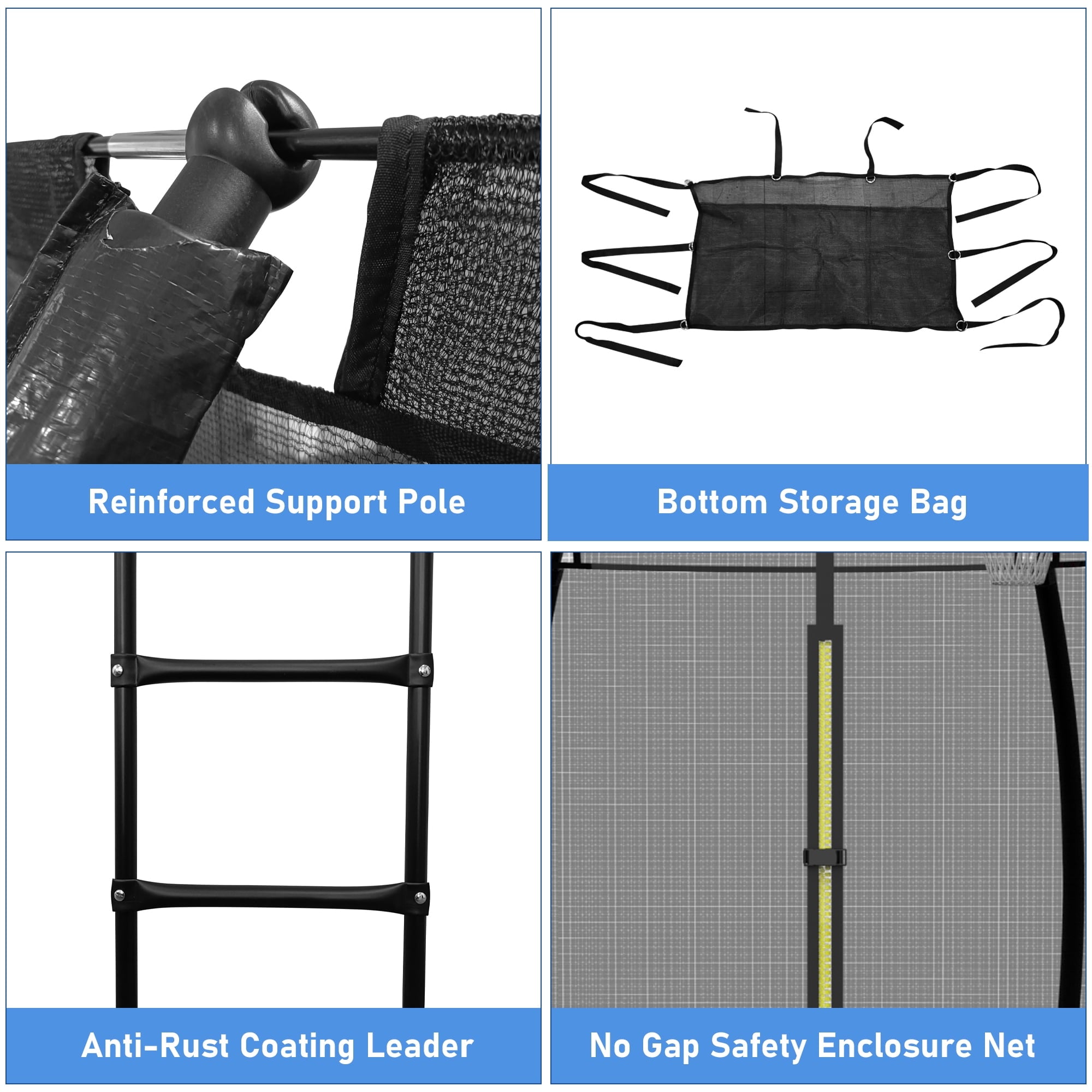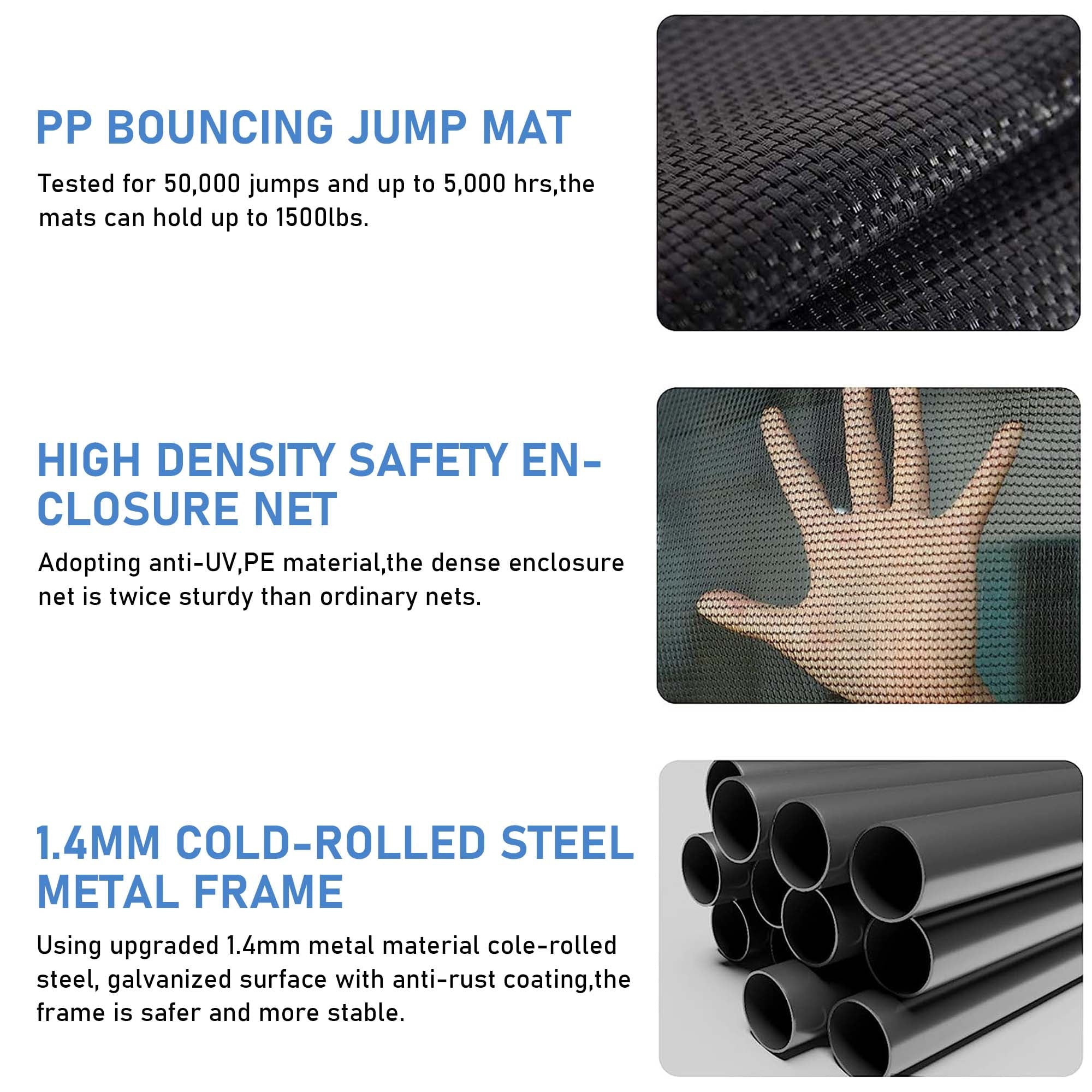360-DEGREE SAFELY SYSTEM – This 14FT trampoline with enclosures for kids adults features a comprehensive safety net securely attached to the jumping mat all around, reducing the risk of an arm or leg falling through. Full enclosure with a zipper door surely lends you peace in mind, the rust-resistant steel 2-step ladder helps you get onto your trampoline quickly and safely.