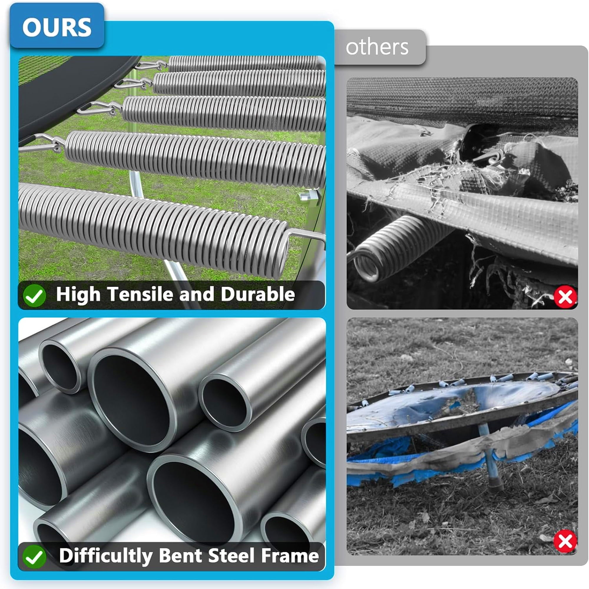 EXPERIENCE PREMIUM BOUNCING – Aukfa outdoor trampoline offers a top-tier bouncing experience with 80 evenly distributed galvanized springs on a high-strength mat, ensuring both durability and a comfortable landing. Its durable and stable construction features a heavy-gauge galvanized steel frame with 4 W-shaped legs for a solid base. The noise-reducing, press-fitted joins enhance longevity and reduce wear and tear. The total bearing up to 1320 lbs. The maximum user weight limit is up to 330 lbs.