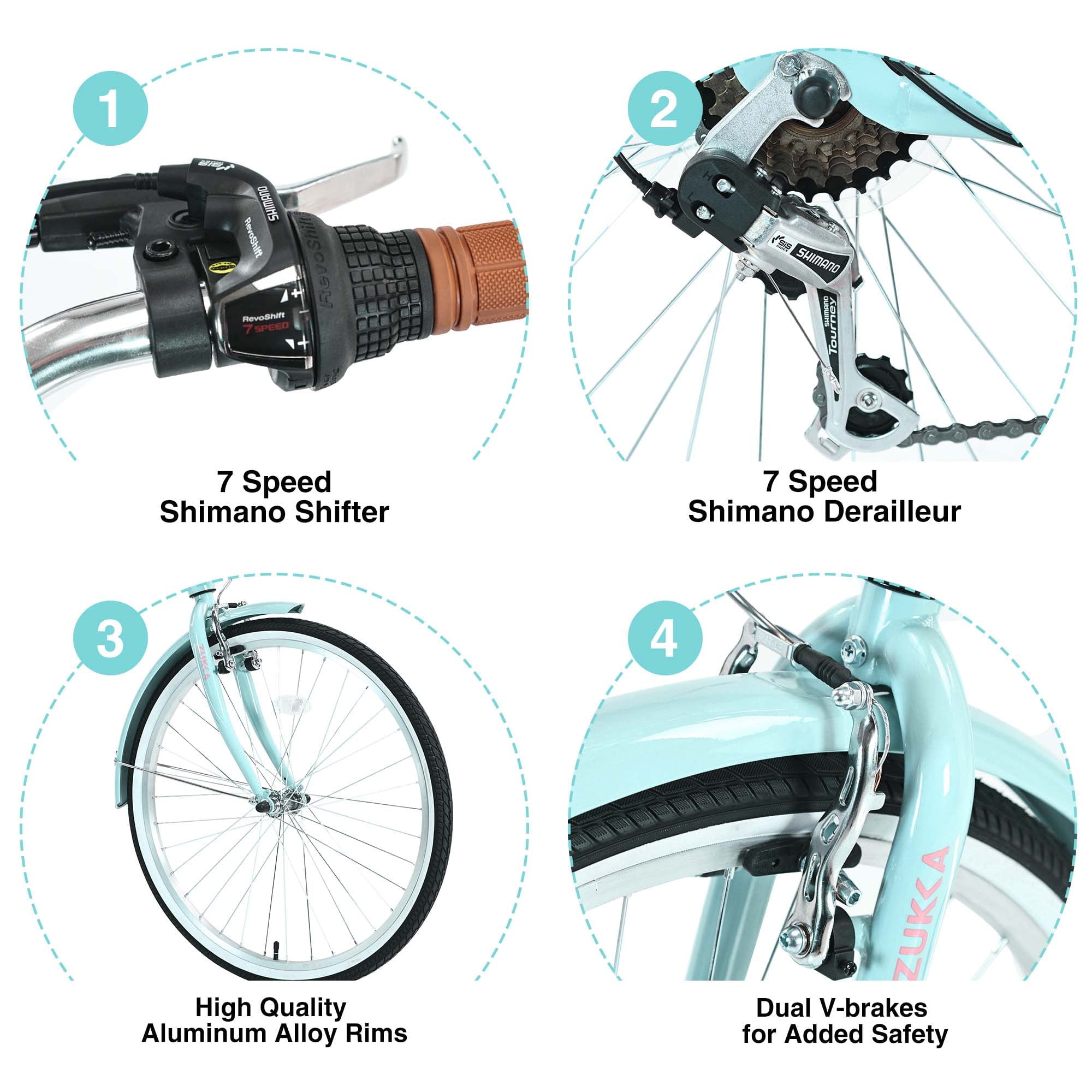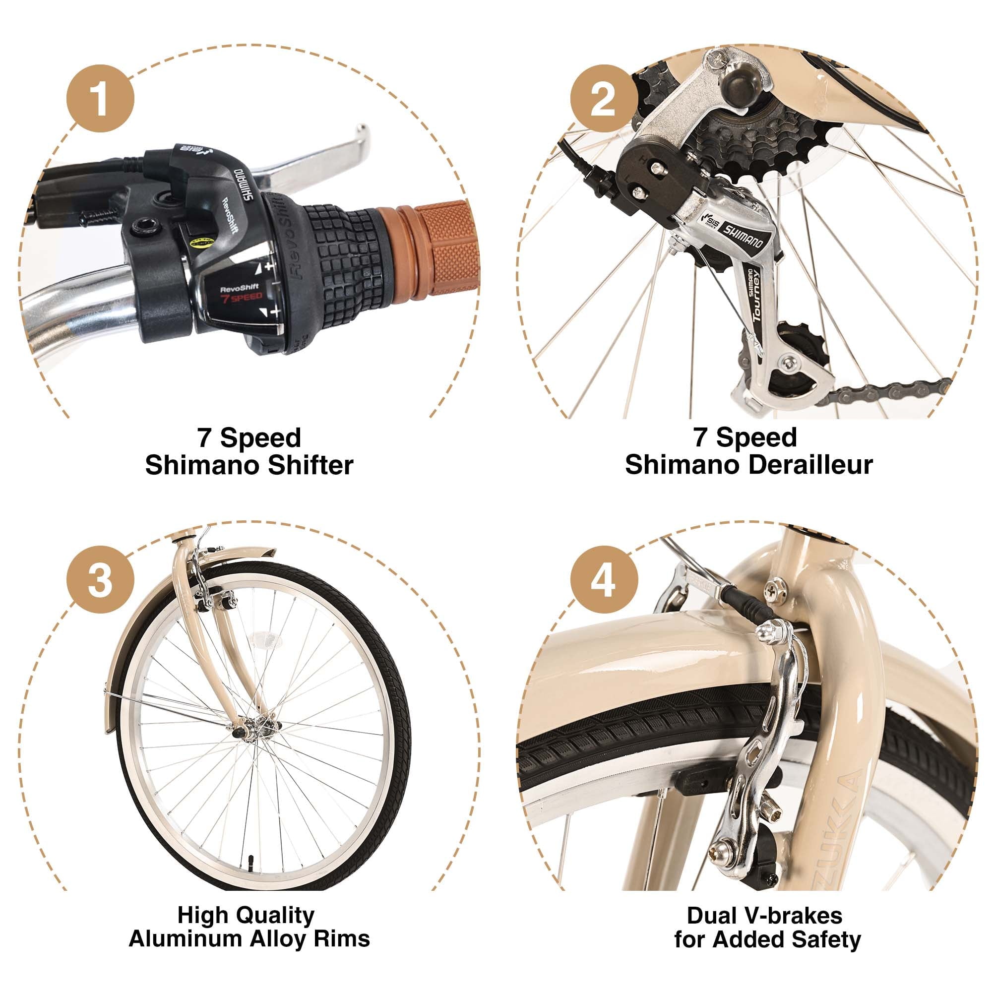 - SEAMLESS GEAR TRANSITION- Enjoy the convenience of a Shimano 7-speed shifter and derailleur system, allowing you to effortlessly switch between leisurely rides and longer commutes with ease.