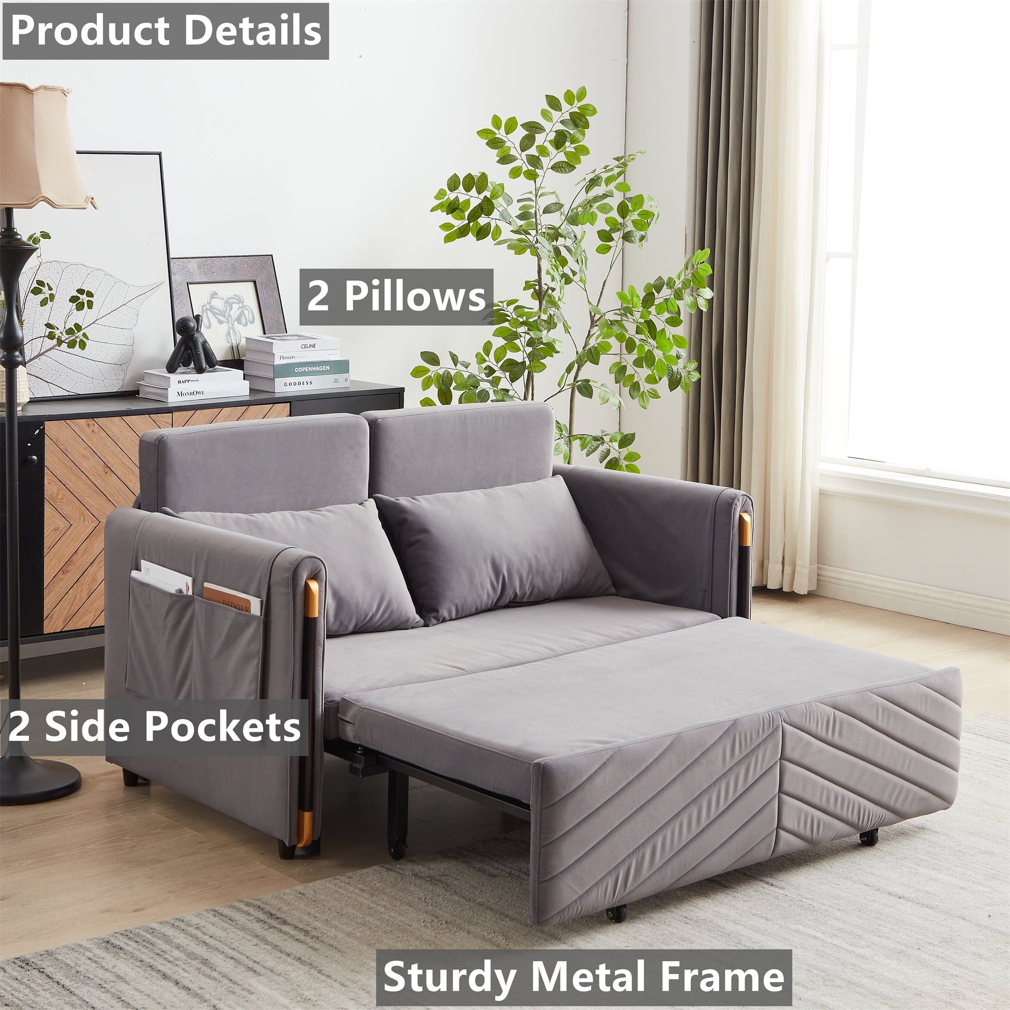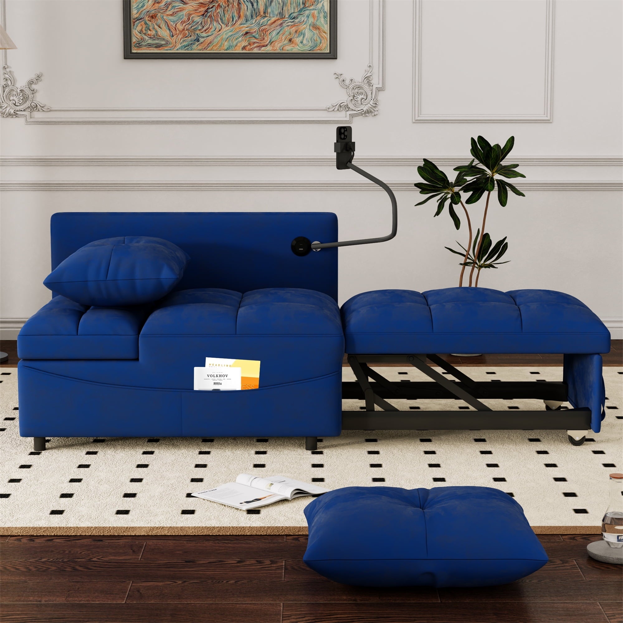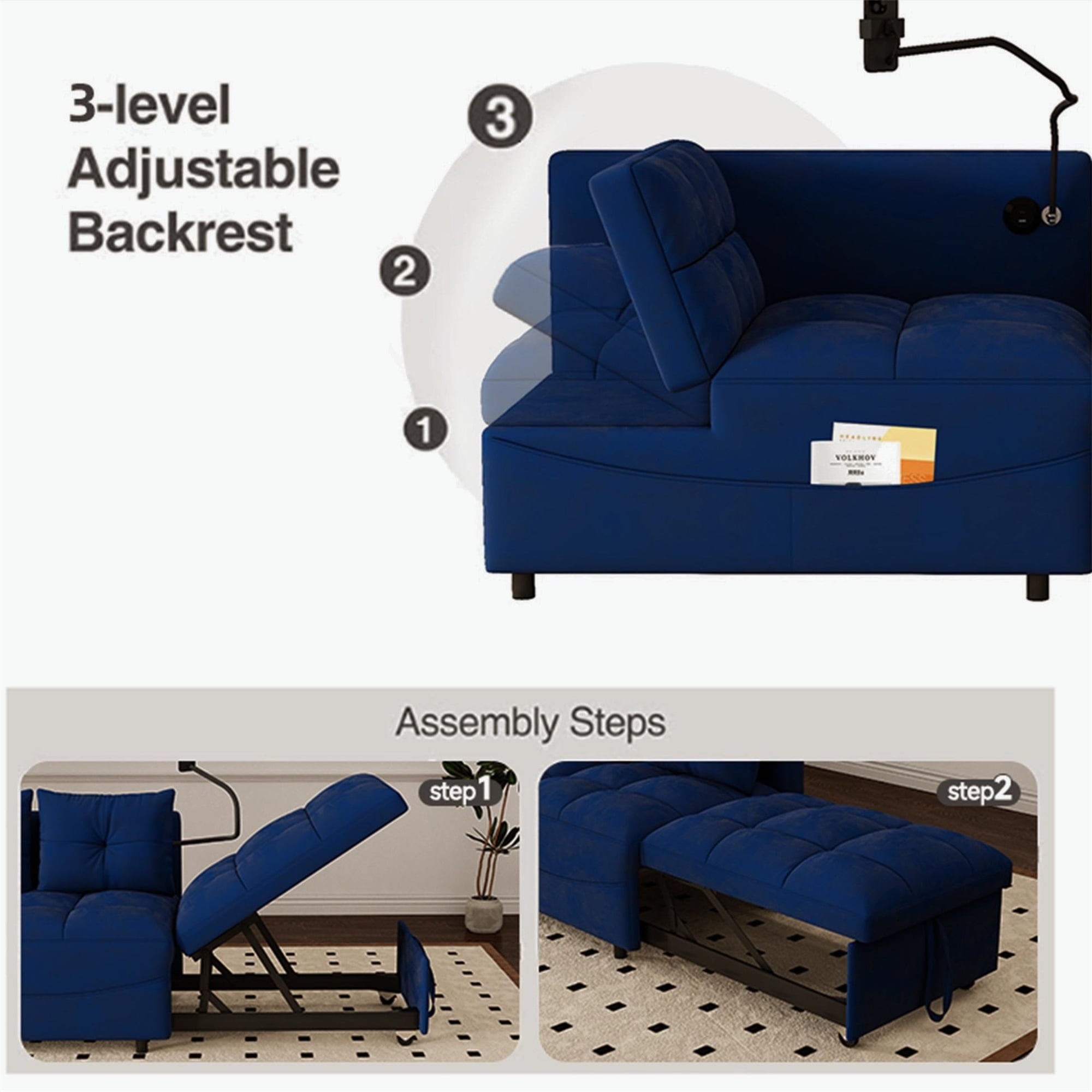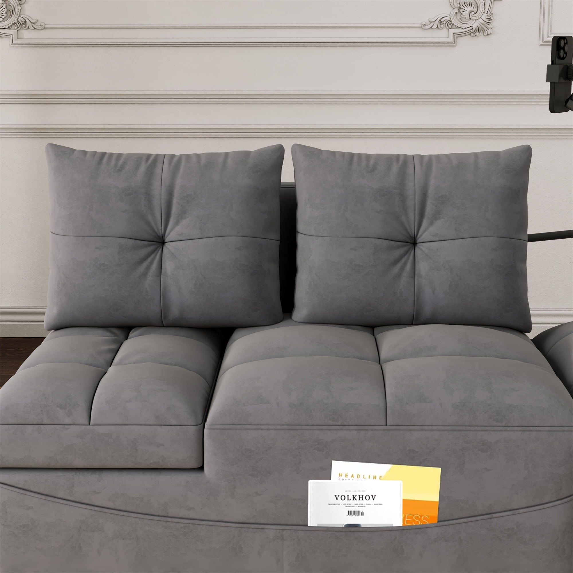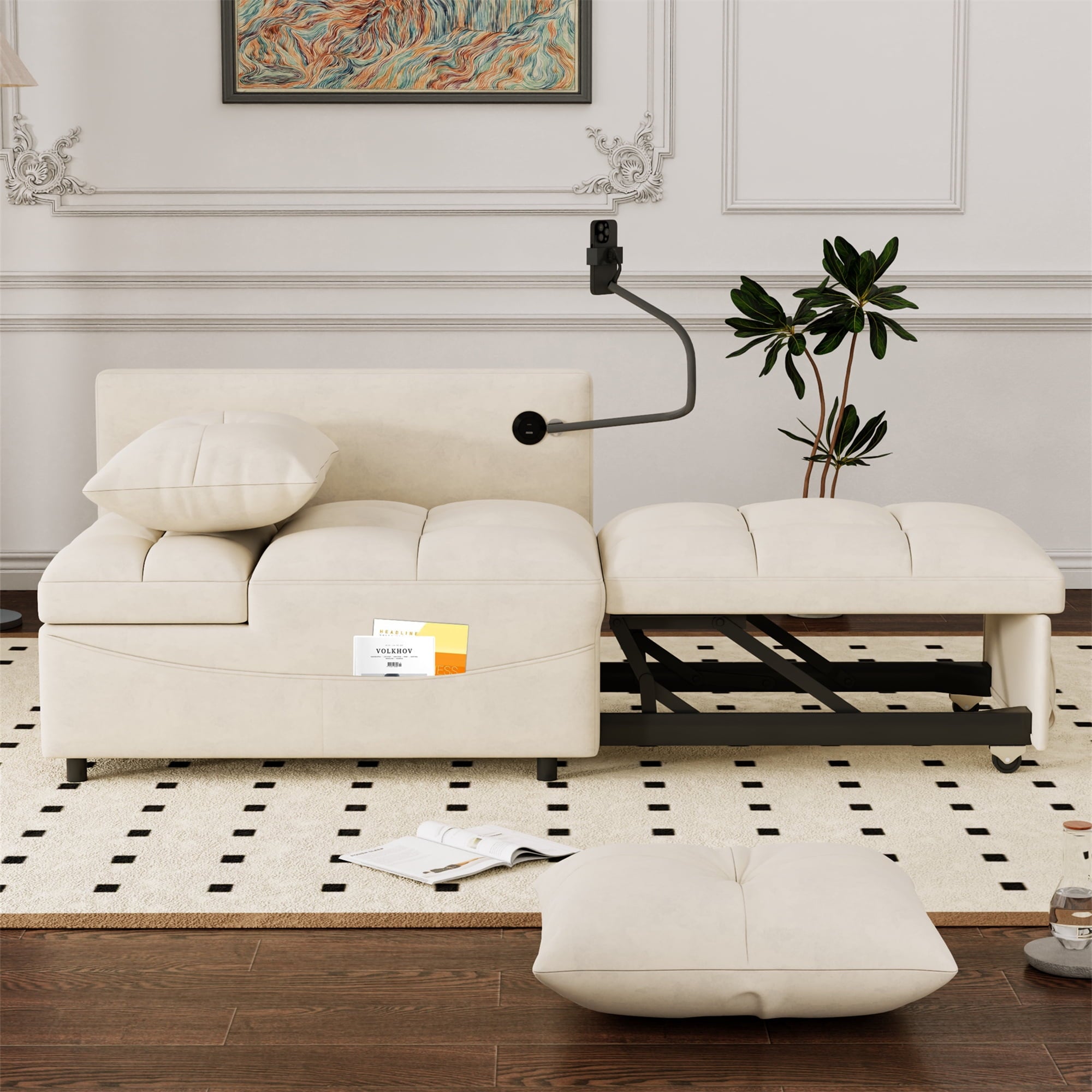 - 2 USB CHARGE & PILLOWS – This chaise sofa bed is equipped with 2 integrated USB ports for convenient device charging. Comes with two throw pillows, paired with high-elasticity foam and high-gauge pocket springs. Delivers exceptional lumbar support, keeping you relaxed whether sitting for hours or lying down.
