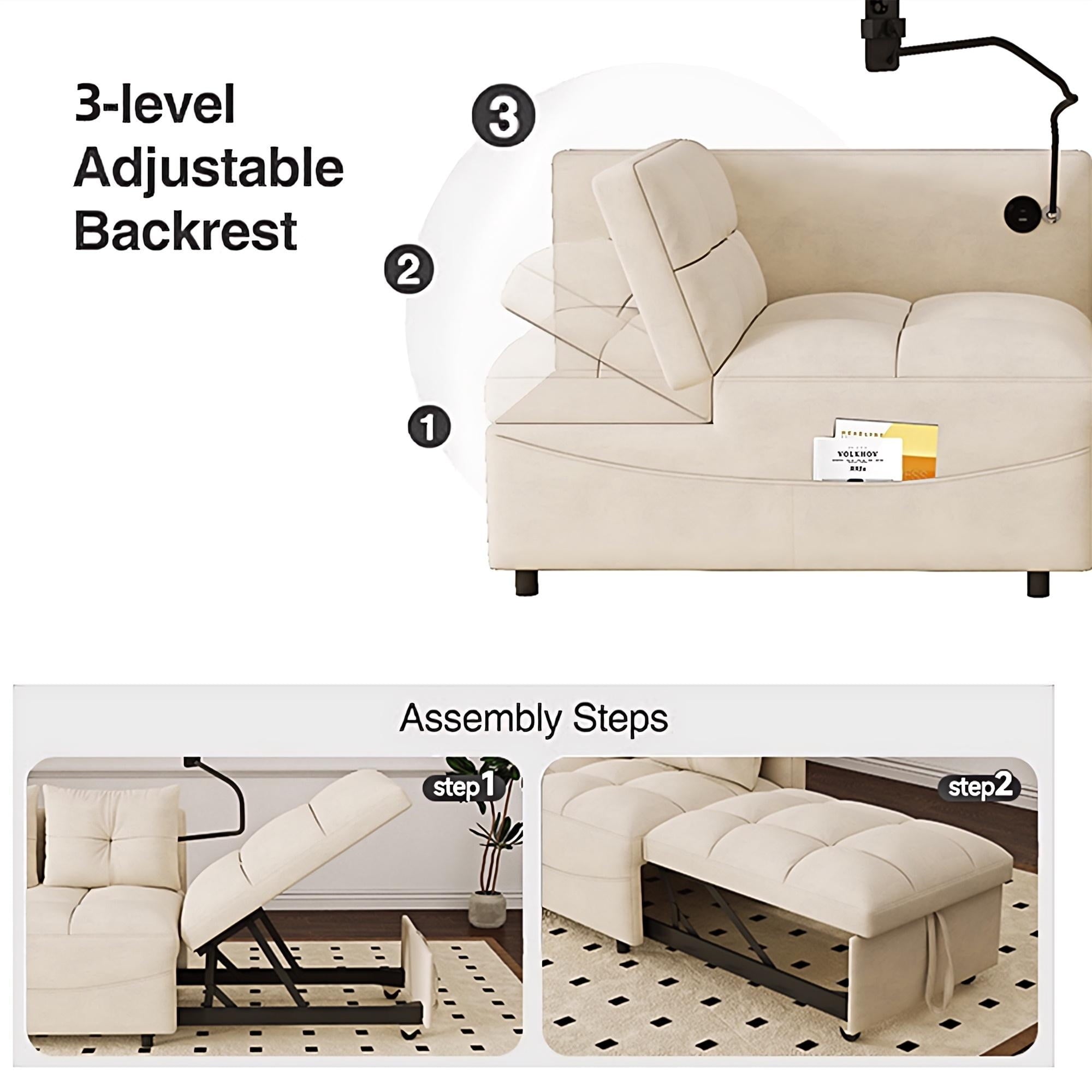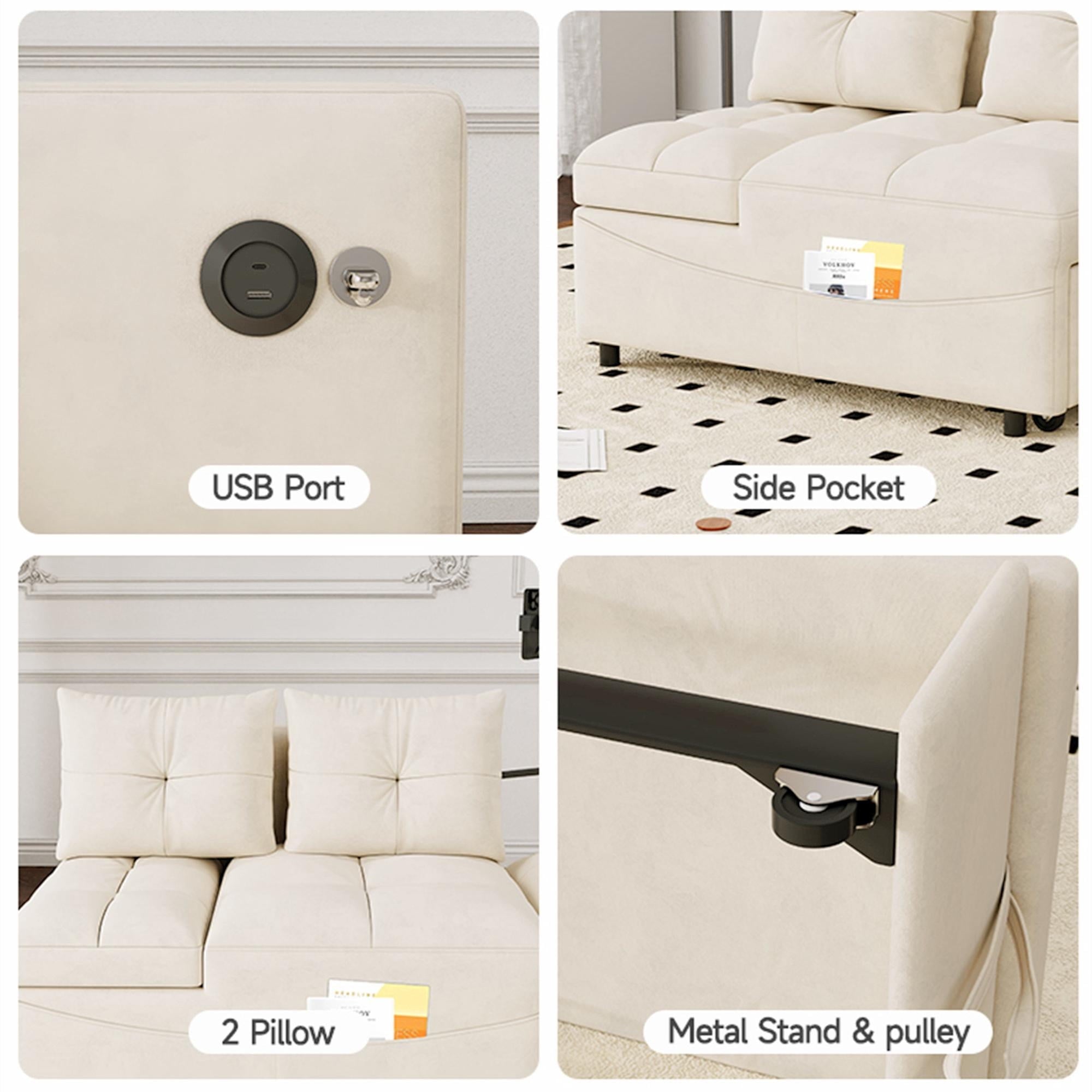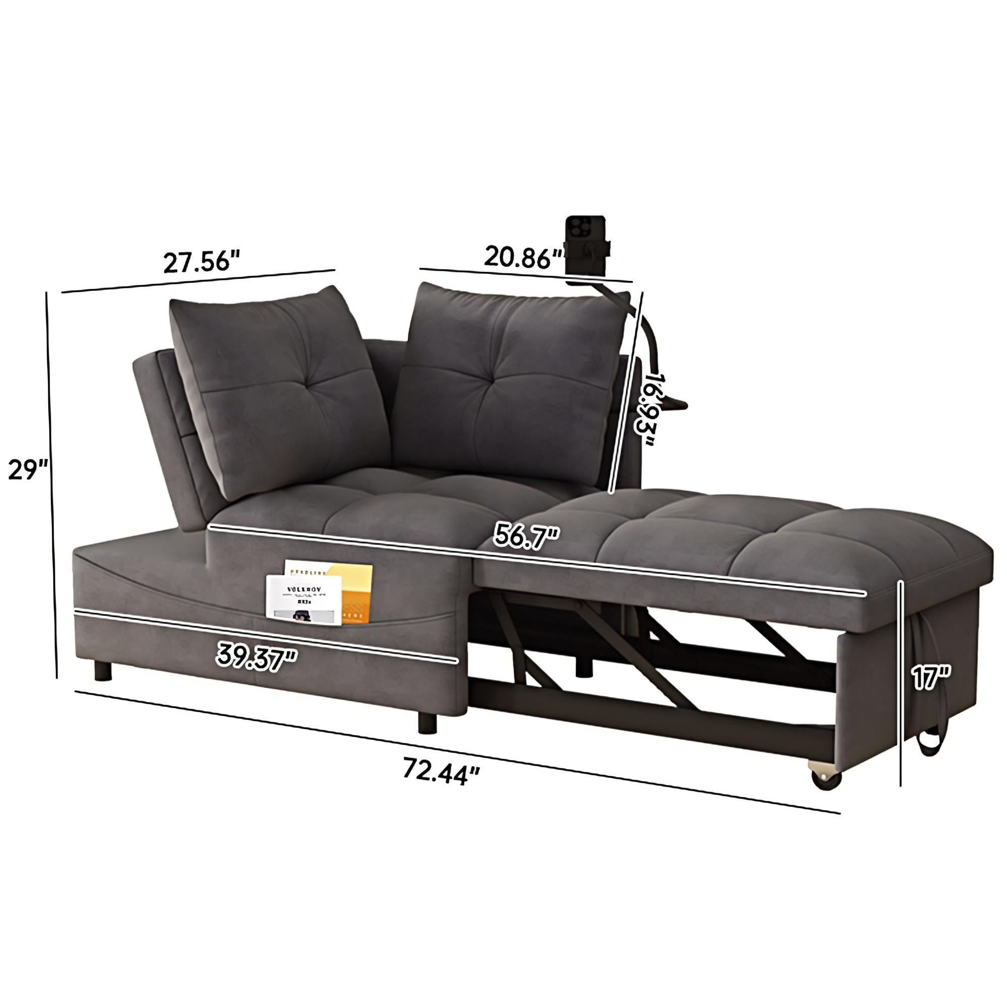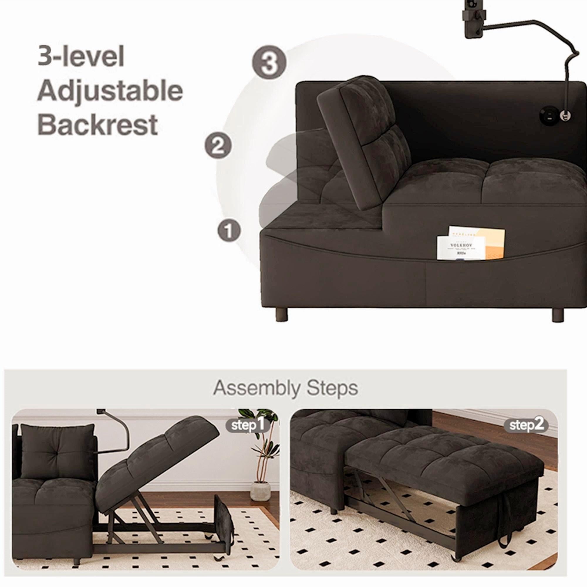 a pull-out part, allowing for easy transformation from a loveseat sofa to a chaise longue, or a twin size sofa bed. This chaise sofa bed is equipped with 2 integrated USB ports for convenient device charging. Its versatility can help you arrange