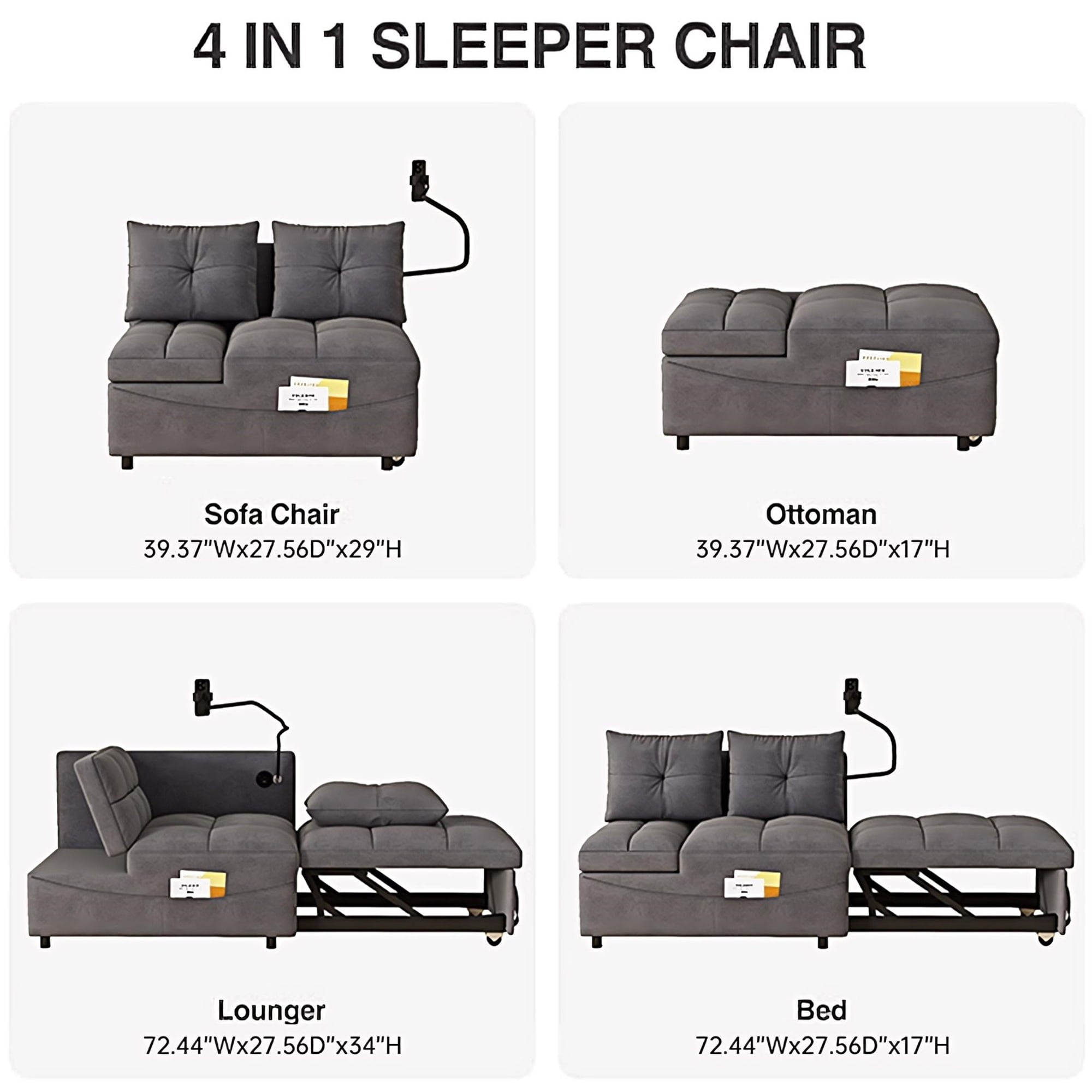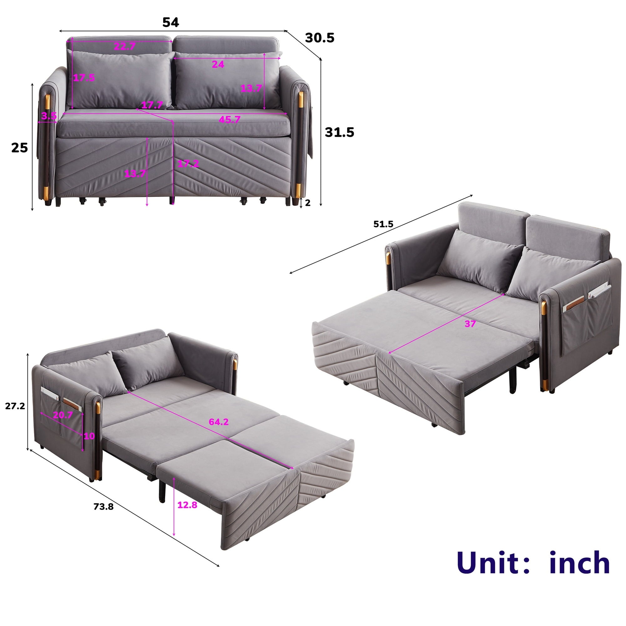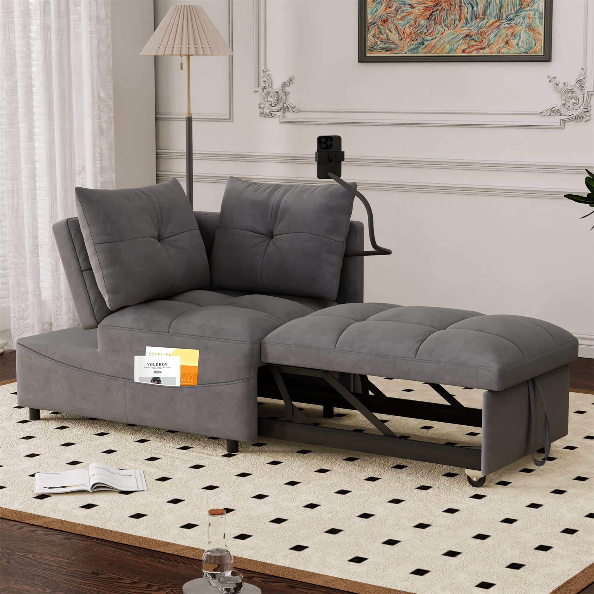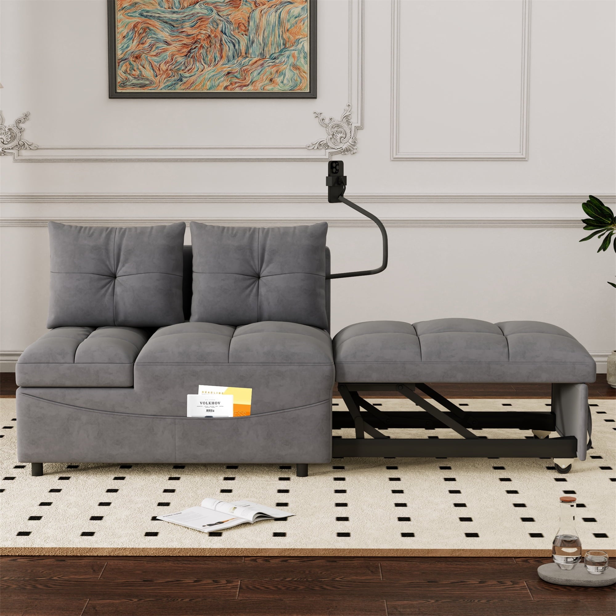 a pull-out part, allowing for easy transformation from a loveseat sofa to a chaise longue, or a twin size sofa bed. This chaise sofa bed is equipped with 2 integrated USB ports for convenient device charging. Its versatility can help you arrange