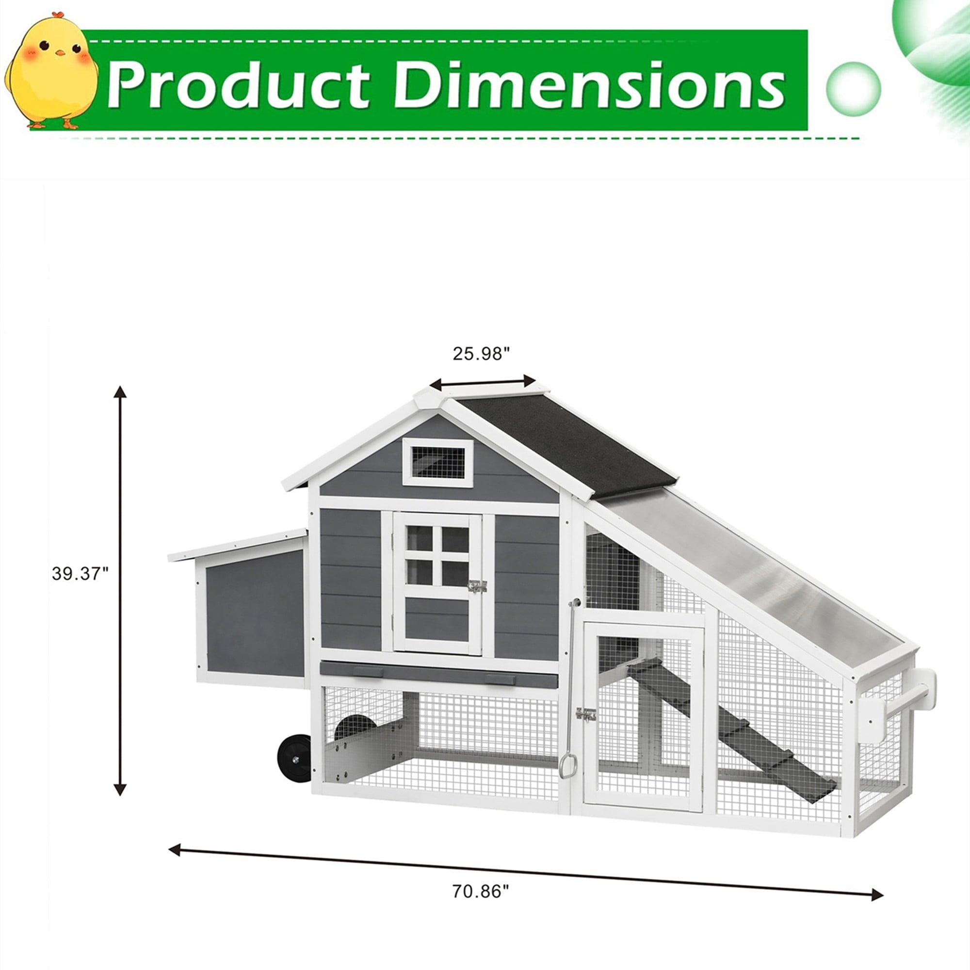 - Overall Dimensions – 70″ L x 27.9″ W x 35″ H. Capacity: 4-6 adult chickens. Also suitable for chickens, rabbits, ducks and other small animals.