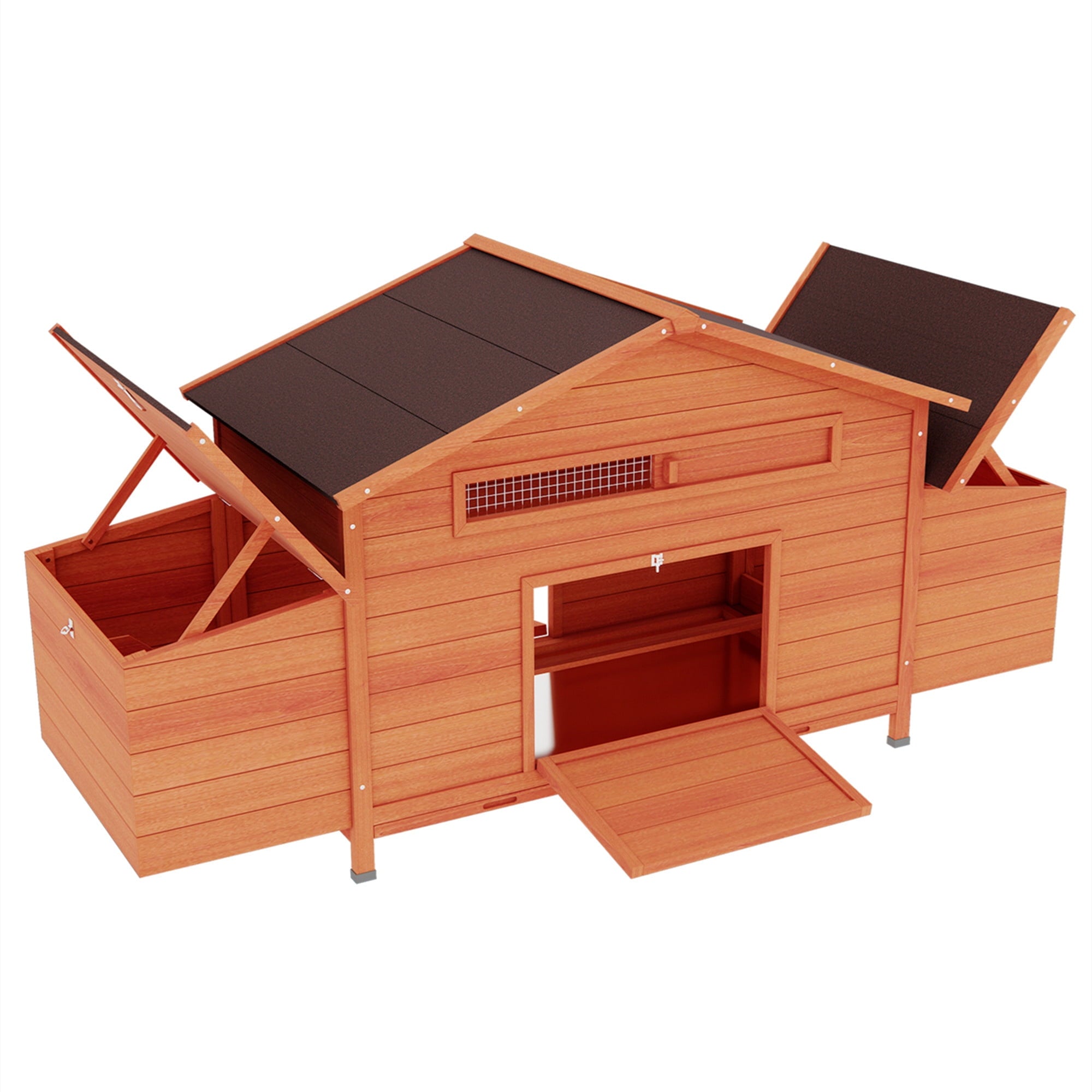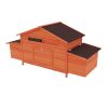 The AK-PC01-013 large chicken coop is constructed of premium natural fir wood and painted with non-toxic varnish, the original wood is firm and natural for your beloved pet. The chicken house features two nest boxes with four compartments, chicken perch
