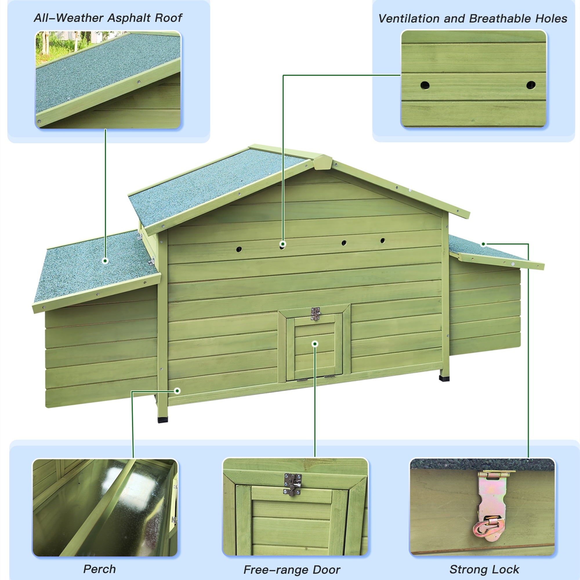 - SAFE MATERIAL – The large chicken coop is constructed by premium natural fir wood and painted with non-toxic varnish, the original wood is firm and natural for your beloved pet.