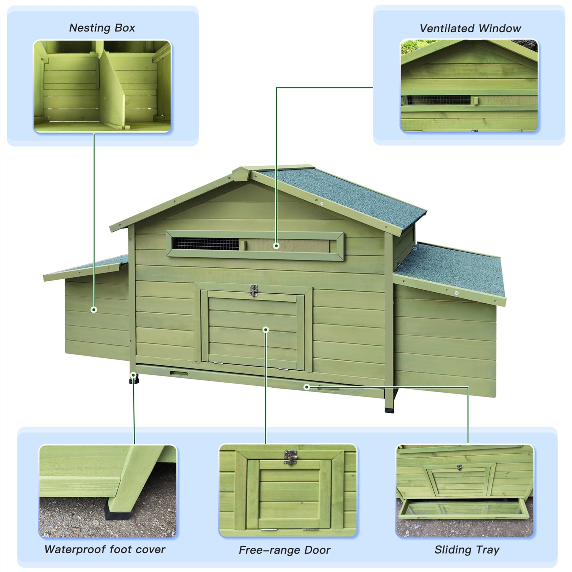 PVC roofing. 2 Free-range Doors to maintain good air circulation and easy access to your lovely chicken. The reasonable construction contributes to the health of the chickens and thus increases the productivity of the chickens. 100% solid wood panel