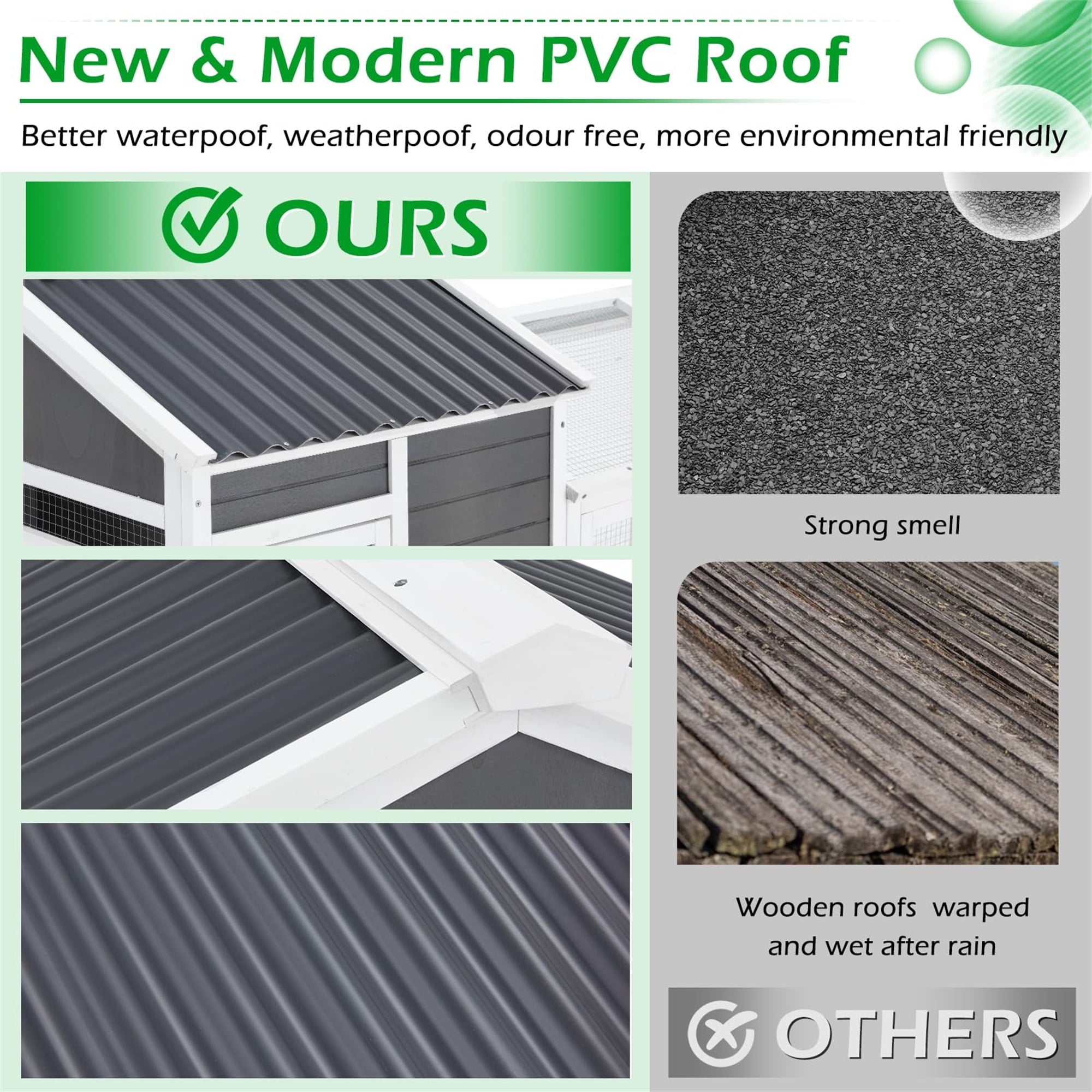 - WATERPROOF ASPHALT ROOF – The roof of the AK-PC01-013 wooden chicken coop is made of asphalt + solid wood planks, making the roof stronger, safer and noise-free than PVC roofing. (The roof made of PVC can make a loud noise on rainy days, which can easily scare the chickens) and make your chickens feel safe even in bad weather.
