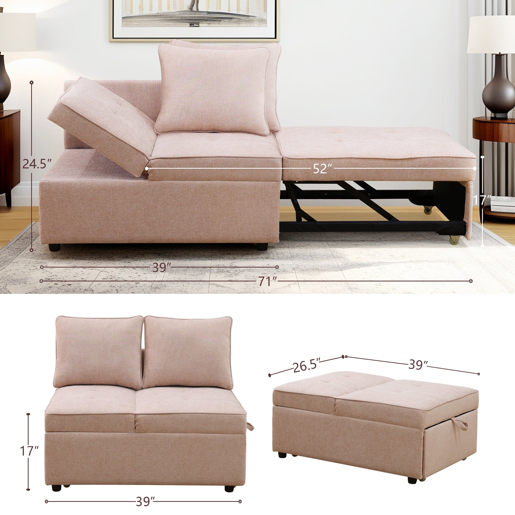- EASY TO ASSEMBLE – The couch bed can be assembled without other tools in 10 minutes. Dimensions: Ottoman: 39″ x 26.5″ x 17″, Sofa: 39″ x 26.5″ x 27″, Chaise Lounger: 71″ x 26.5″ x 31.5″, Bed: 71″ x 26.5″ x 17″. Please contact us by Email for any questions, our friendly service team will reply to you in 24 hours.