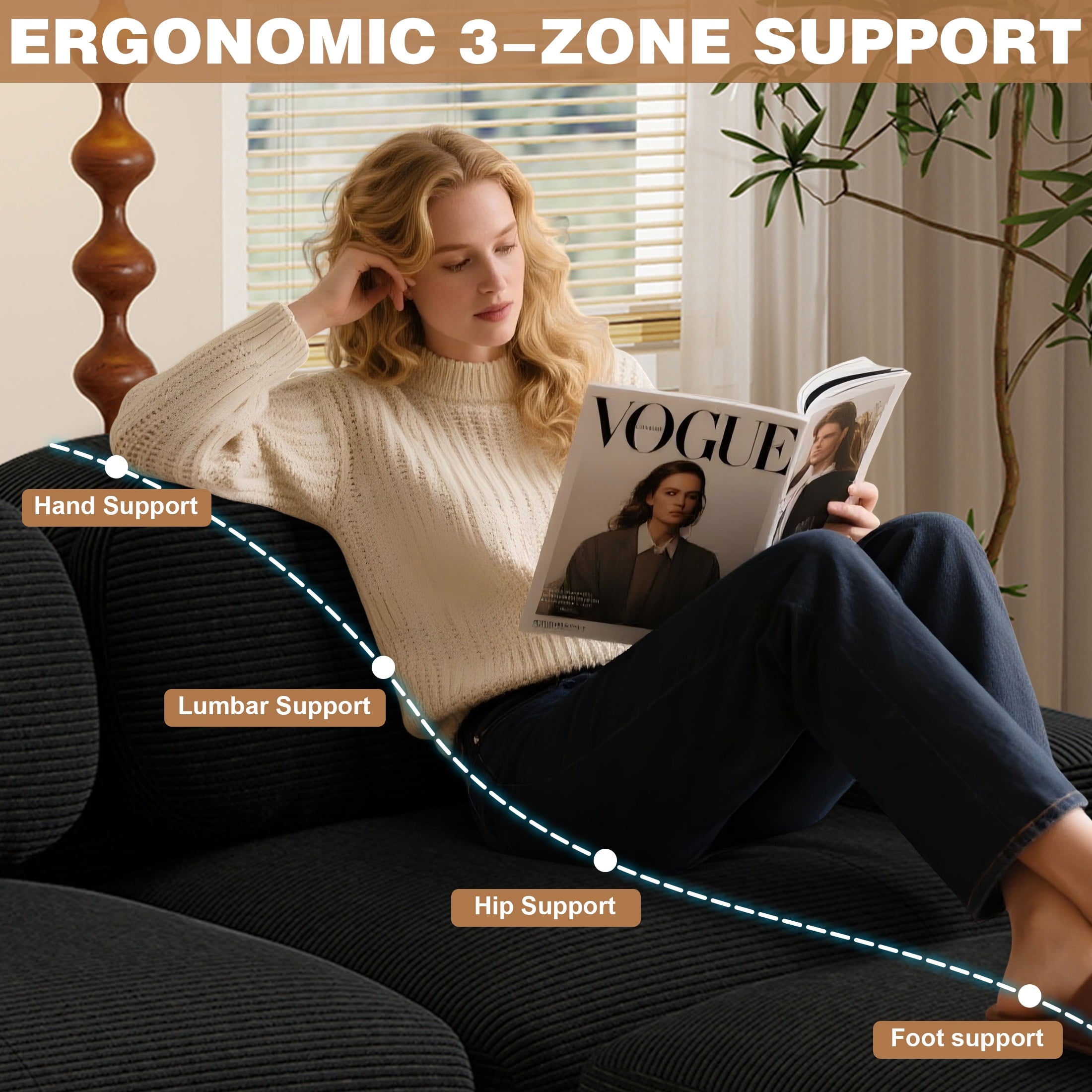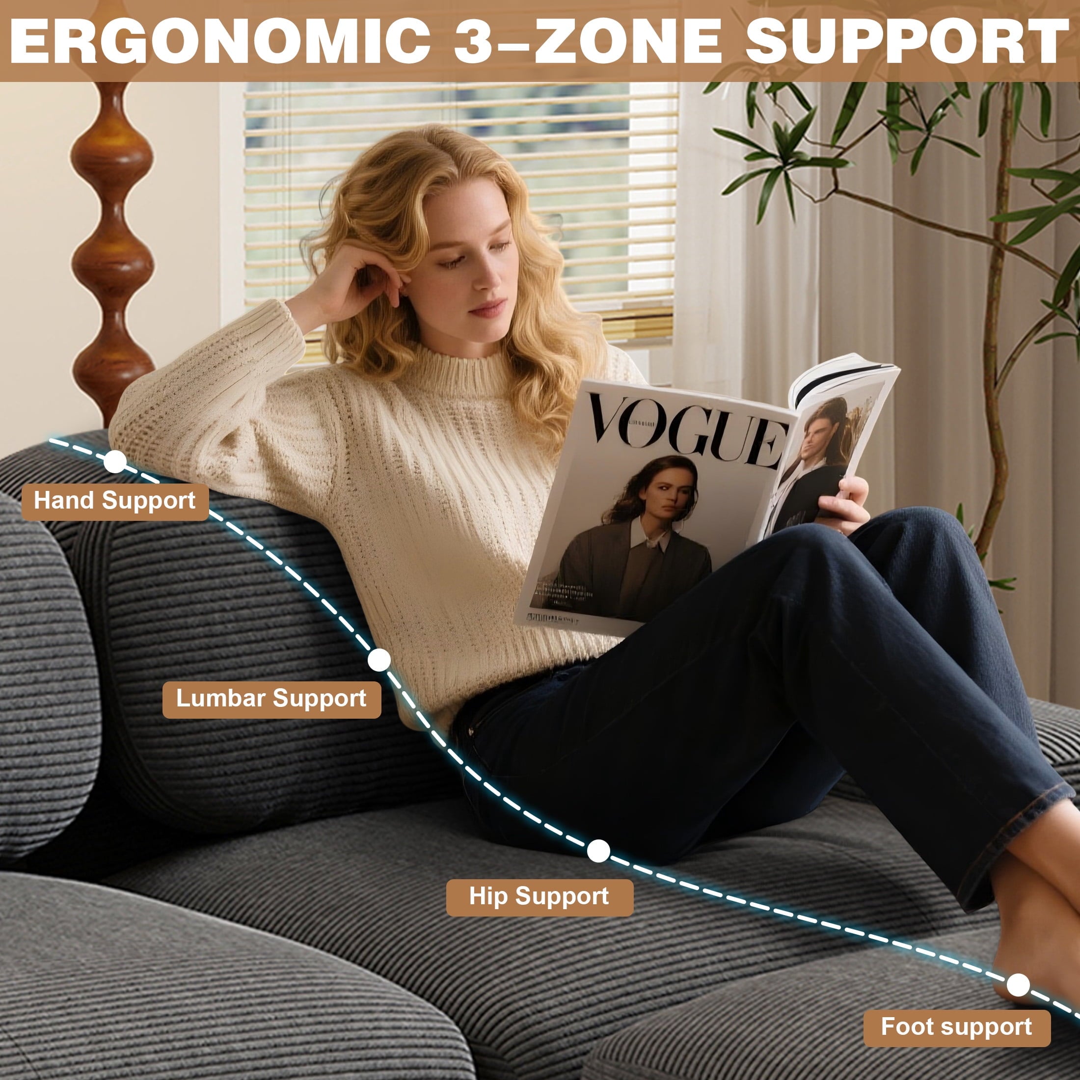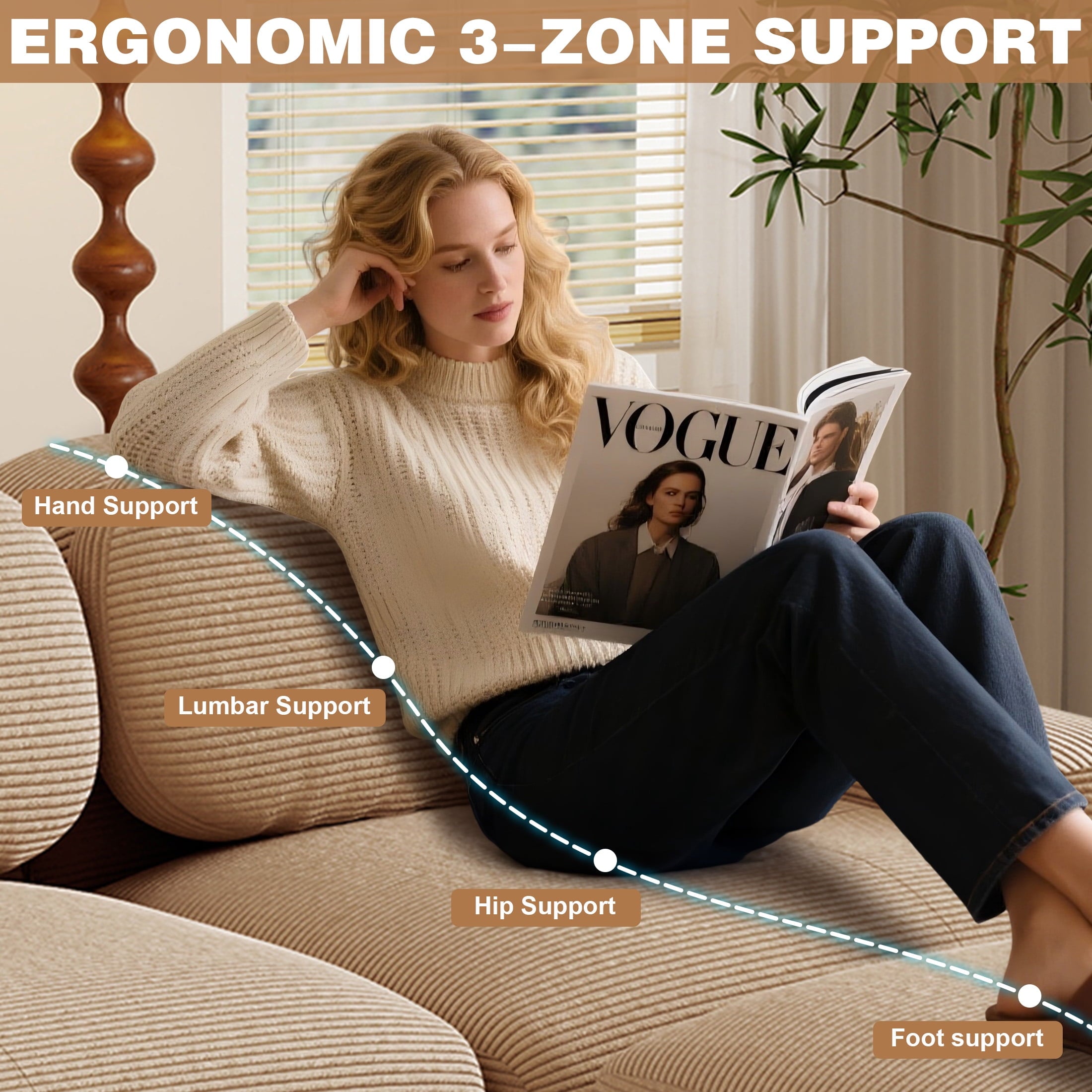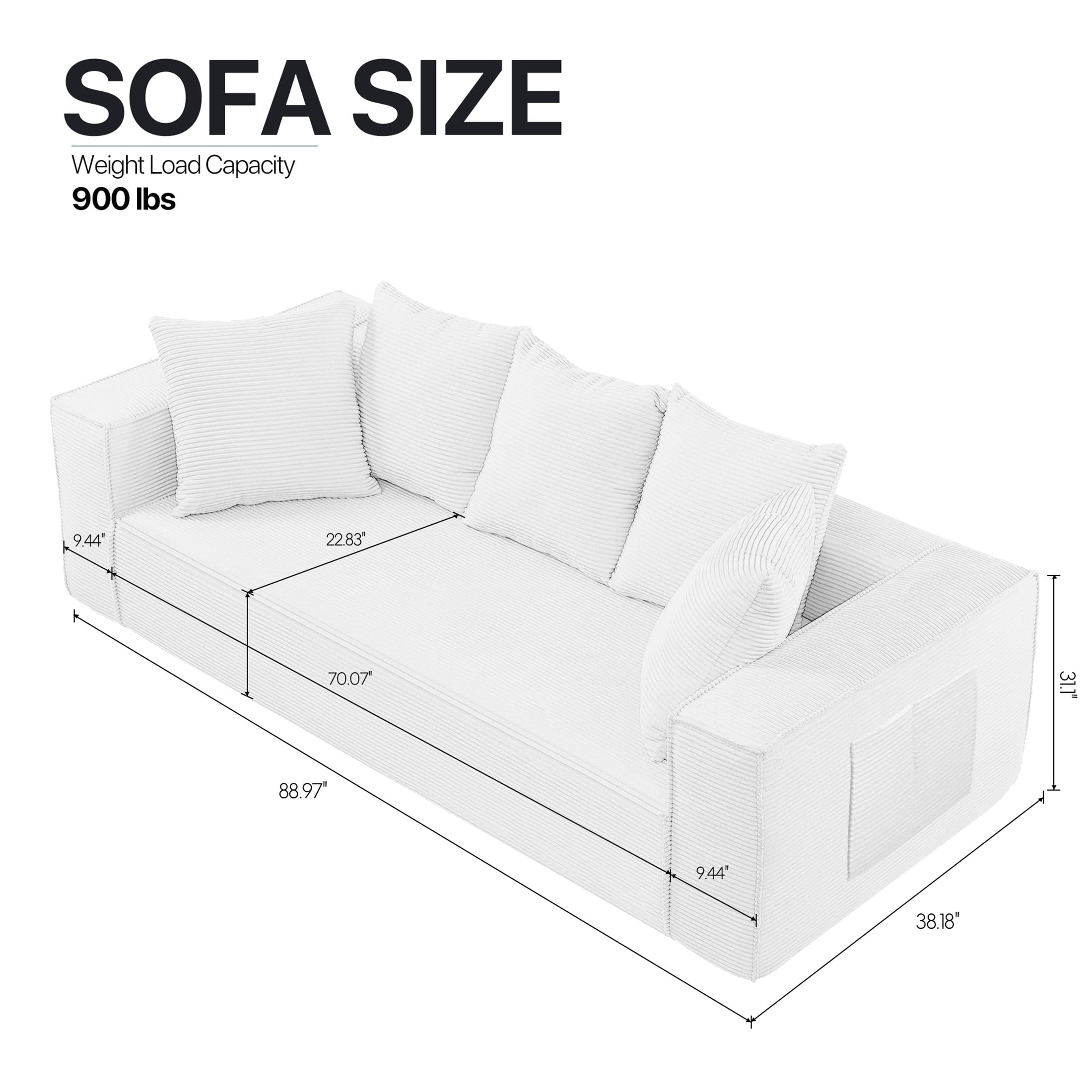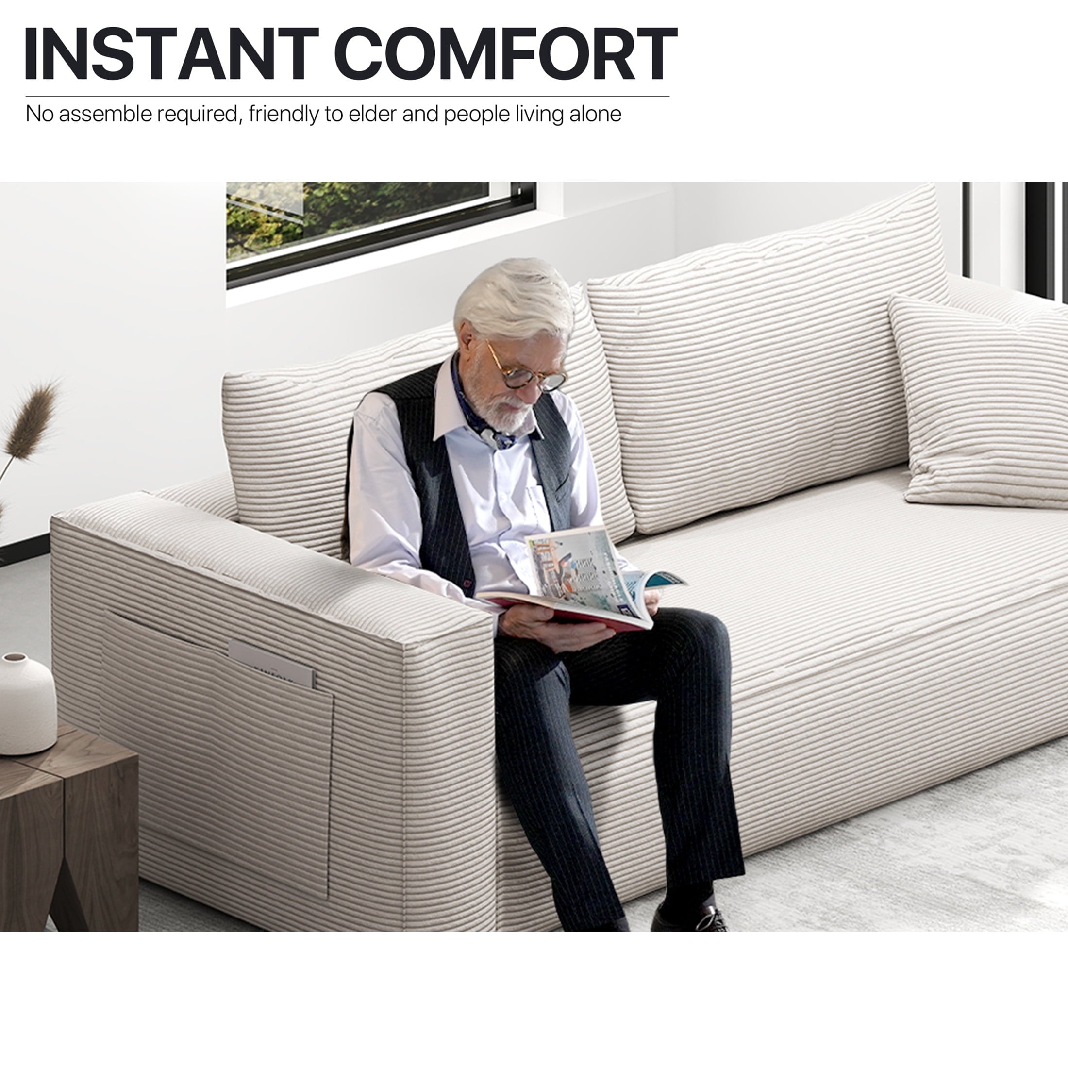 • Stable Base and Oversized Armrests: The non-slip base grips the floor to prevent shifting during daily use. The extra-wide, curved armrests provide natural elbow support and can also be used to hold books or remotes. This comfortable sofa option combines style, safety, and practicality for everyday living.