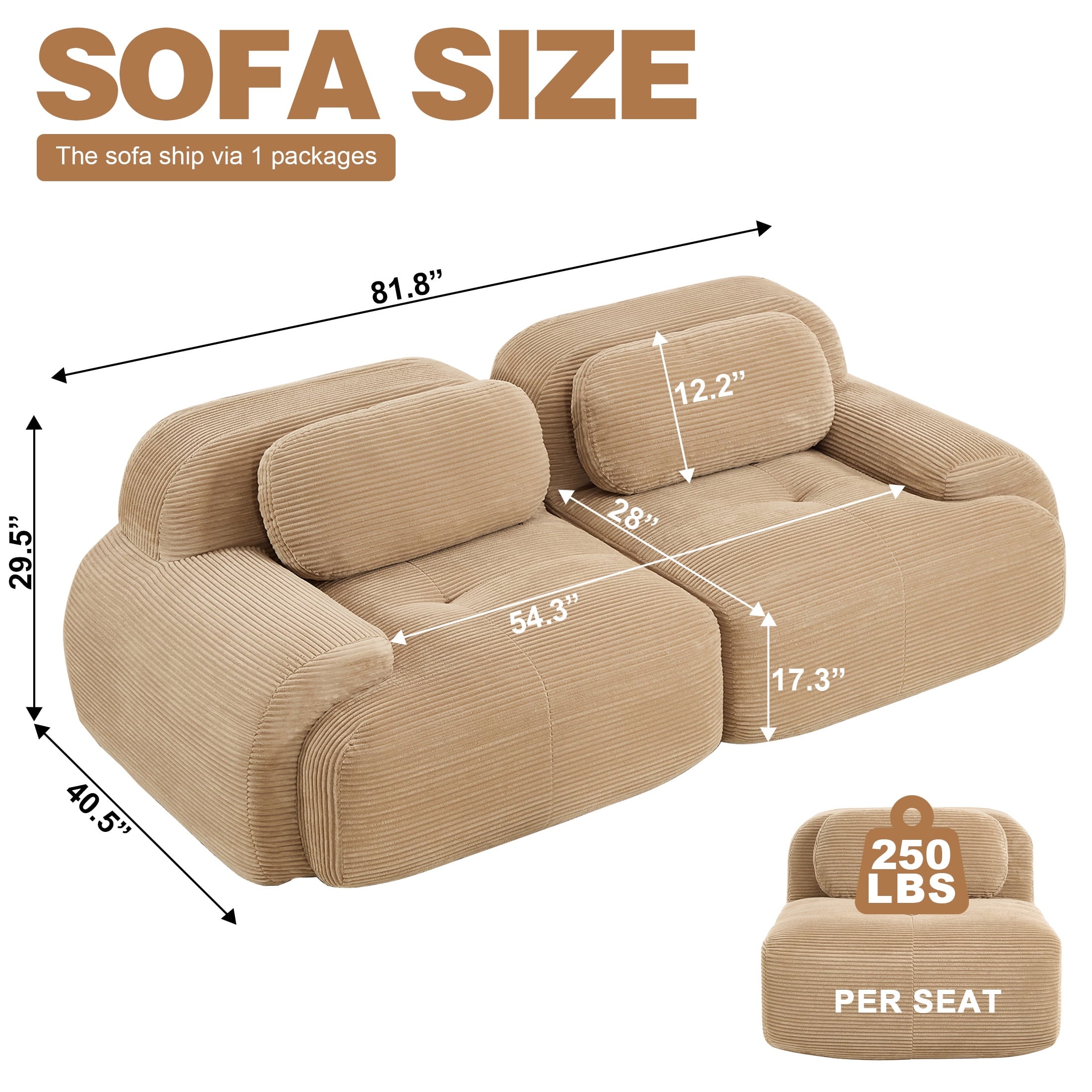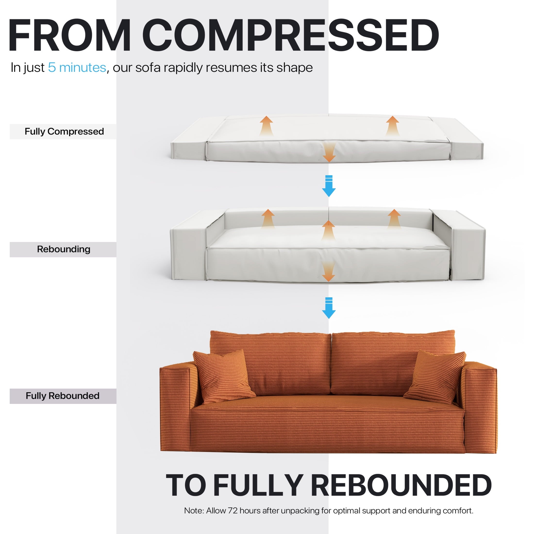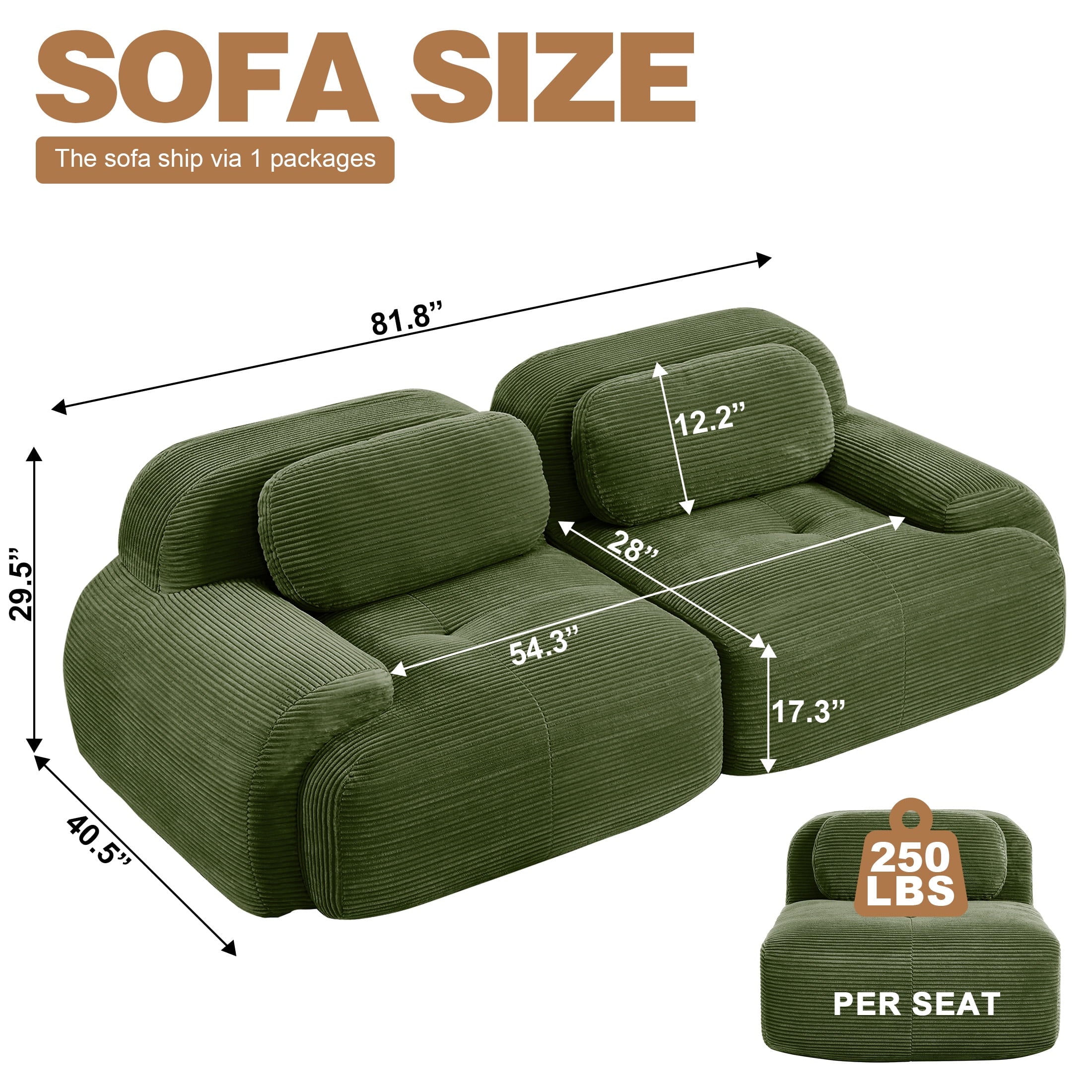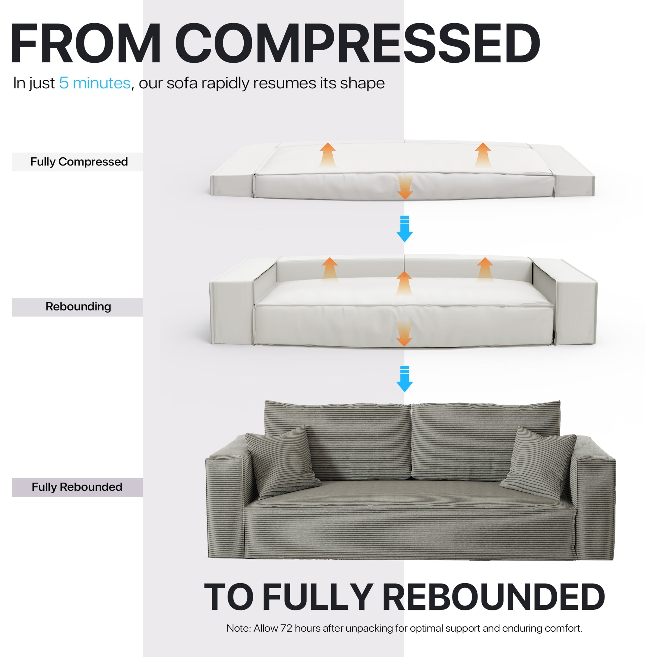 • No Assembly & Fast Rebound Notice: This loveseat is delivered vacuum-packed to optimize shipping space. Simply unpack and pat each section, then allow 3 to 7 days for the foam to fully expand to its intended height. This design is compatible with sleeper sofas and arrives ready to use—no tools, bolts, or complicated setup are needed.