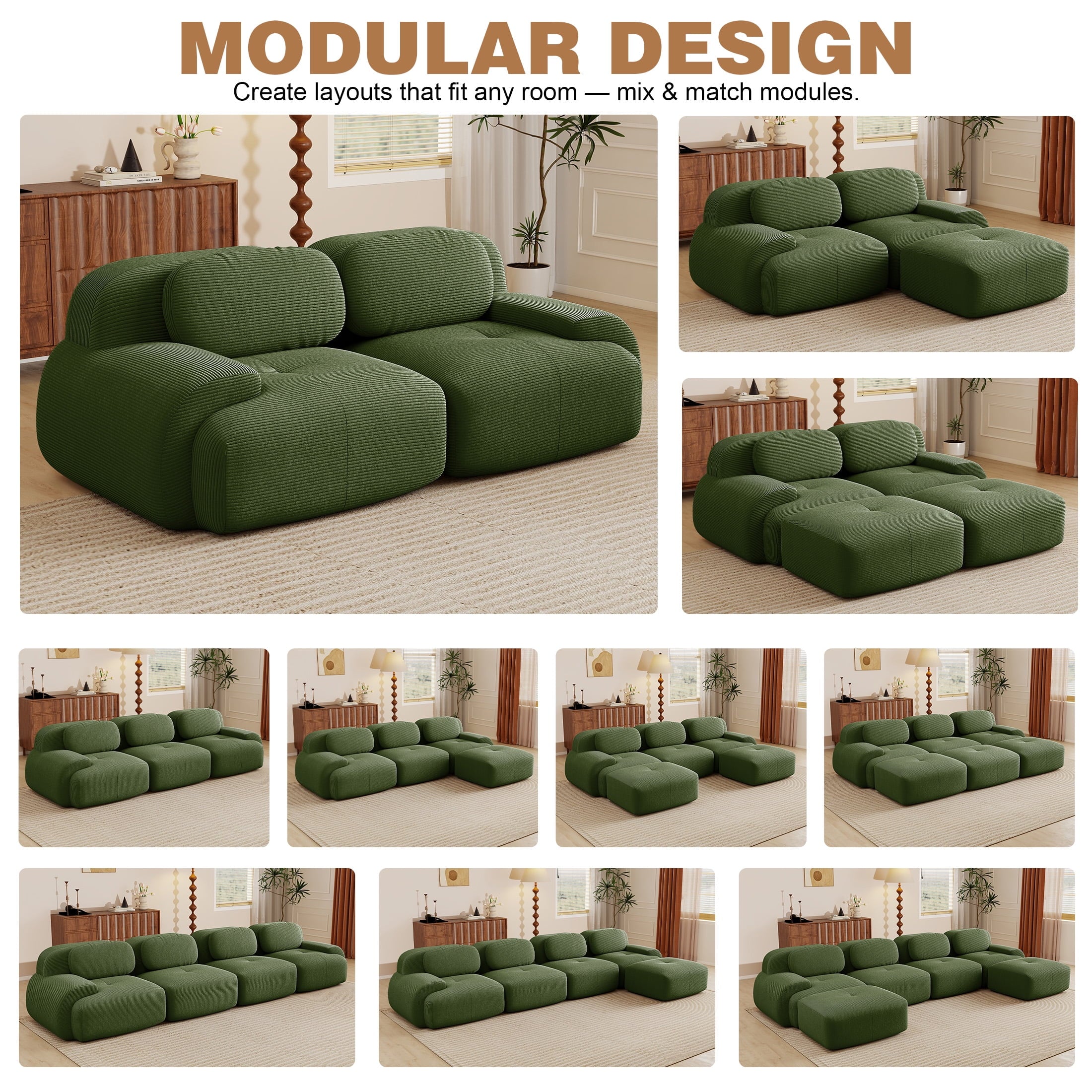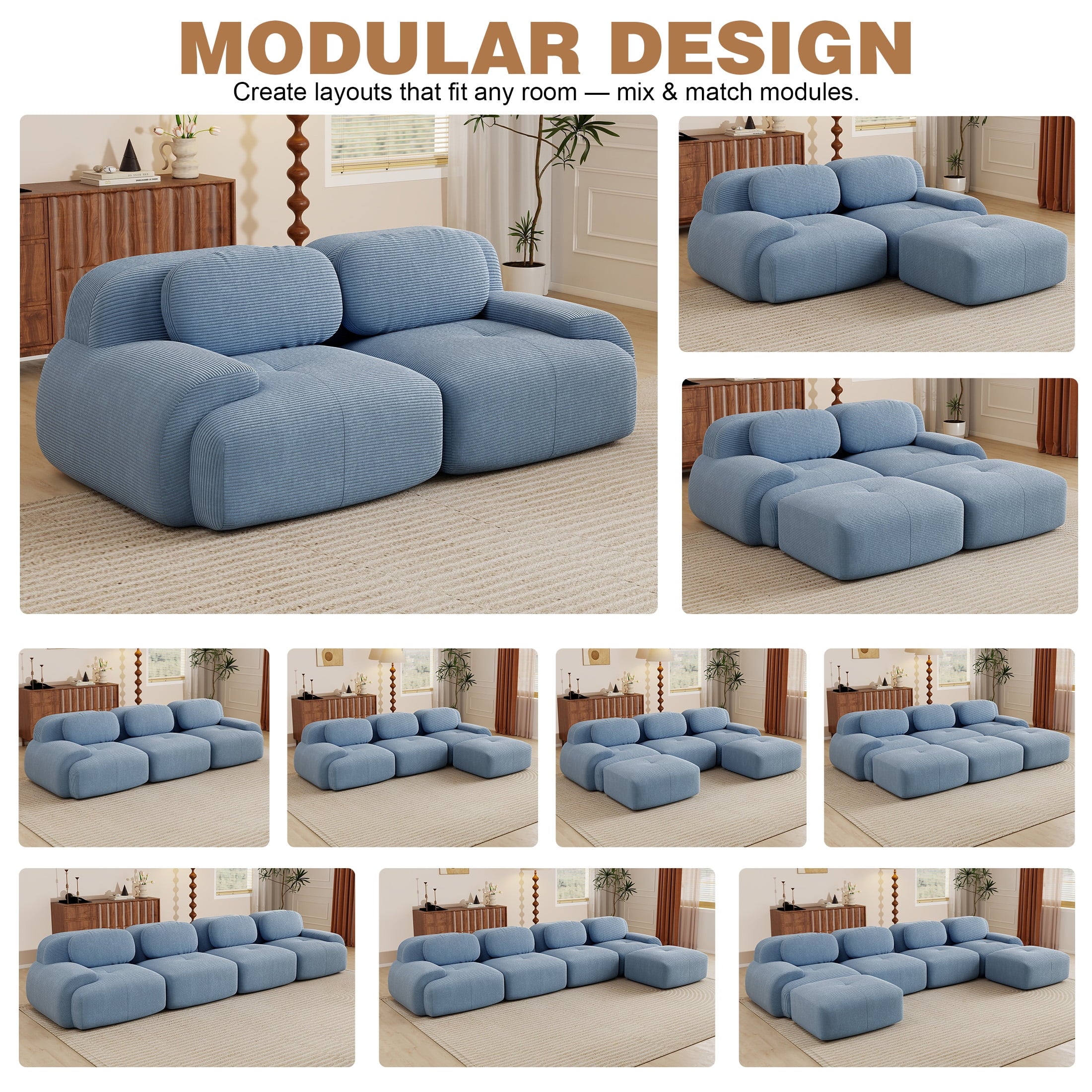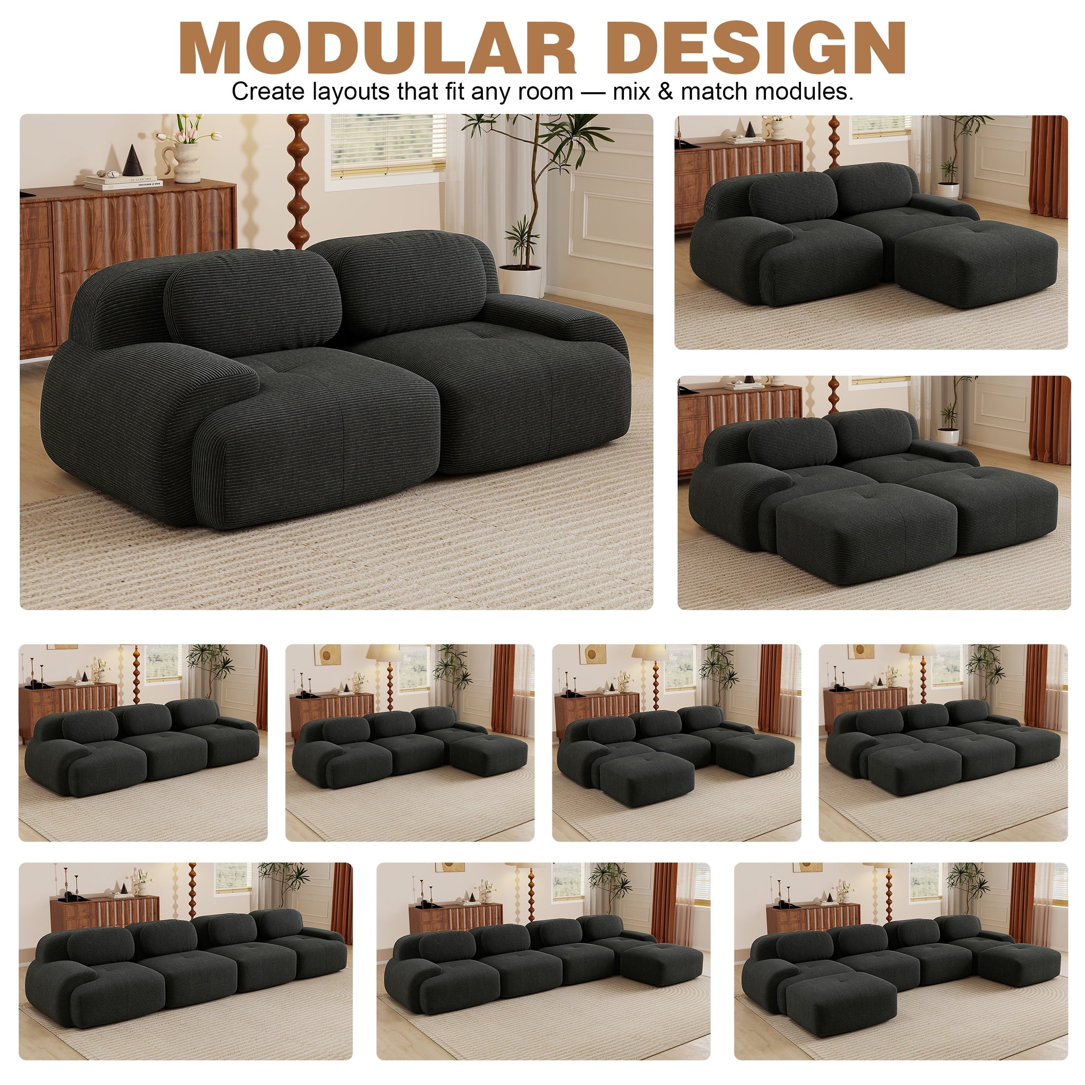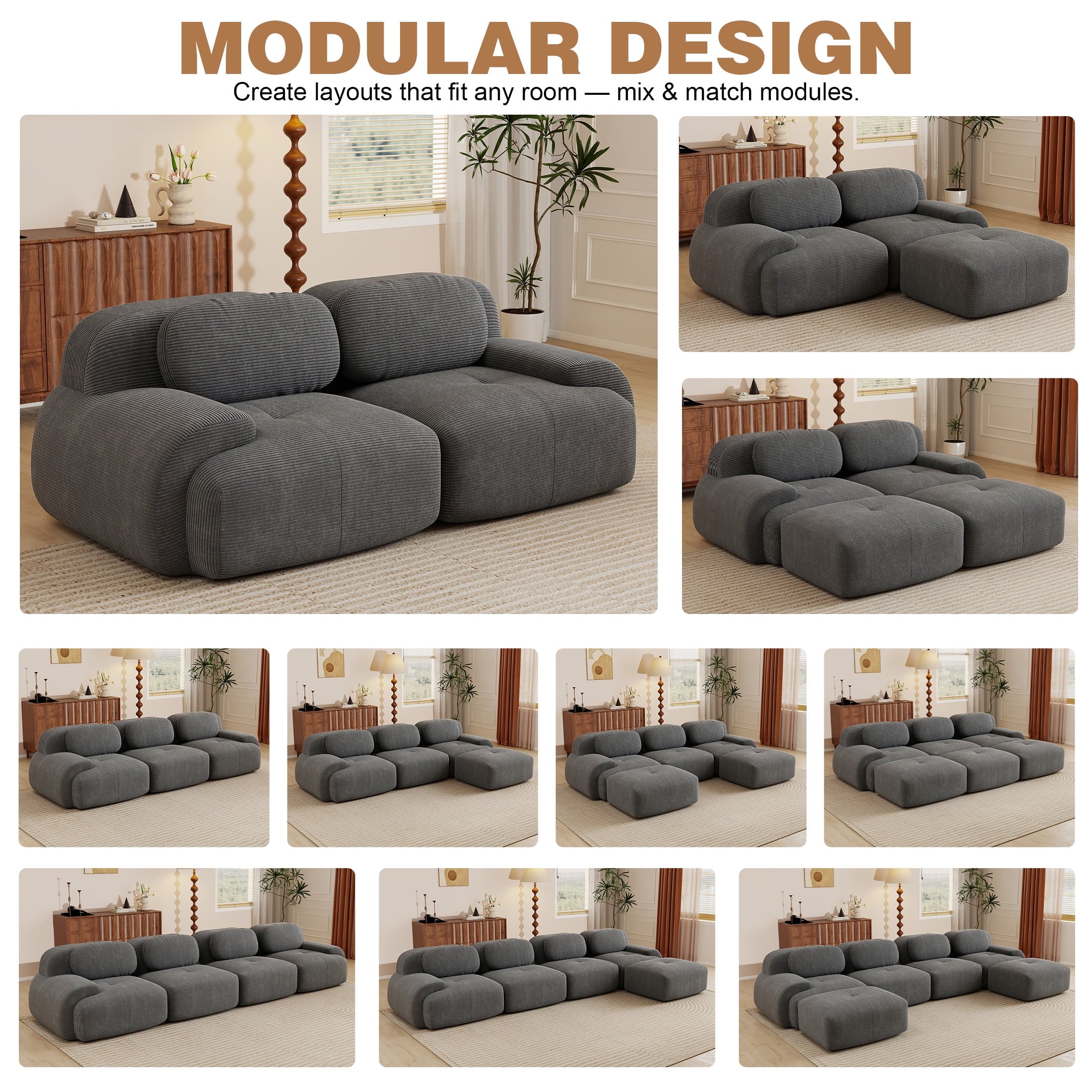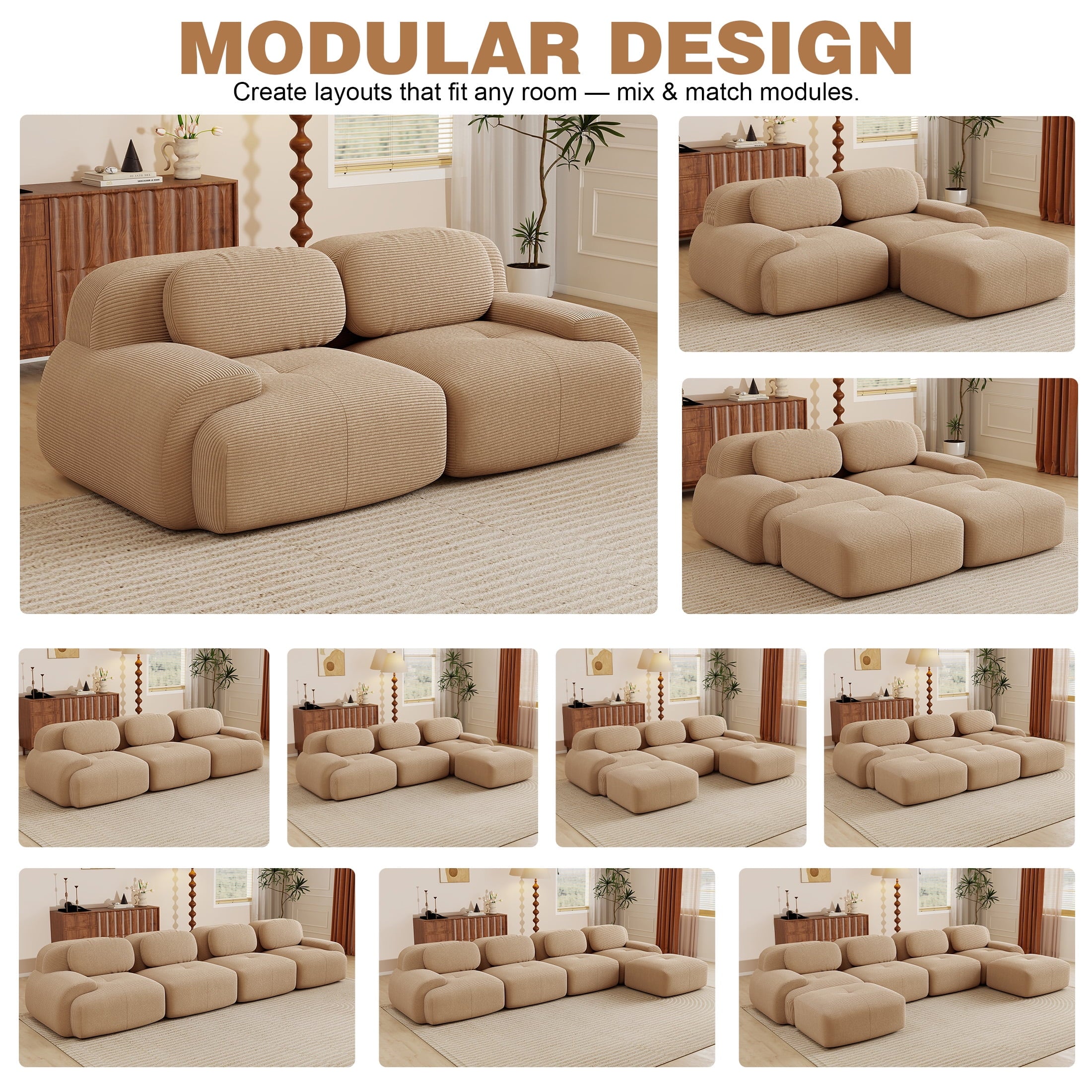 Create the living room of your dreams with the Aukfa innovative modular sectional sofa set! This premium corduroy couch system adapts to your needs: start with a 2-seat loveseat and ottoman, and easily expand to 3-seat, 4-seat, 5-seat, or 6-seat configurations with one or two additional ottomans. You can rearrange the pieces endlessly to suit your space. Featuring luxuriously soft premium corduroy fabric (pet-friendly, anti-scratch, and easy-clean) and 32D high-resilience foam that contours to your spine for all-day comfort. Why choose this sofa? It combines durable pet-proof fabric, ergonomic support (28″ seat depth, 17.3″ height), and hassle-free assembly—ready to use straight out of the box!
