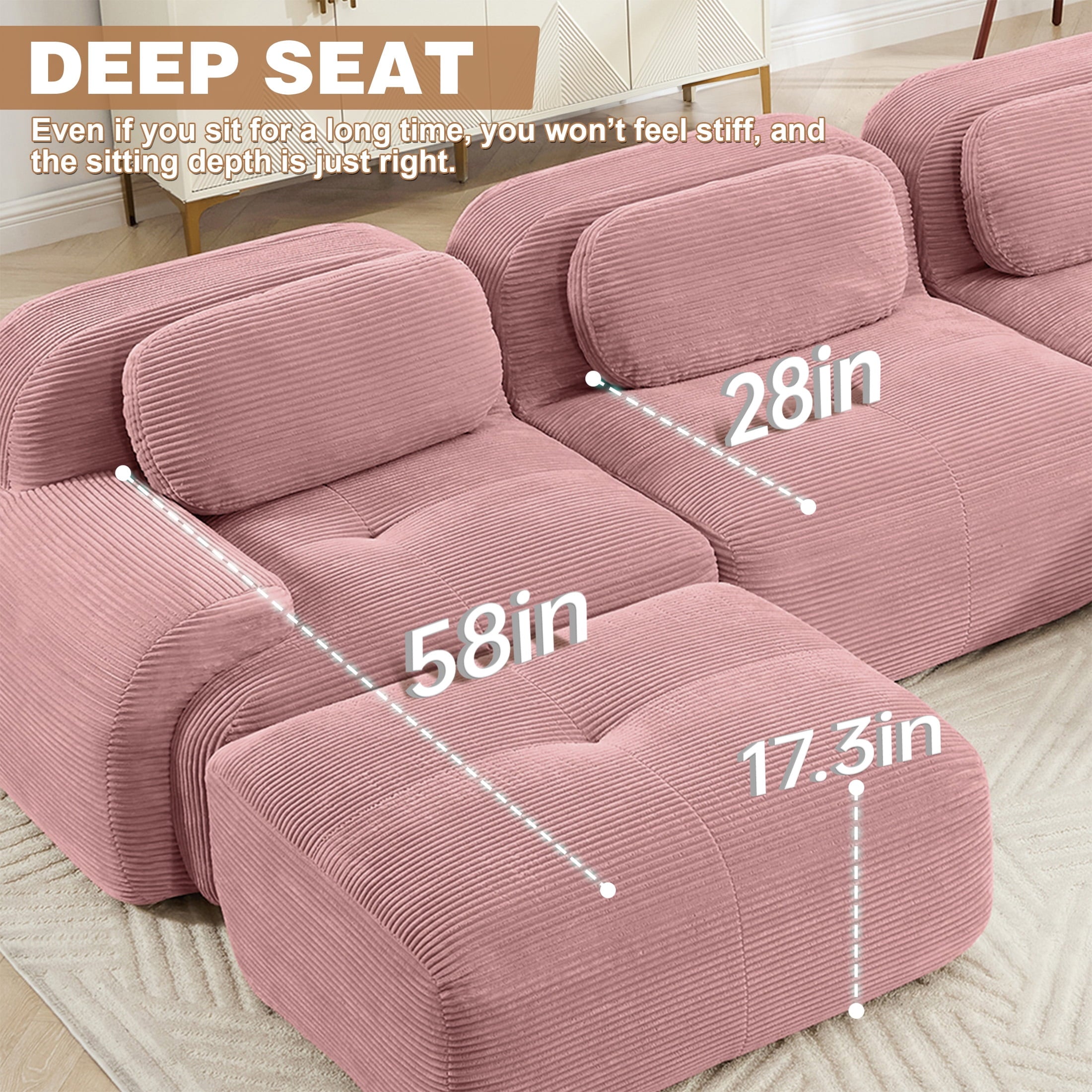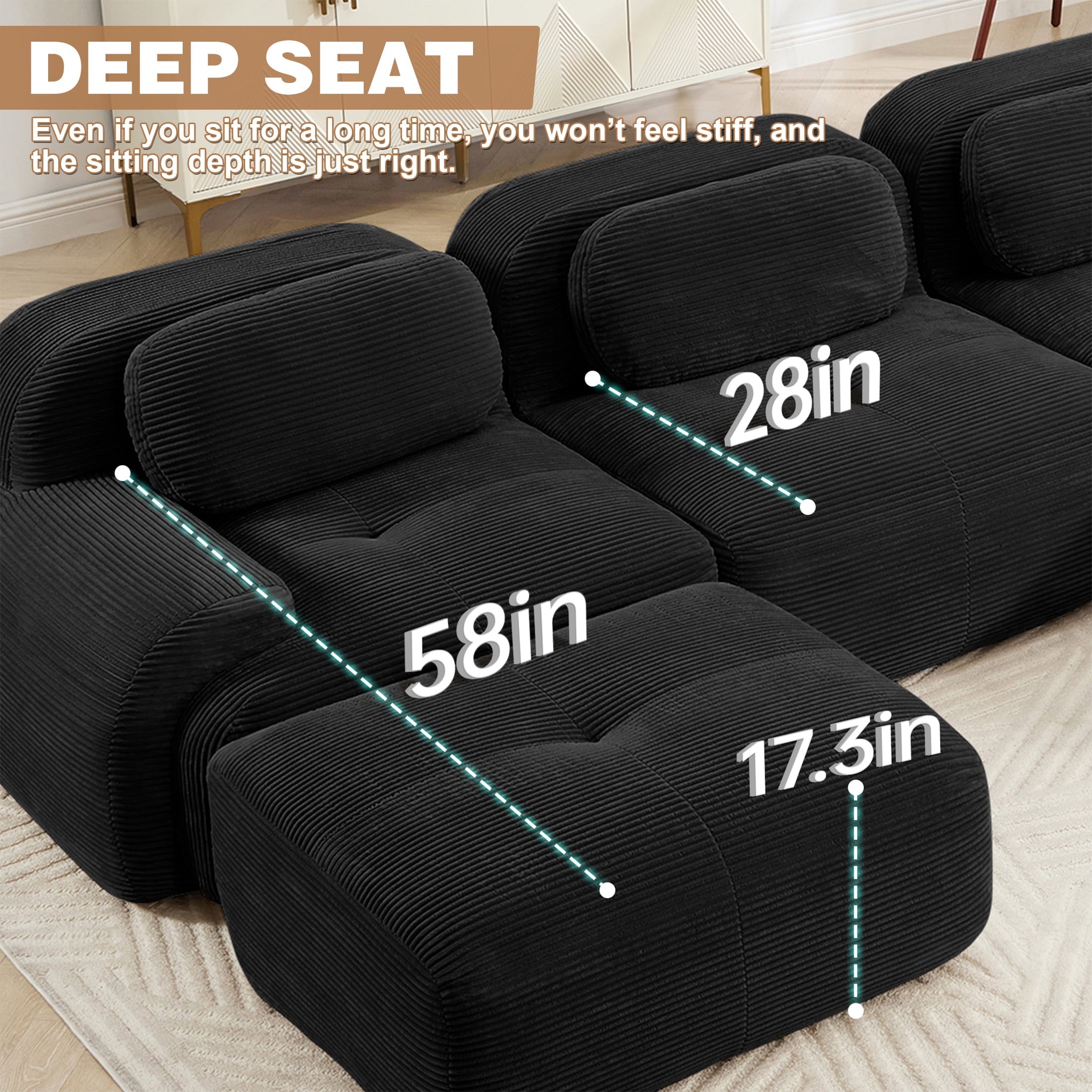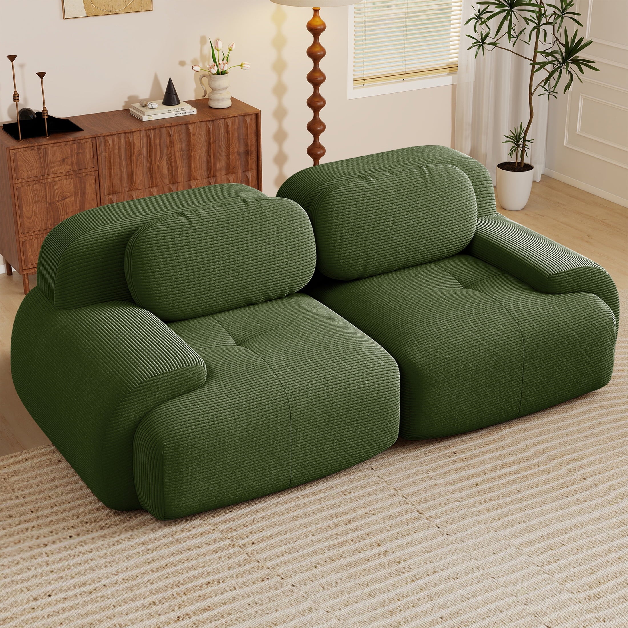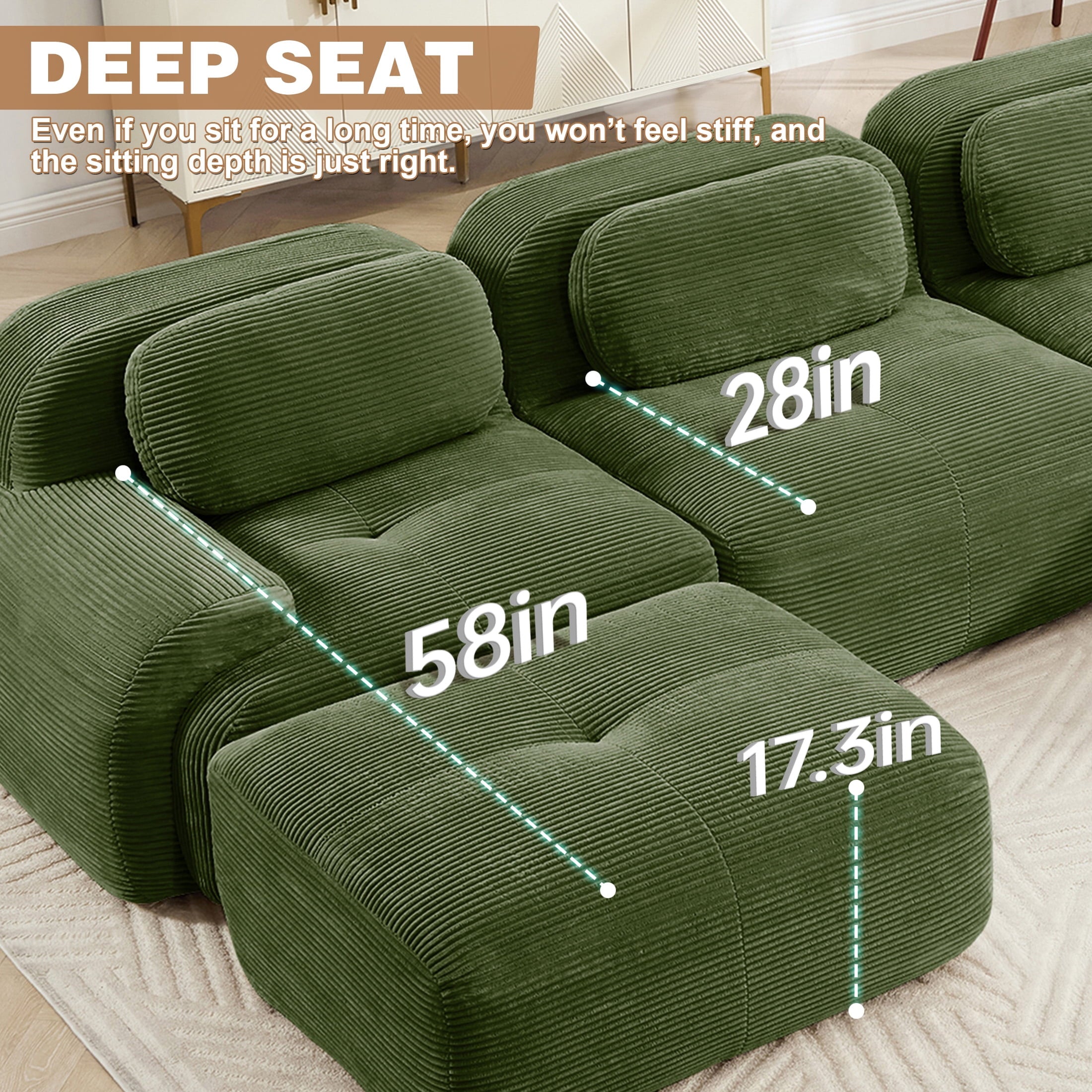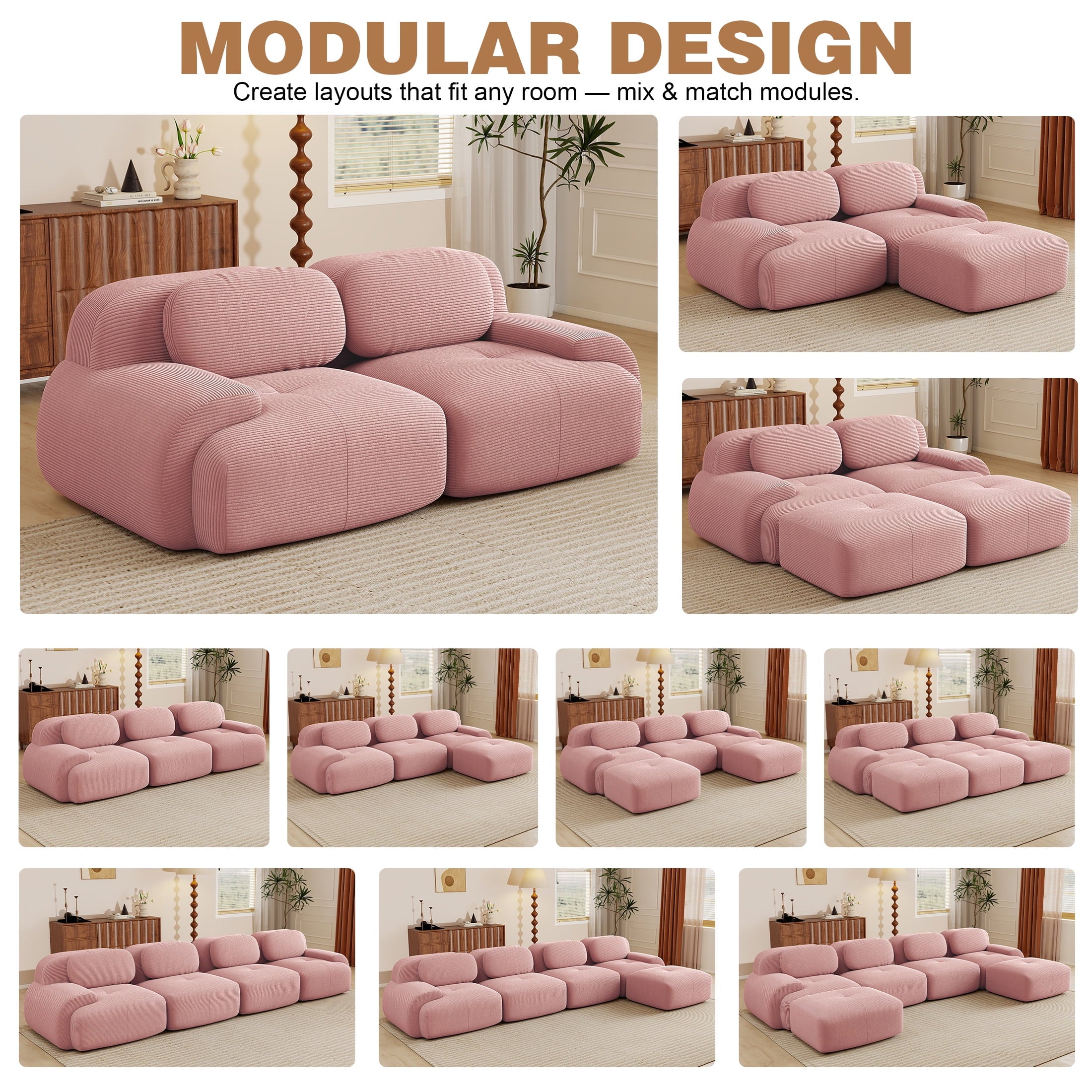 Create the living room of your dreams with the Aukfa innovative modular sectional sofa set! This premium corduroy couch system adapts to your needs: start with a 2-seat loveseat and ottoman, and easily expand to 3-seat, 4-seat, 5-seat, or 6-seat configurations with one or two additional ottomans. You can rearrange the pieces endlessly to suit your space. Featuring luxuriously soft premium corduroy fabric (pet-friendly, anti-scratch, and easy-clean) and 32D high-resilience foam that contours to your spine for all-day comfort. Why choose this sofa? It combines durable pet-proof fabric, ergonomic support (28″ seat depth, 17.3″ height), and hassle-free assembly—ready to use straight out of the box!