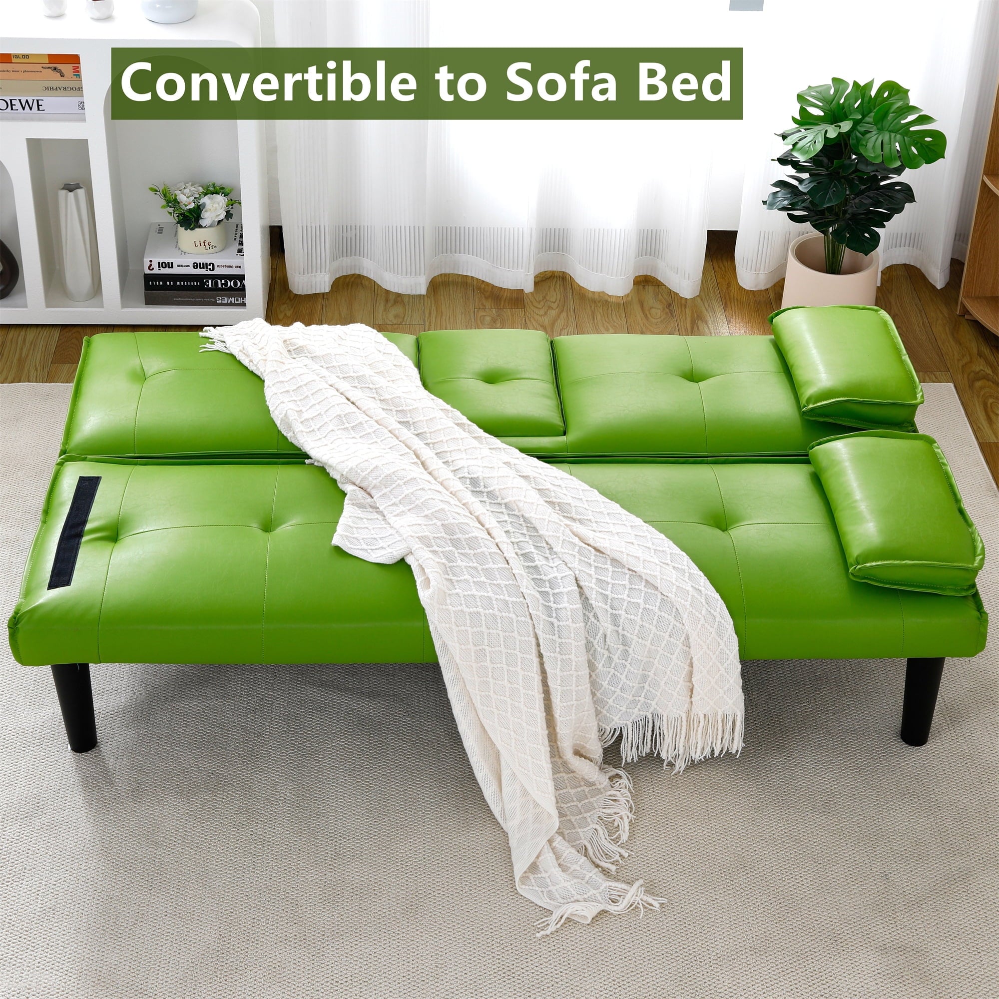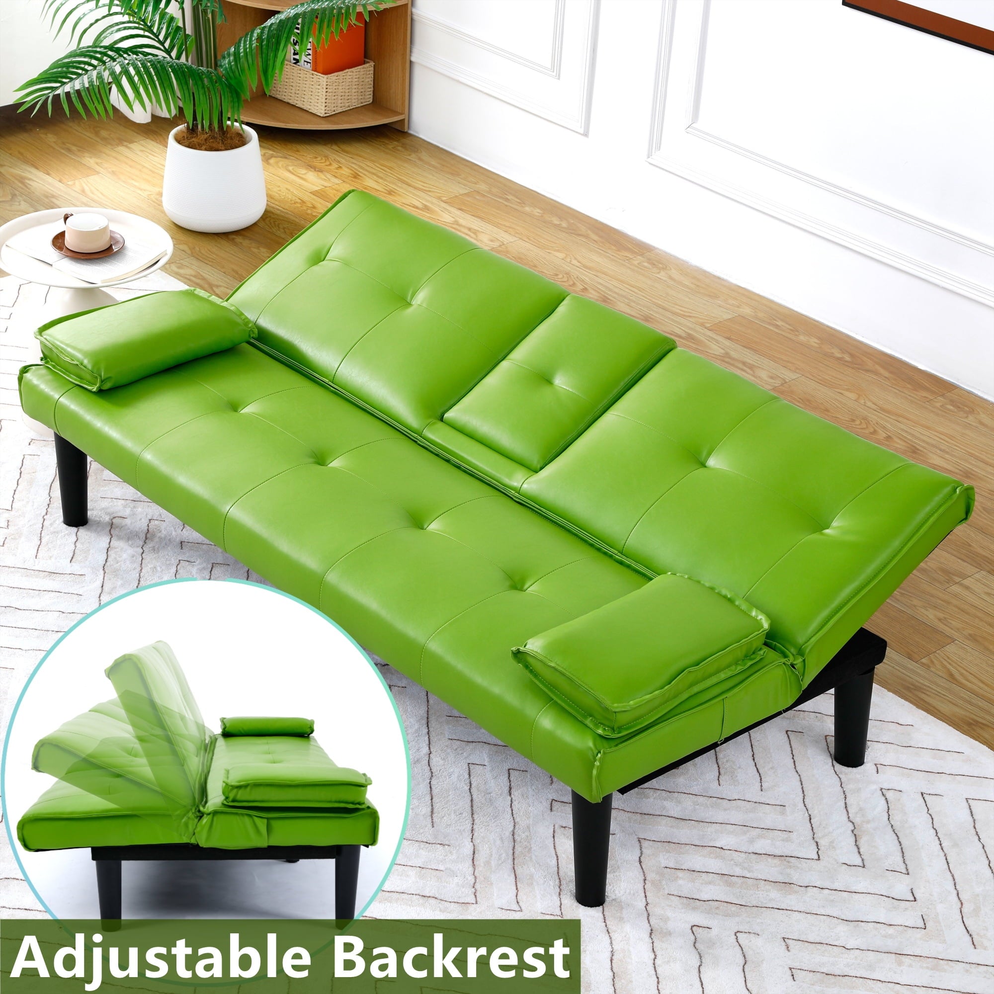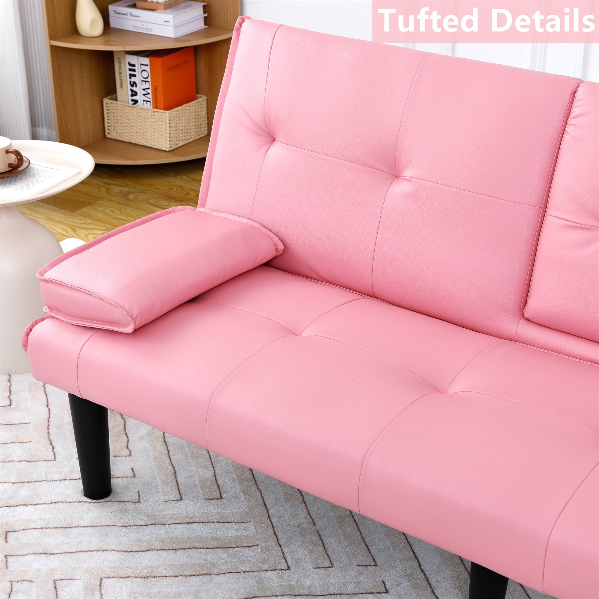 - COMFY MATERIAL – The eye-catching solid-hued faux leather fabric highlights the charming face of this sofa, with an excellent touch and high-quality foam cushions. The tufted back enhances the design, and the armrest can be removed and placed on the other side when sleeping.