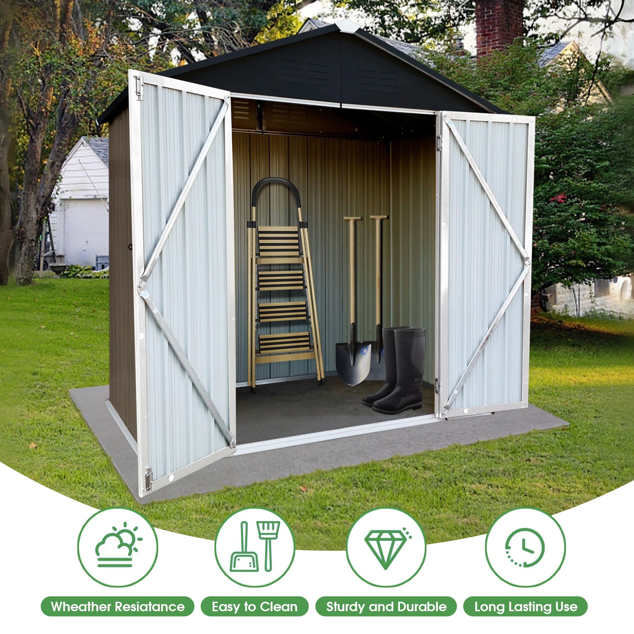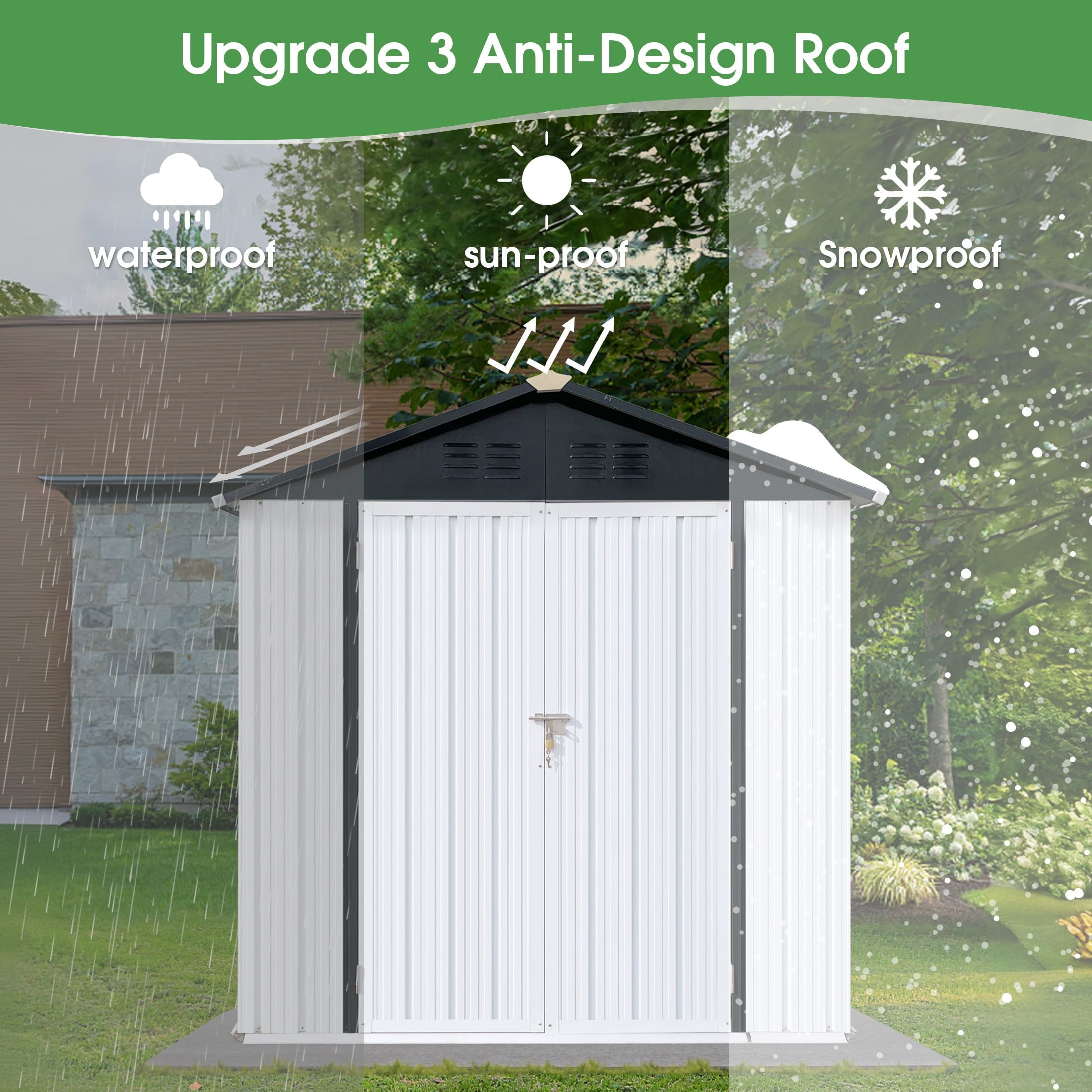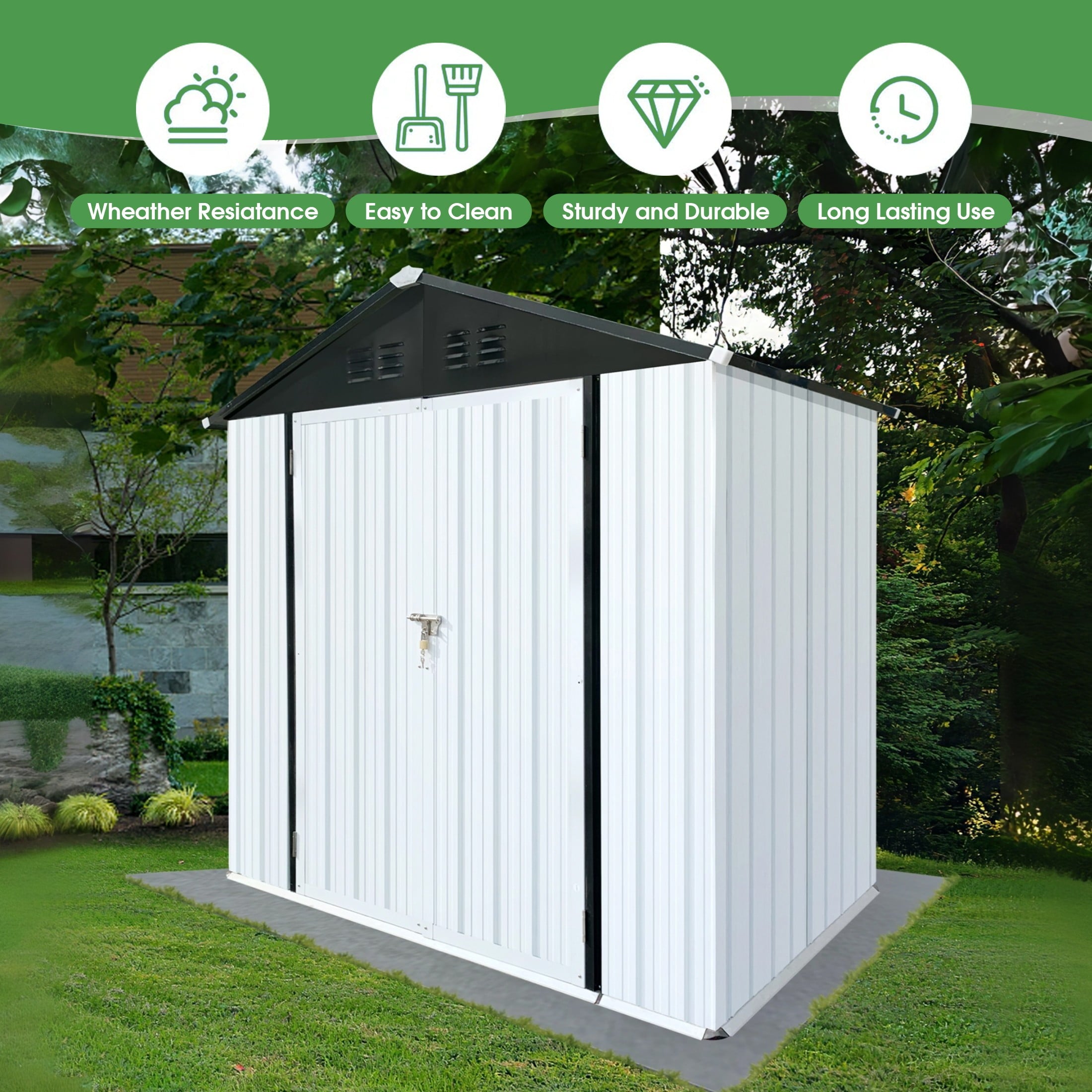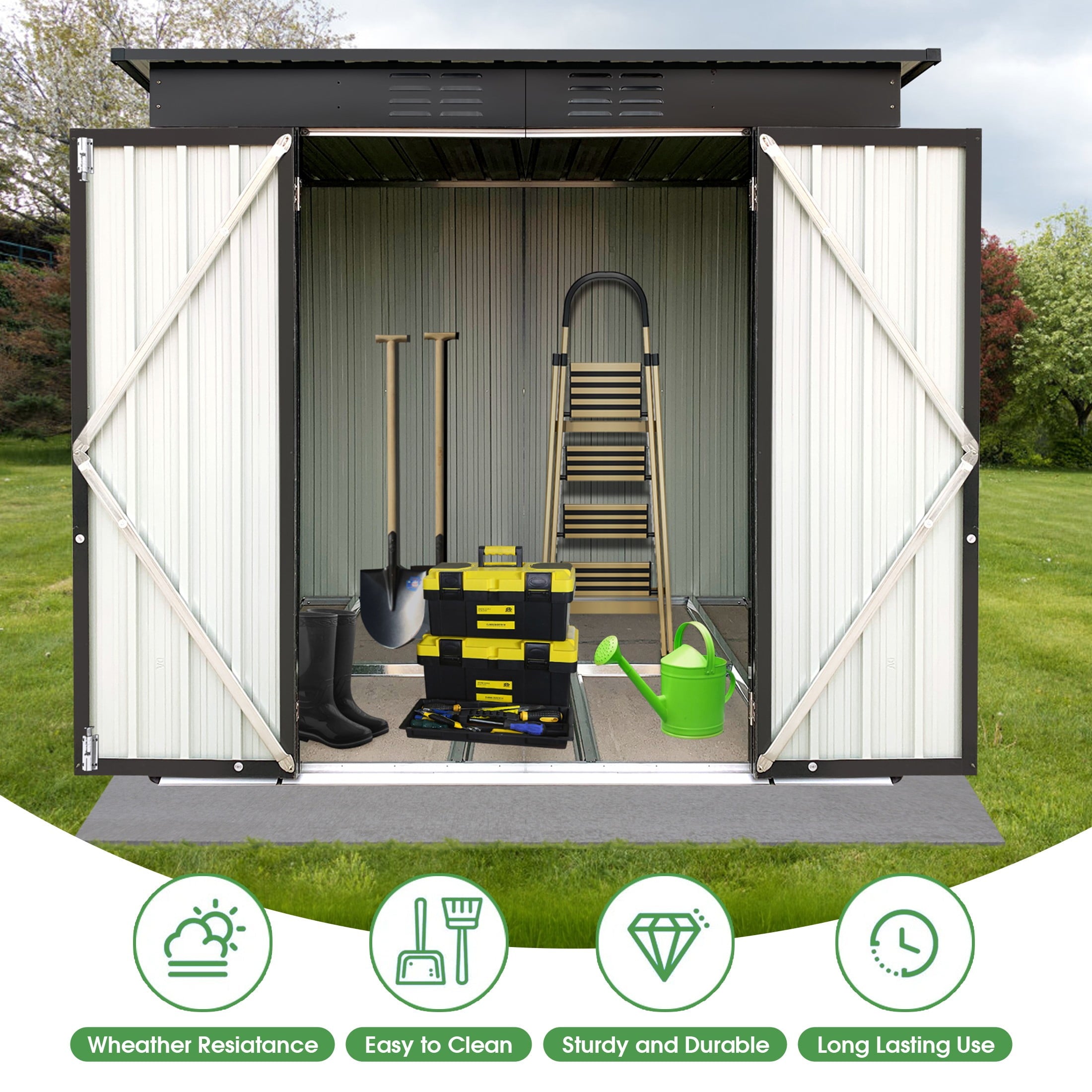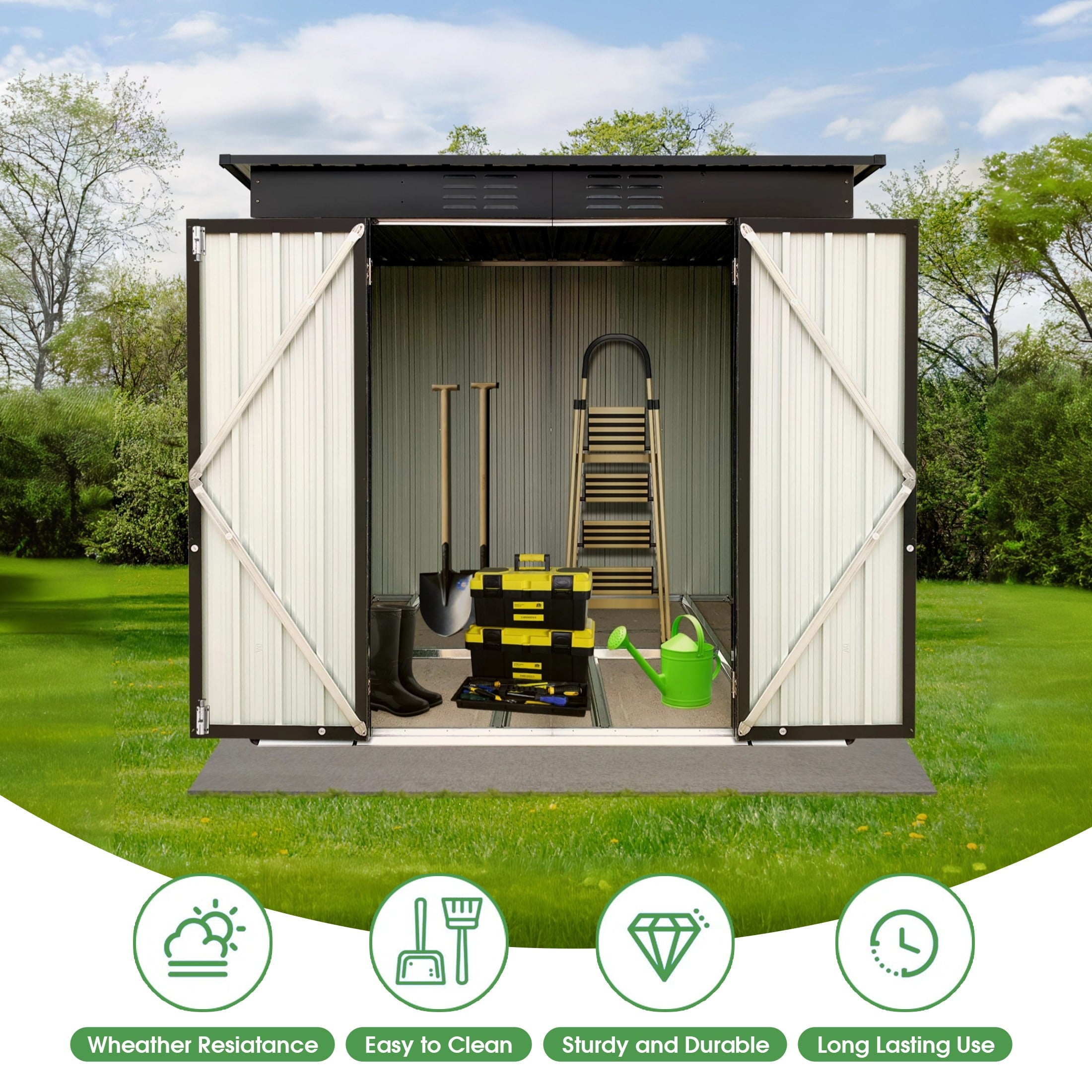 DURABLE AND WEATHER-RESISTANT – Unlike many sheds with plastic vents, this model features two integrated punched vents designed to resist sunlight degradation, ensuring optimal airflow. The galvanized steel panels are coated with an eco-friendly paint that can withstand harsh weather conditions for over 10 years, keeping your belongings safe and dry year-round.