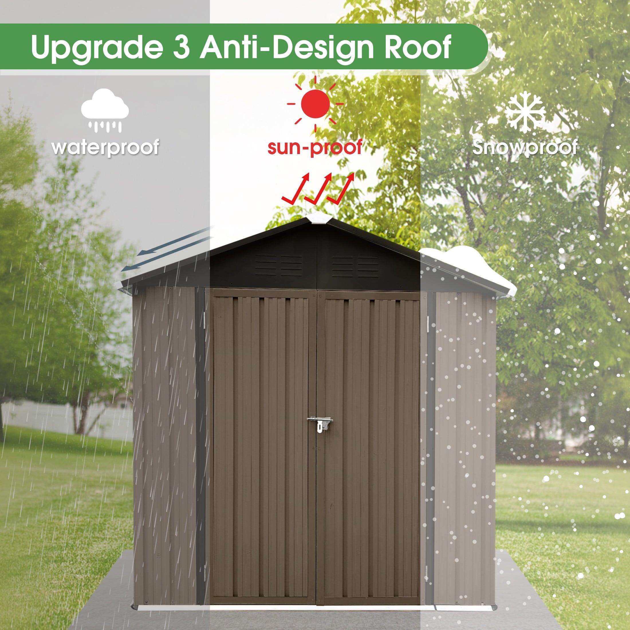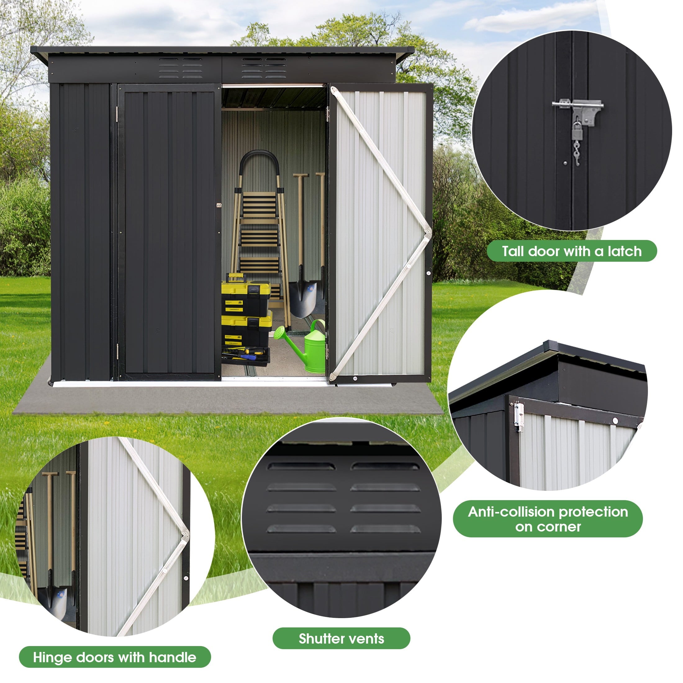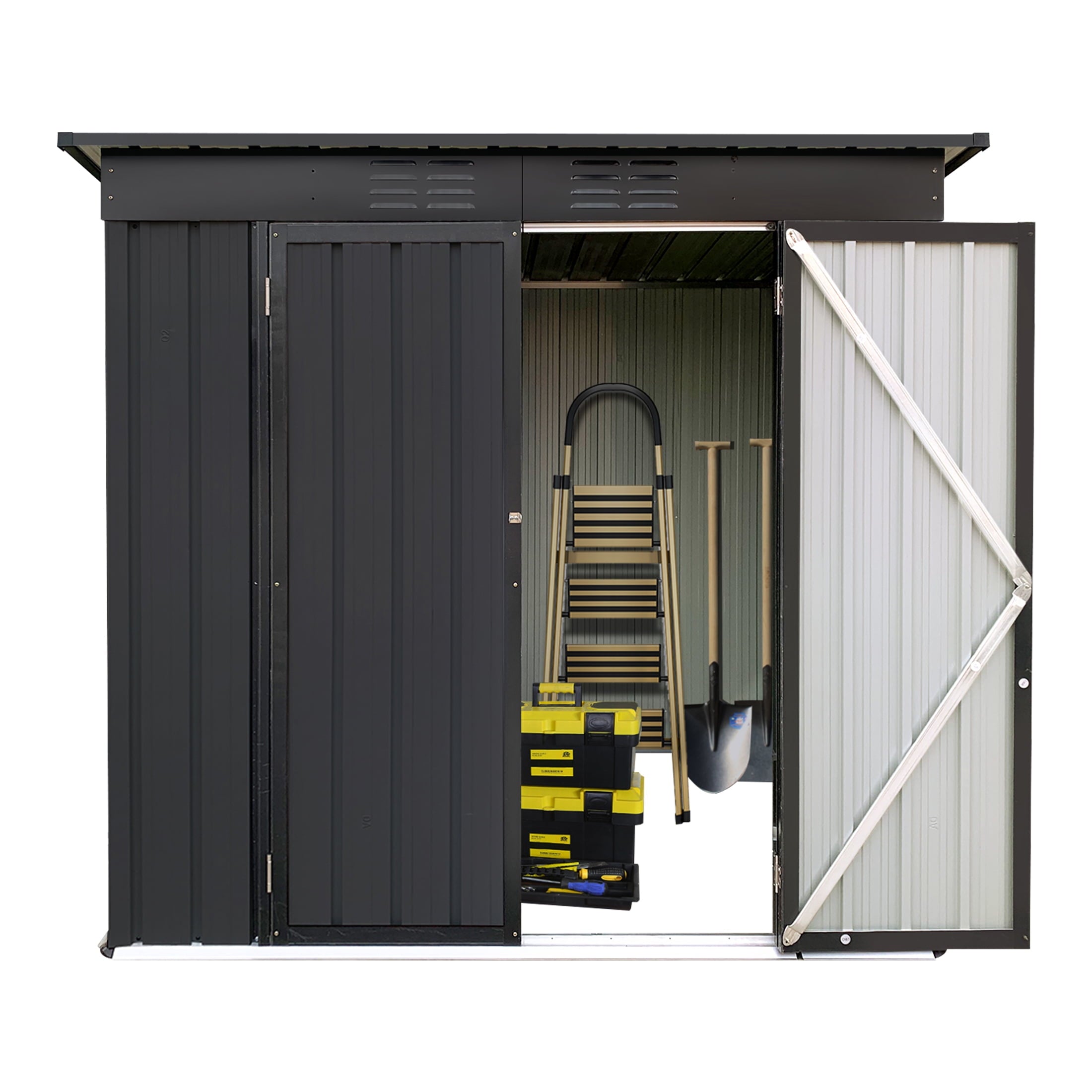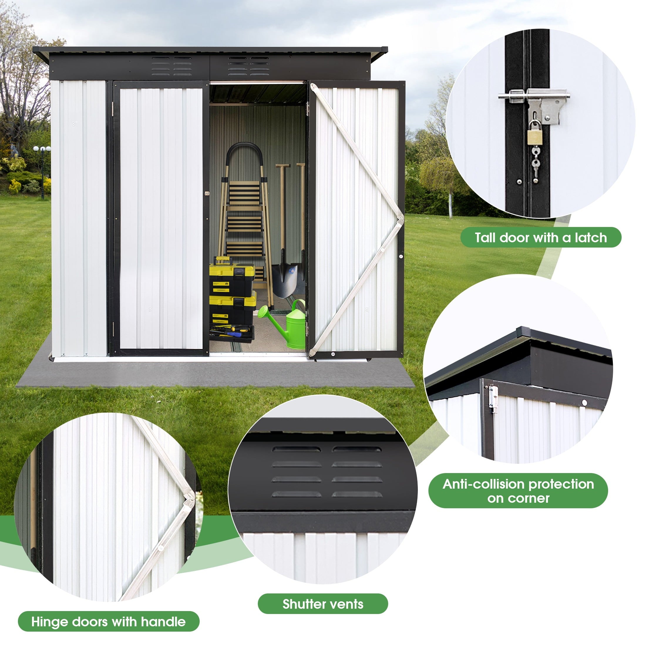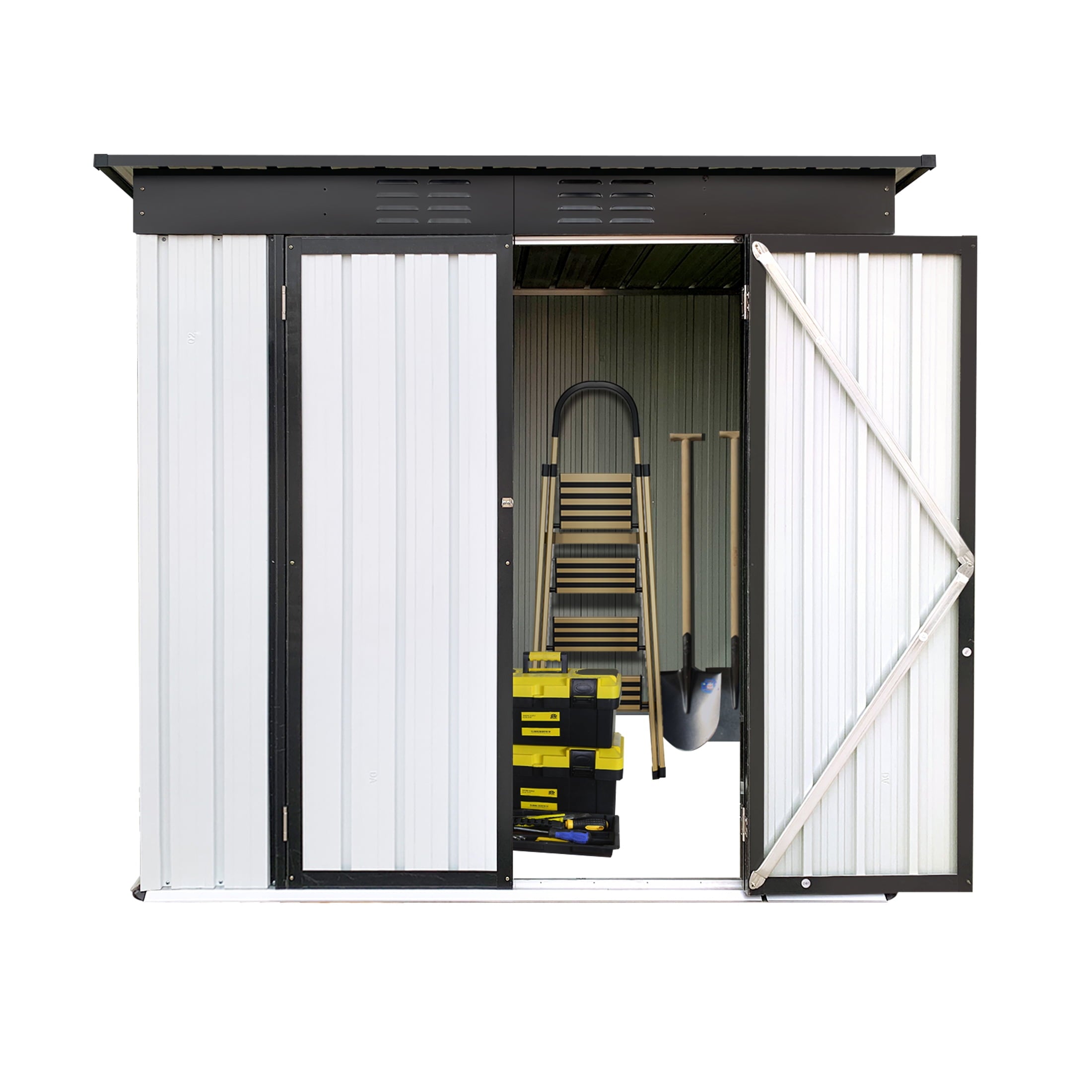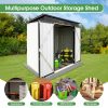 DURABLE AND WEATHER-RESISTANT – Unlike many sheds with plastic vents, this model features two integrated punched vents designed to resist sunlight degradation, ensuring optimal airflow. The galvanized steel panels are coated with an eco-friendly paint that can withstand harsh weather conditions for over 10 years, keeping your belongings safe and dry year-round.