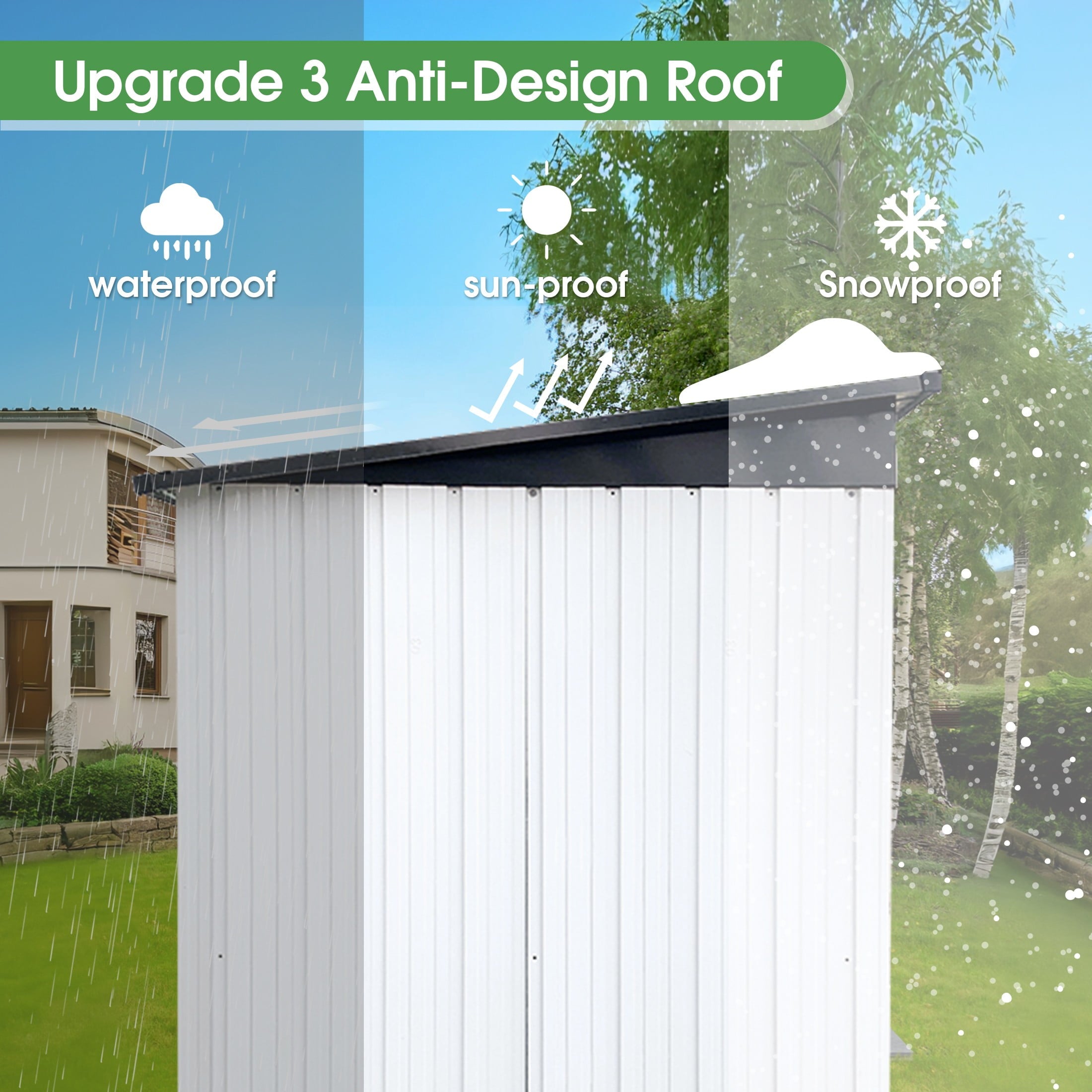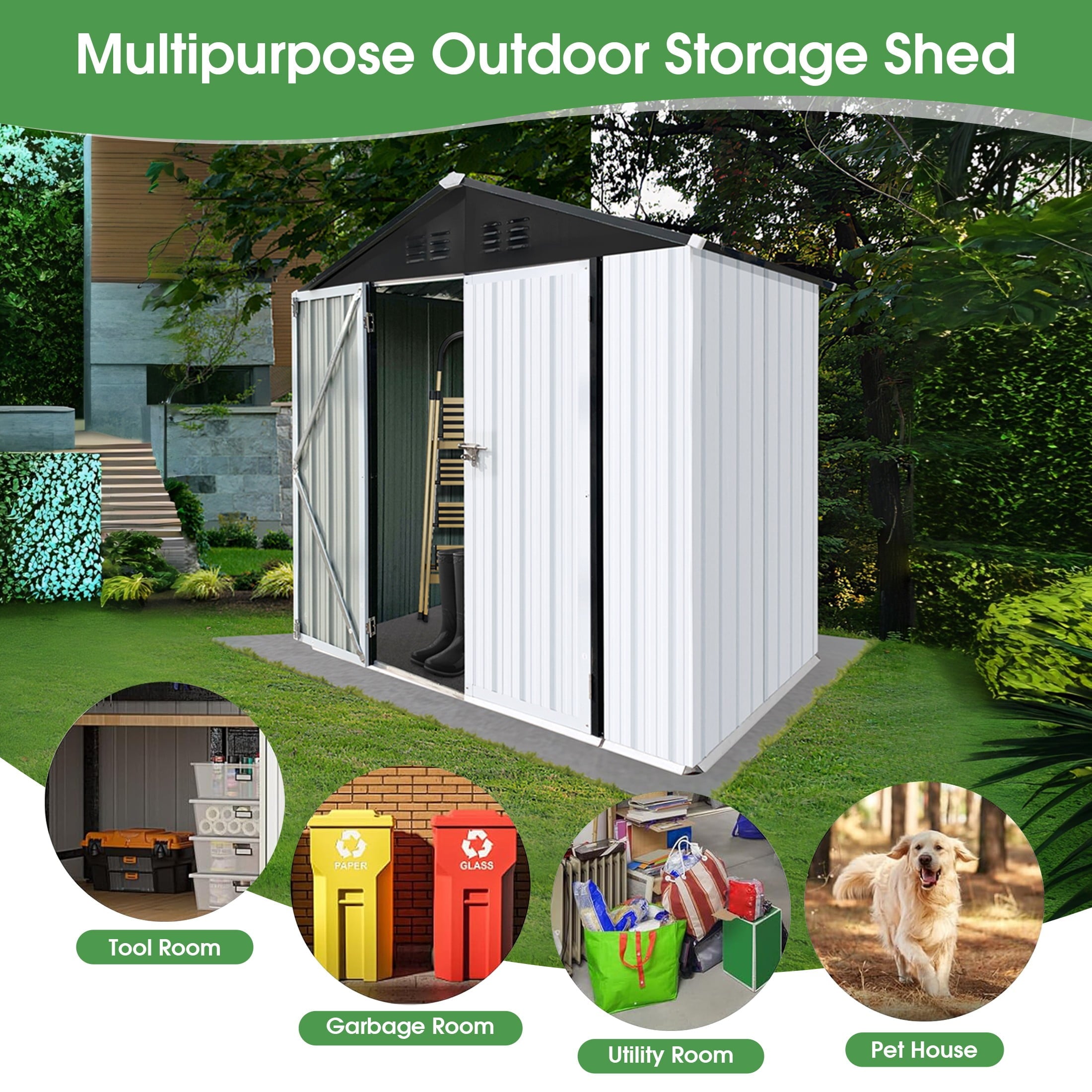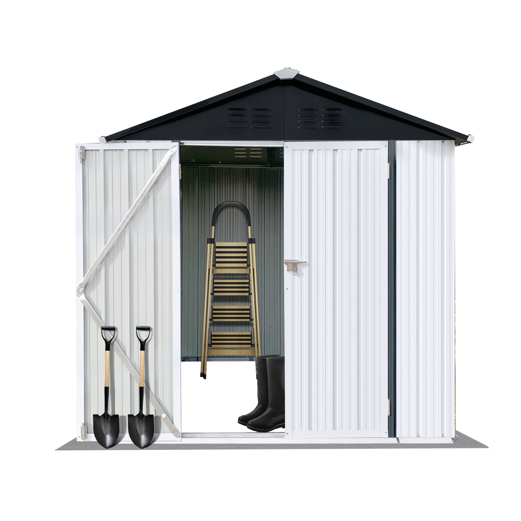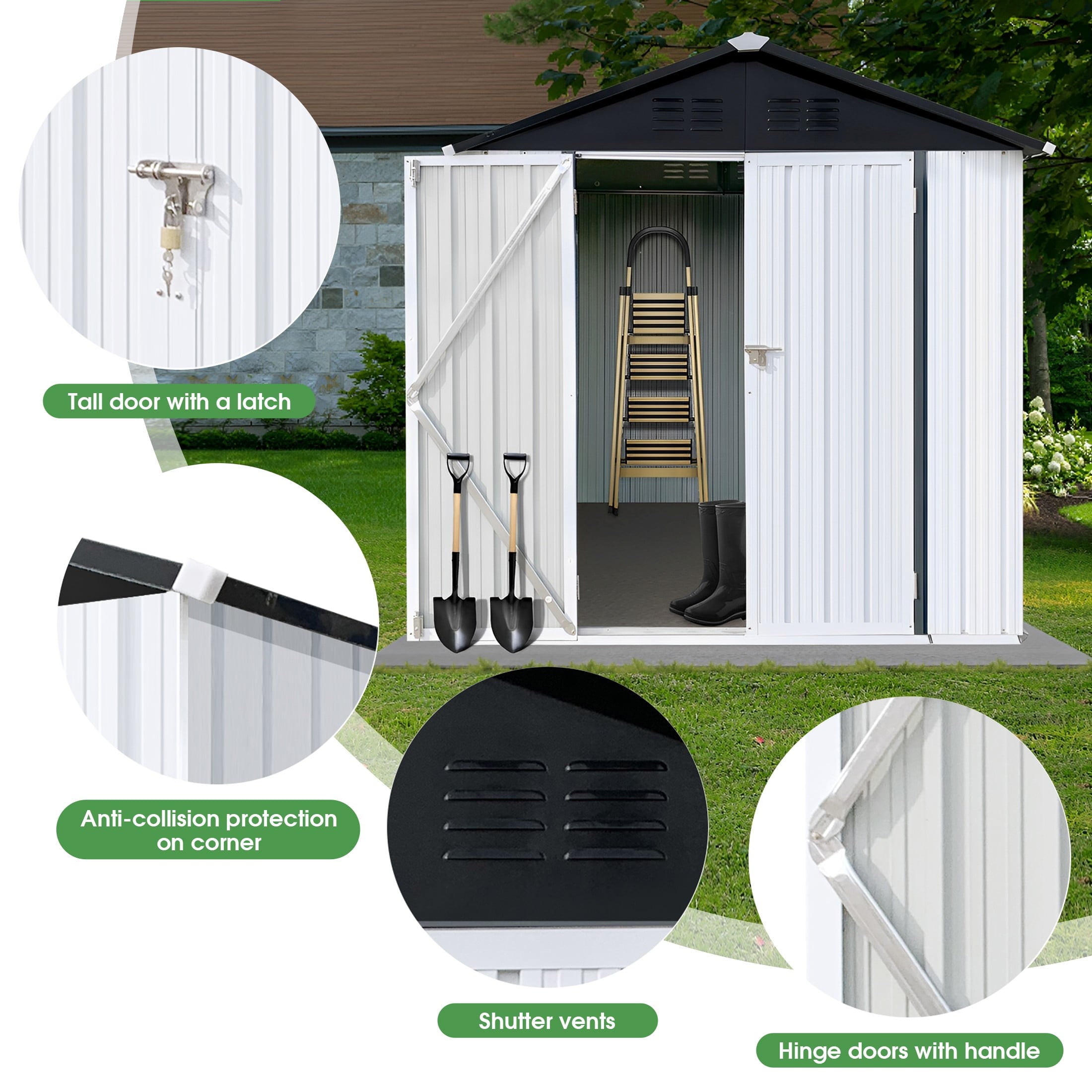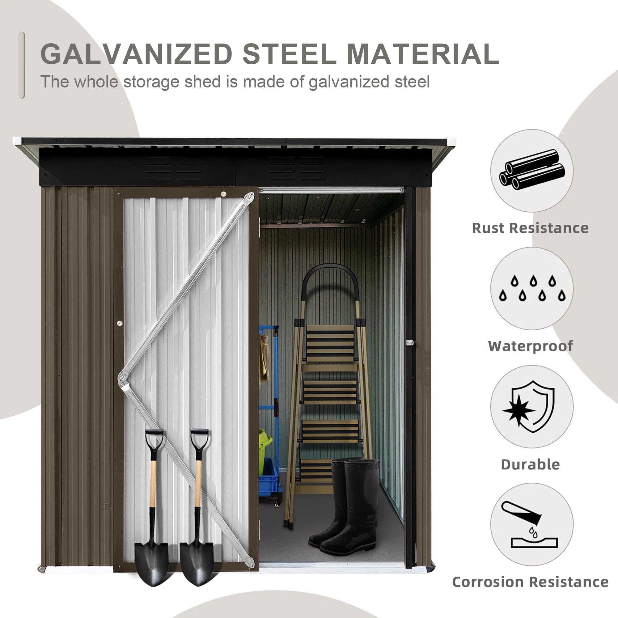 DURABLE AND WEATHER-RESISTANT – Unlike many sheds with plastic vents, this model features two integrated punched vents designed to resist sunlight degradation, ensuring optimal airflow. The galvanized steel panels are coated with an eco-friendly paint that can withstand harsh weather conditions for over 10 years, keeping your belongings safe and dry year-round.