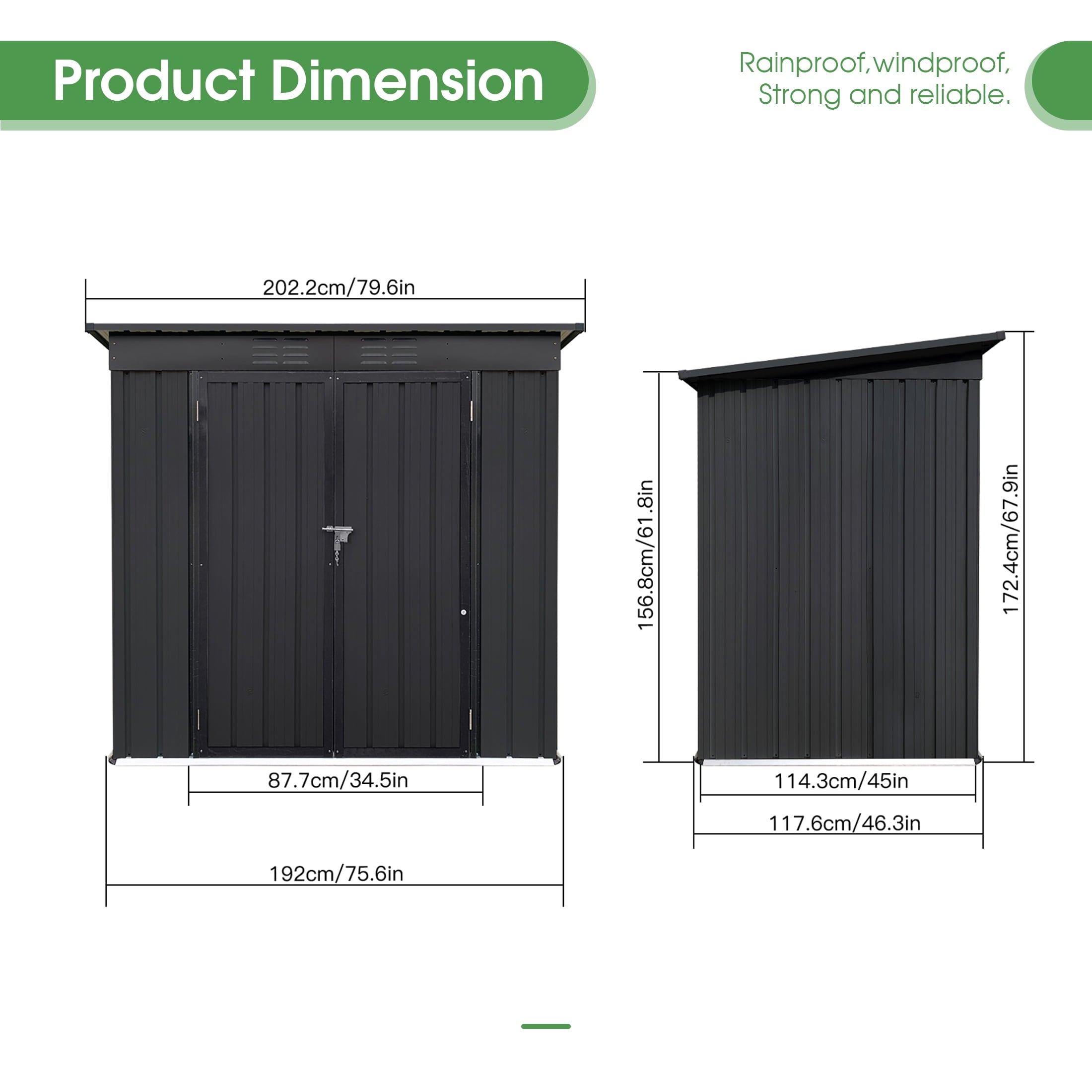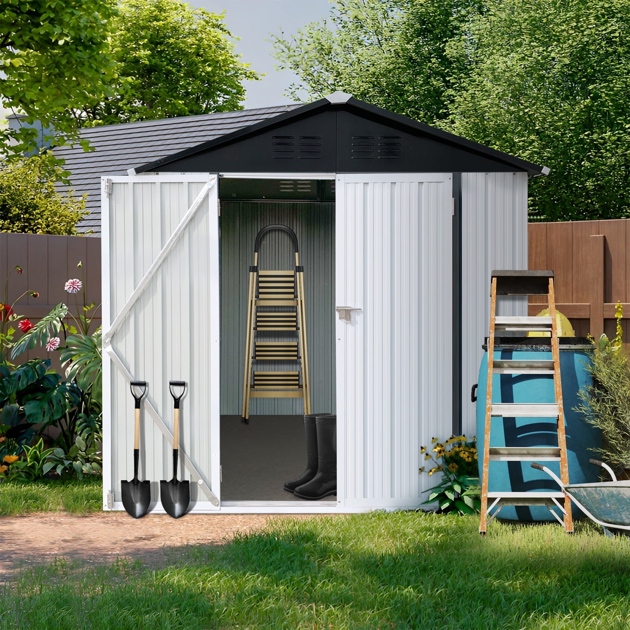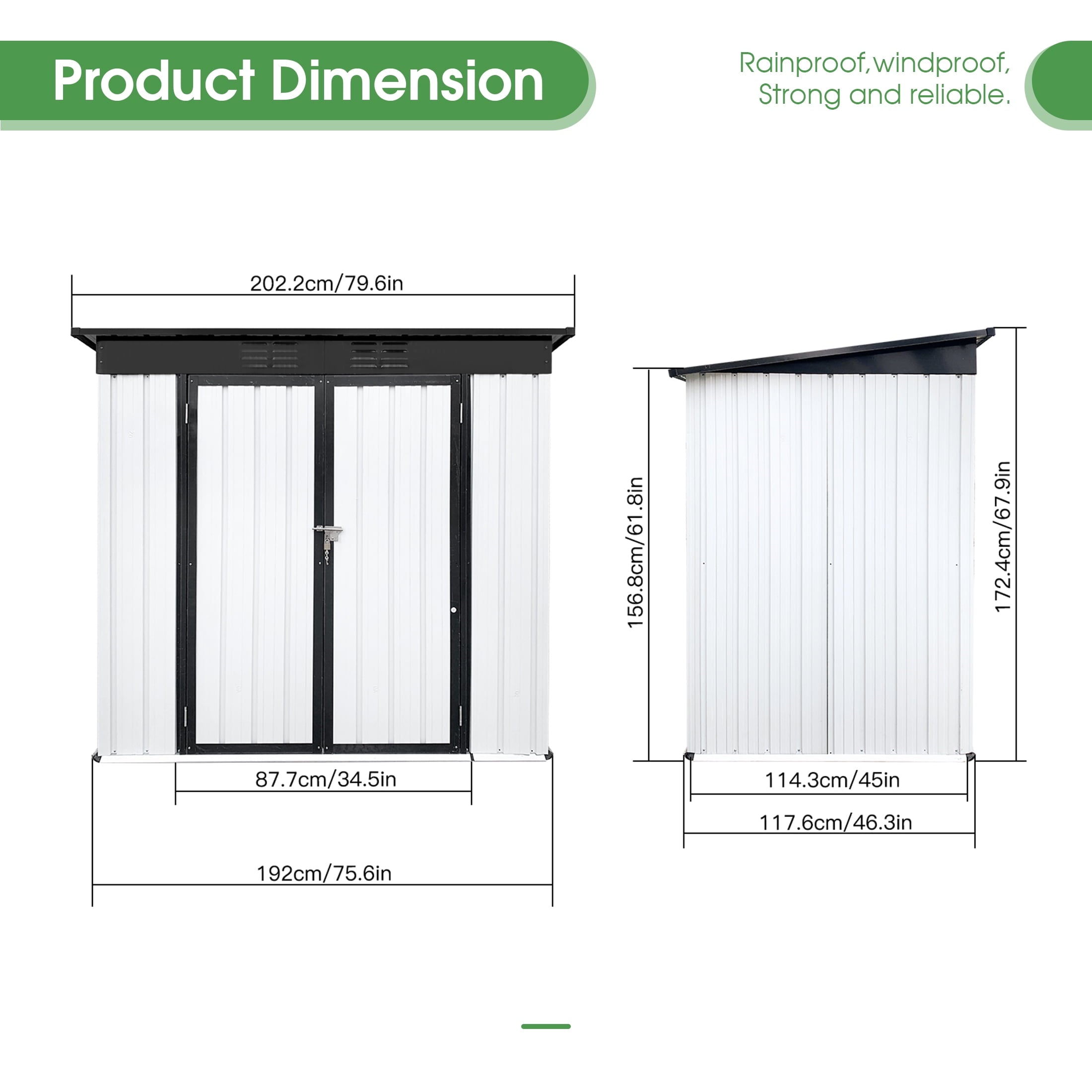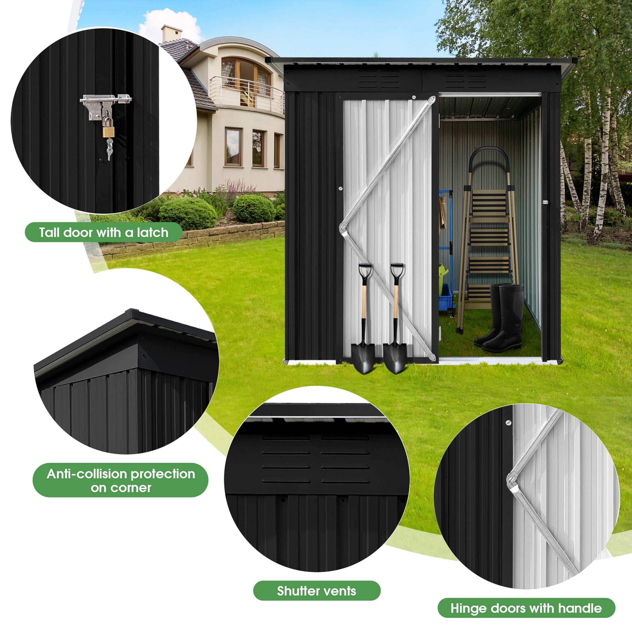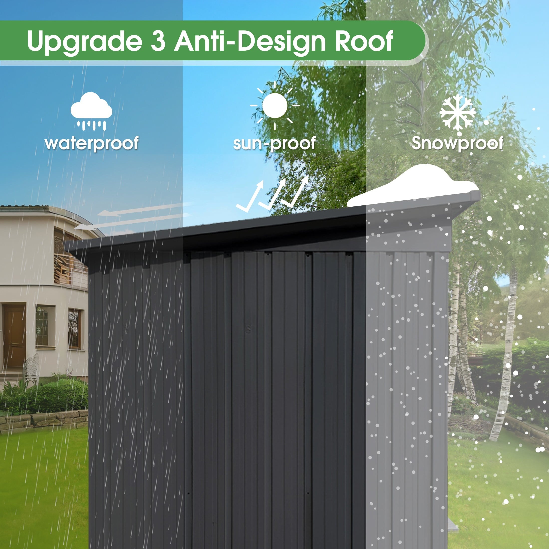 DURABLE AND WEATHER-RESISTANT – Unlike many sheds with plastic vents, this model features two integrated punched vents designed to resist sunlight degradation, ensuring optimal airflow. The galvanized steel panels are coated with an eco-friendly paint that can withstand harsh weather conditions for over 10 years, keeping your belongings safe and dry year-round.